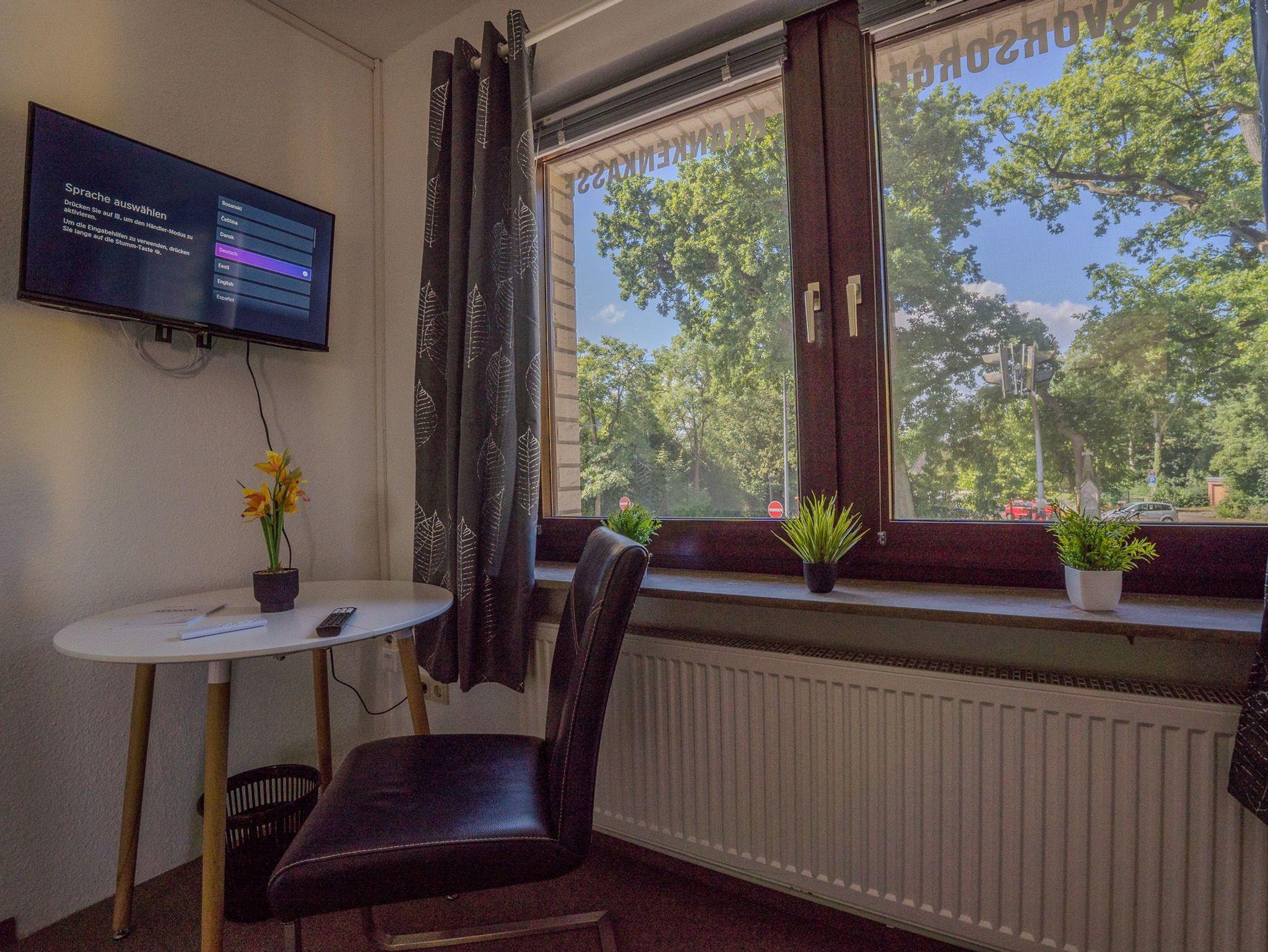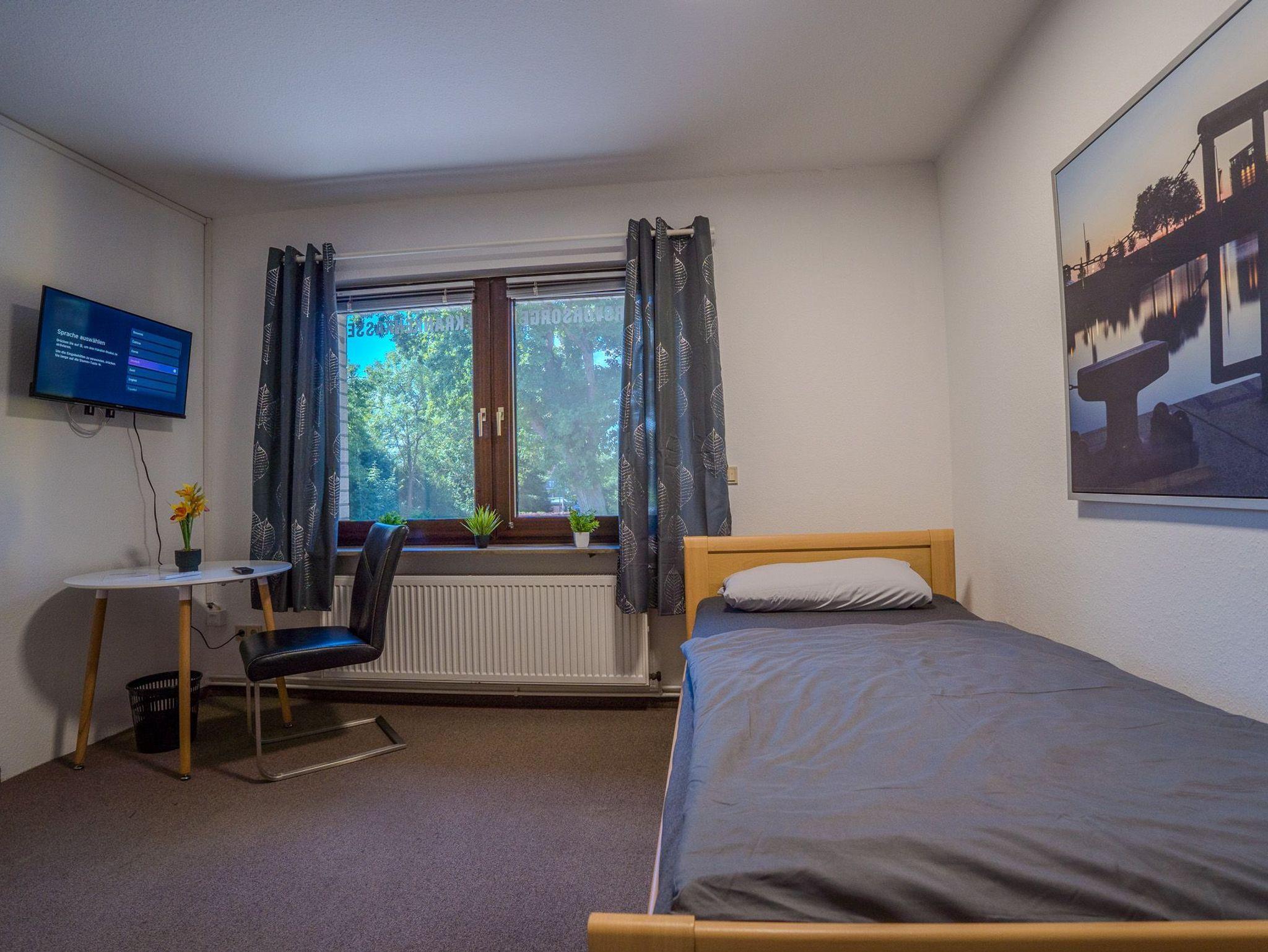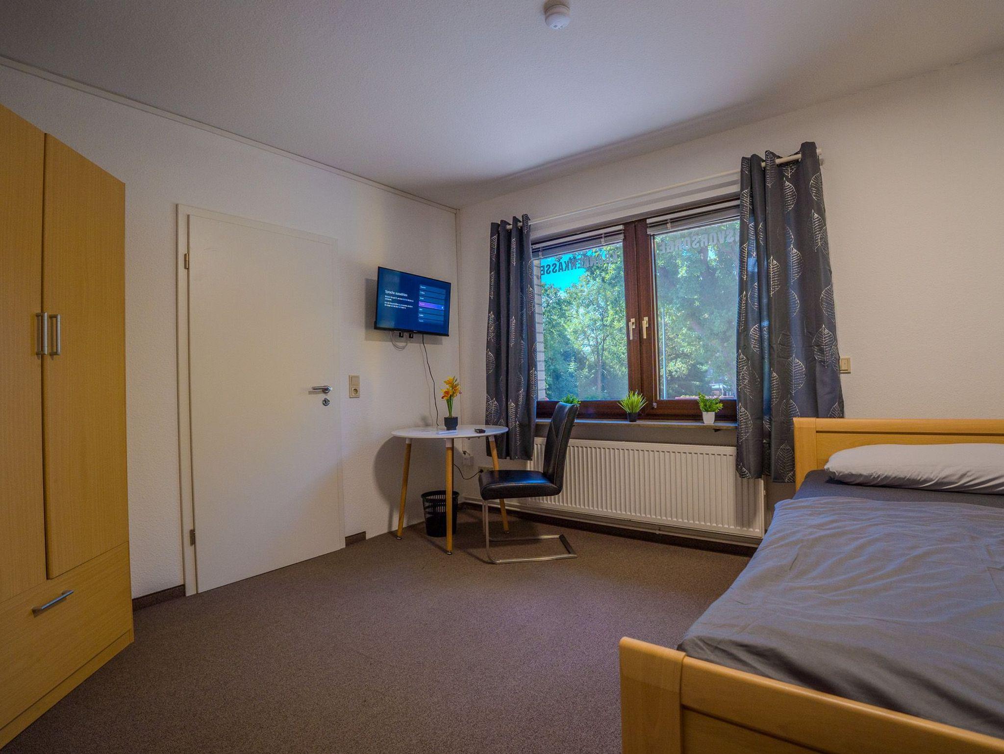 Jedes Zimmer verfügt über einen Fernseher, einen Tisch mit Stuhl und ein bequemes Bett. Bettwäsche und Handtücher liegen bereit(keine bezogenen Betten) Im allgemeinen Bereich stehen eine voll ausgestattete Küche und ein Duschbad sowie ein Aufenthaltsraum zur Verfügung. Es können ebenfalls ein Waschmaschine und ein Trockner genutzt werden. Selbstverständlich ist jedes Zimmer individuell abschließbar.