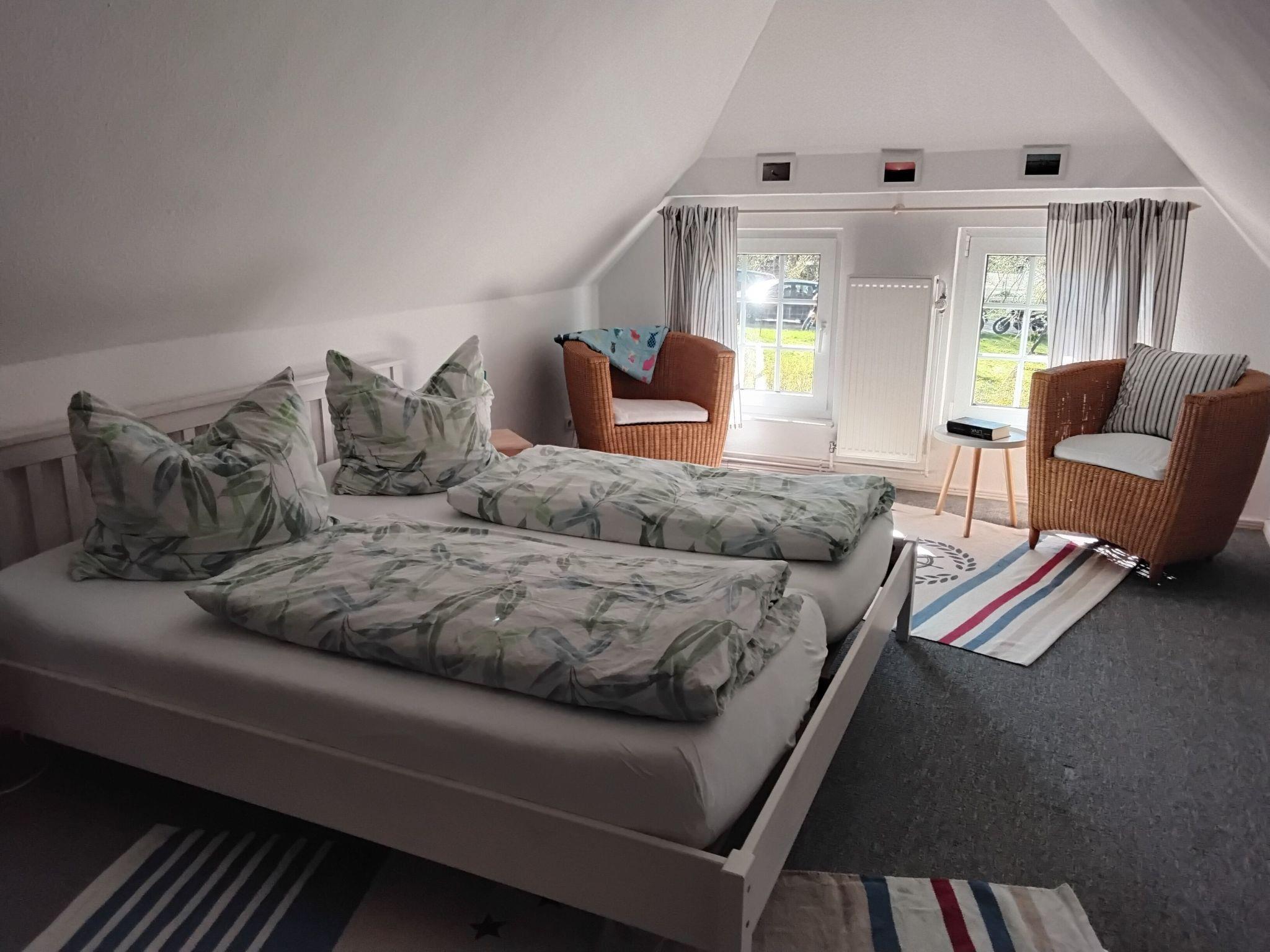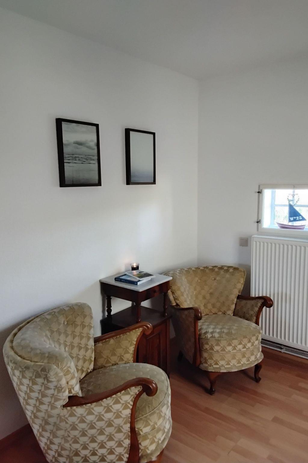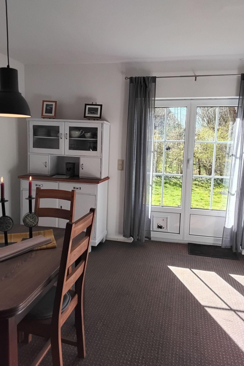The 75m² house was extensively renovated in 2013. Two adults, two children and a dog can enjoy their holiday here from the very first moment. The two bedrooms are on the upper floor, each with a double bed, and a cot can be provided on request free of charge. The lower floor has a shower room and a big living room flooded with daylight, comprising a kitchen unit, a dining space and a sofa corner. The kitchen unit is equipped with a three-ring ceramic hob, a cooker hood, a convection oven and a dishwasher, and an adjacent standing fridge with a big freezer compartment. The lounge corner provides a two-seater and a three-seater sofa, satellite TV and a DVD player.