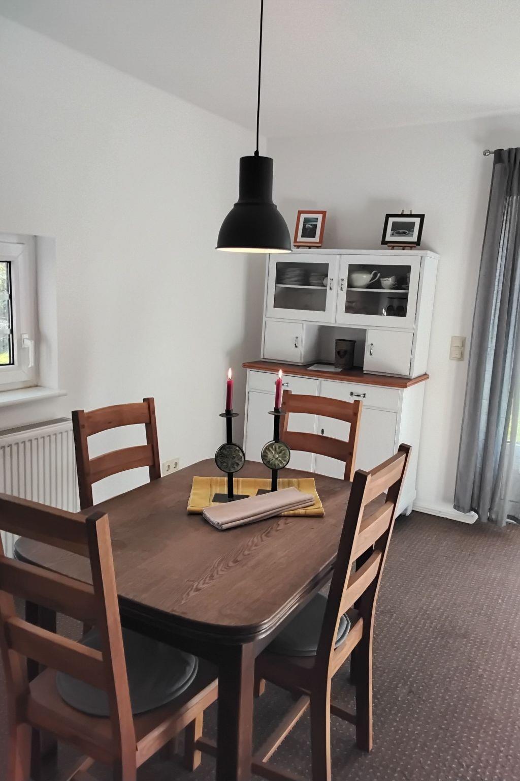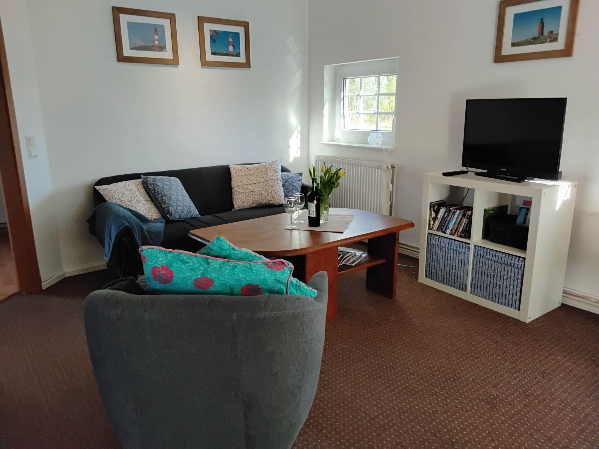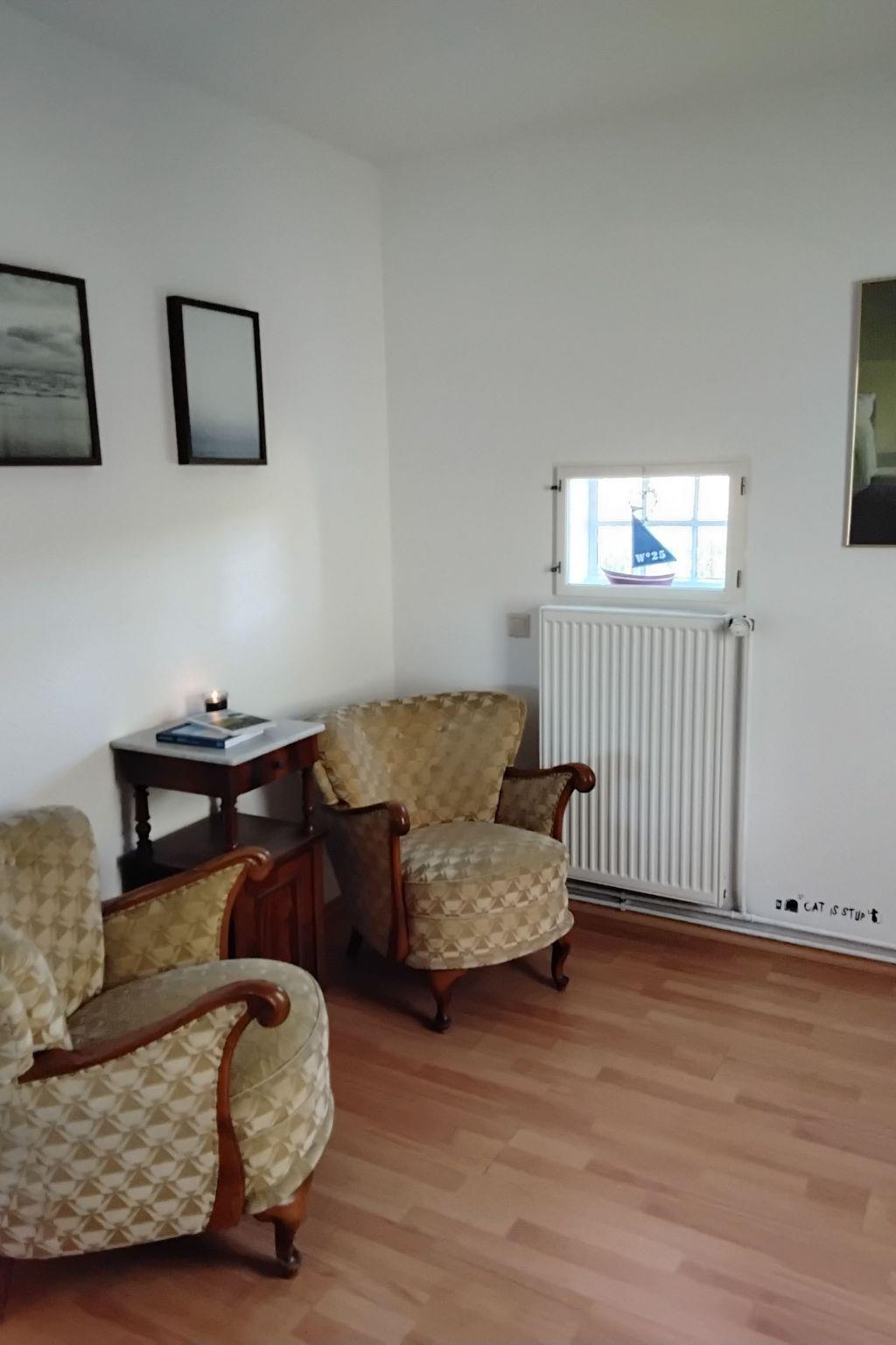 The 75m² house was extensively renovated in 2013. Two adults, two children and a dog can enjoy their holiday here from the very first moment. The two bedrooms are on the upper floor, each with a double bed, and a cot can be provided on request free of charge. The lower floor has a shower room and a big living room flooded with daylight, comprising a kitchen unit, a dining space and a sofa corner. The kitchen unit is equipped with a three-ring ceramic hob, a cooker hood, a convection oven and a dishwasher, and an adjacent standing fridge with a big freezer compartment. The lounge corner provides a two-seater and a three-seater sofa, satellite TV and a DVD player.