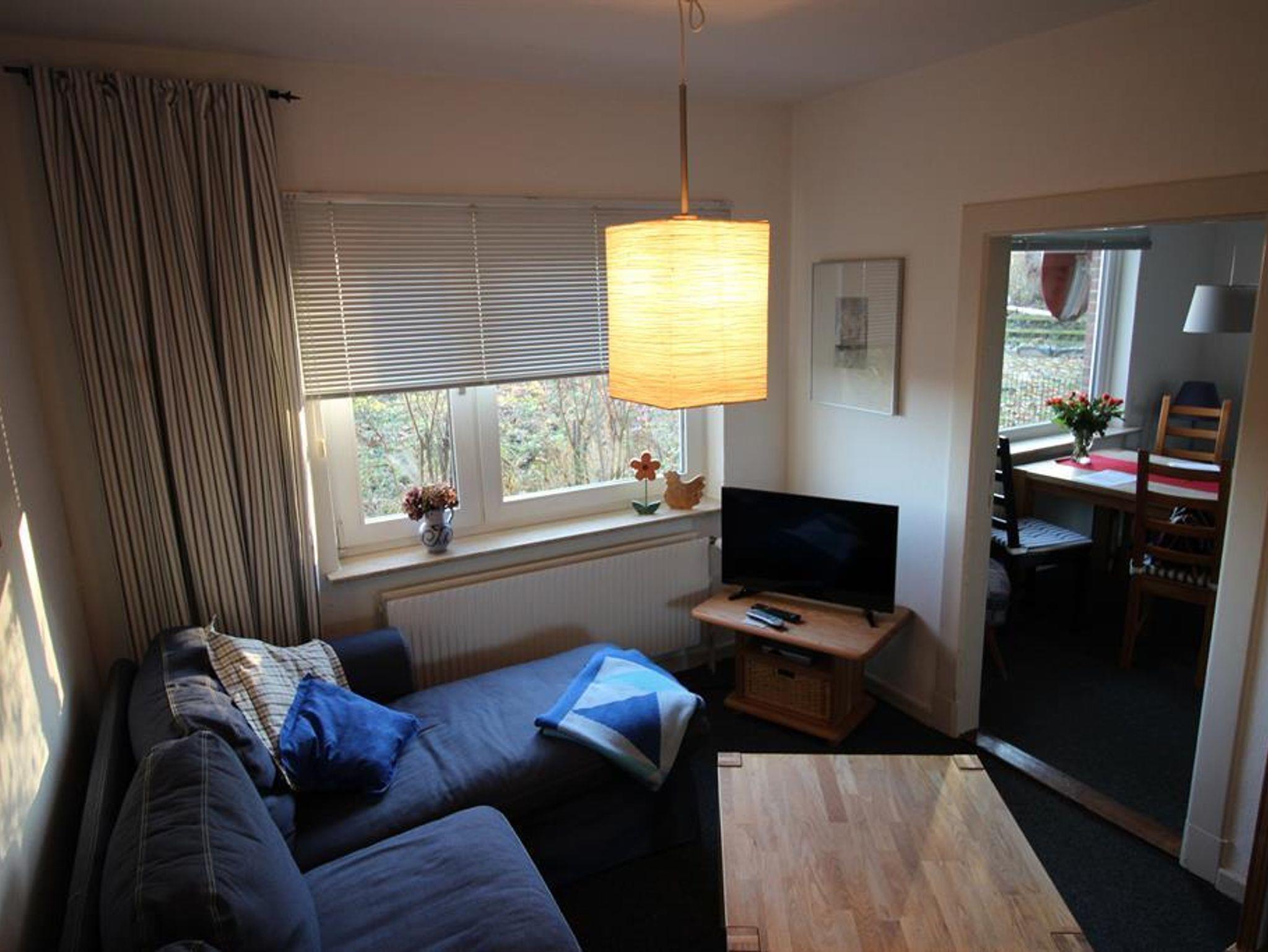 Wohnzimmer: Sitzecke, Sat-TV, Regal mit Büchern und Spielen, Fußboden: Teppichboden