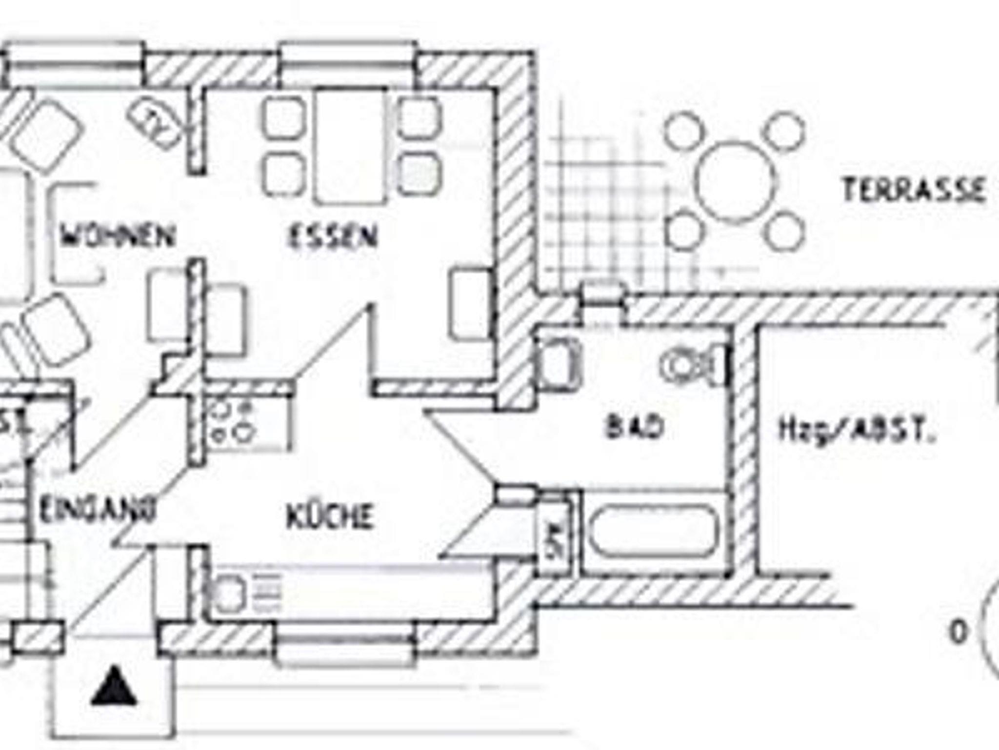 1 Wohnzimmer, 1 Esszimmer, 1 Küche, 2 Schlafräume, 1 Vollbad mit WC, 1 mit Teppich belegte Holztreppe ins OG