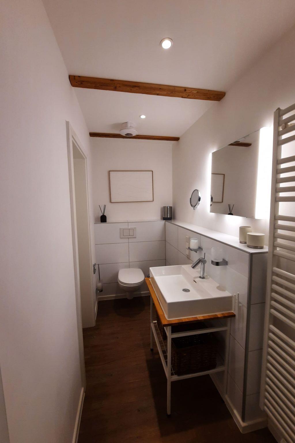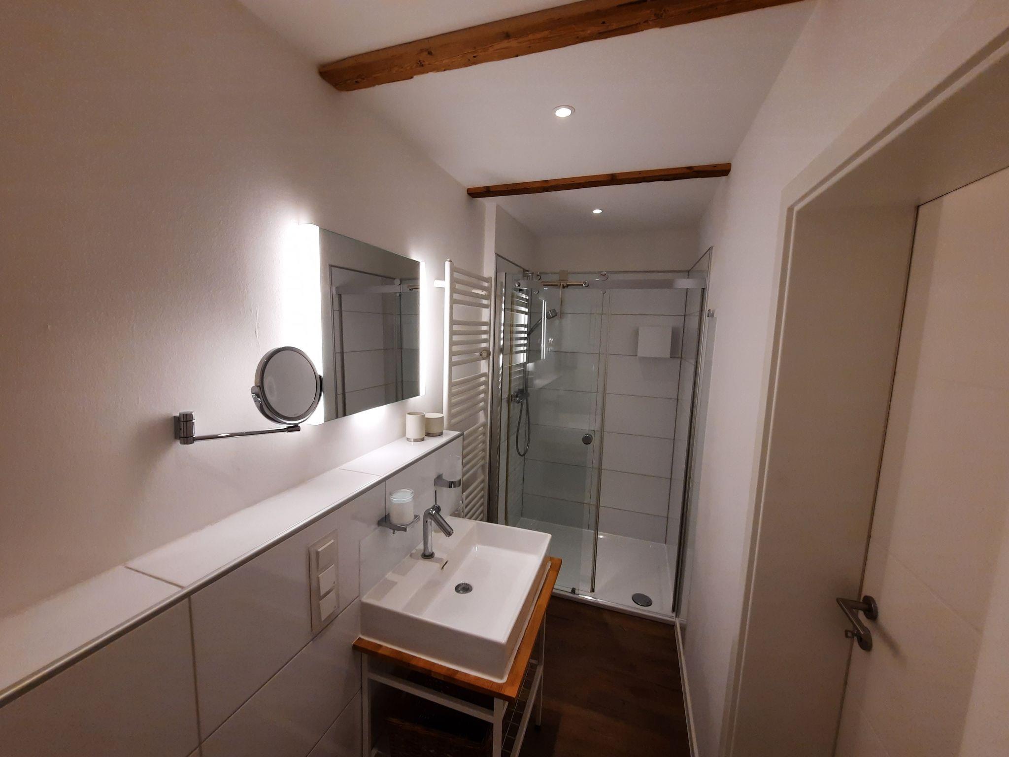 The bathroom with its walk-in shower has been fitted with items from Keuco. The high-quality wall mirror can be illuminated (and dimmed).
