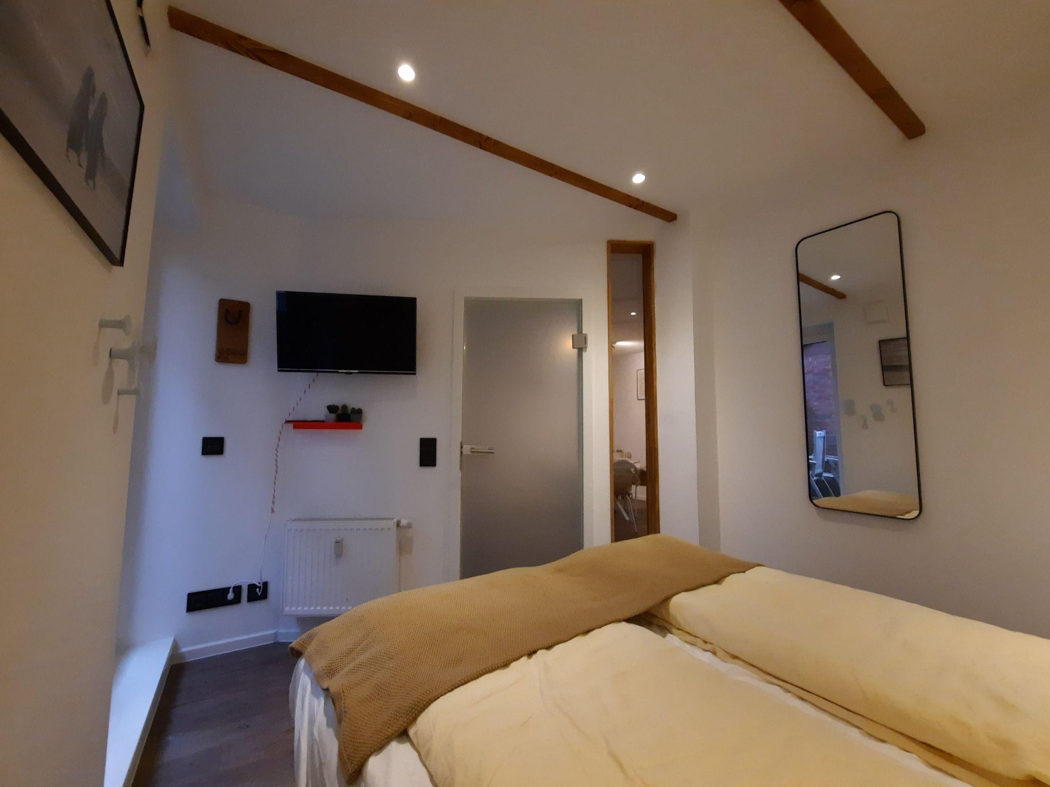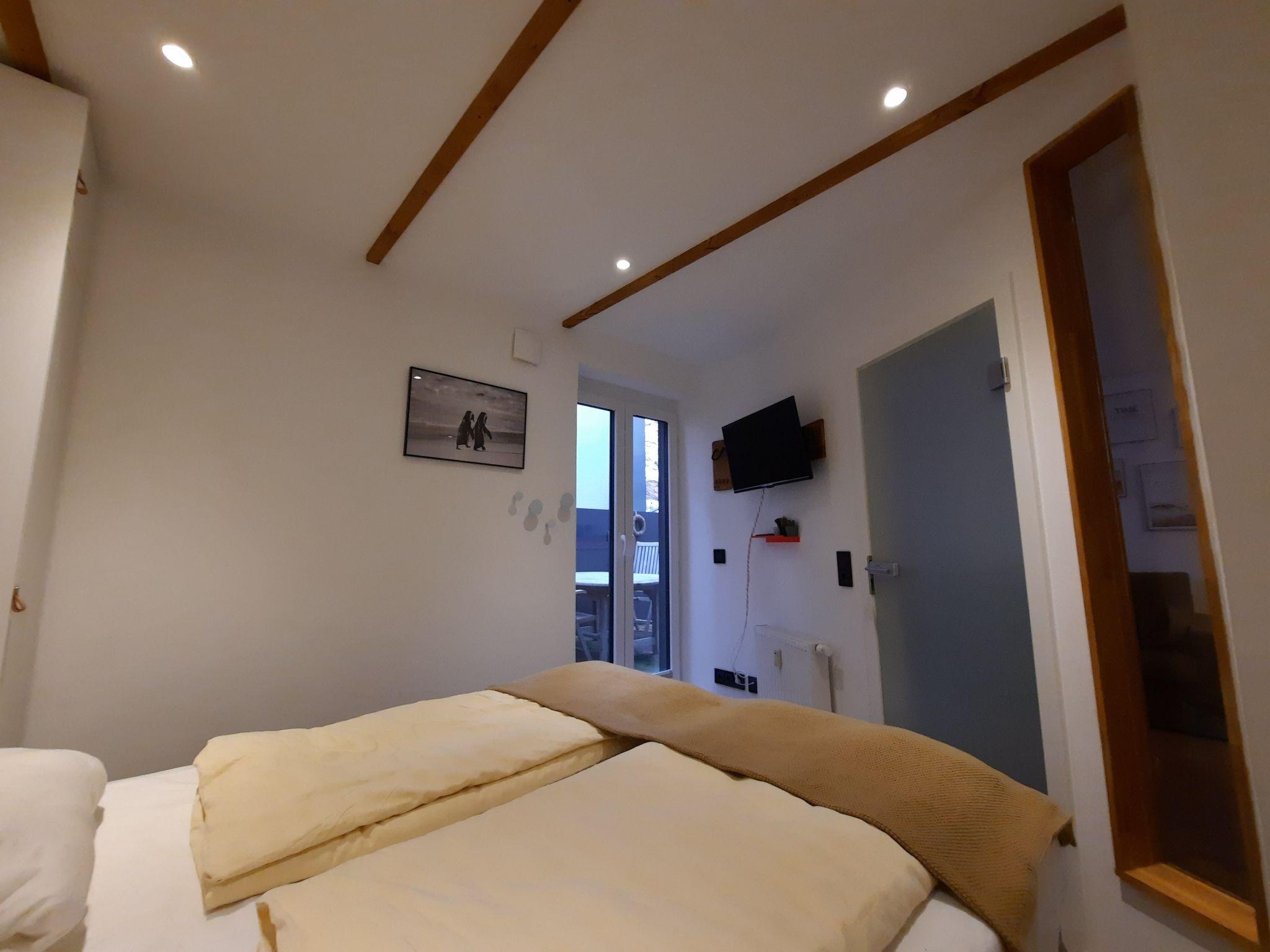 The bedroom has a box-spring bed measuring 1.60 m x 2.00 m and two wardrobes. From the bed, you can comfortably use the flat-screen TV including Sonos soundbar on the opposite wall. The floor-to-ceiling window can be opened completely and leads to the terrace.