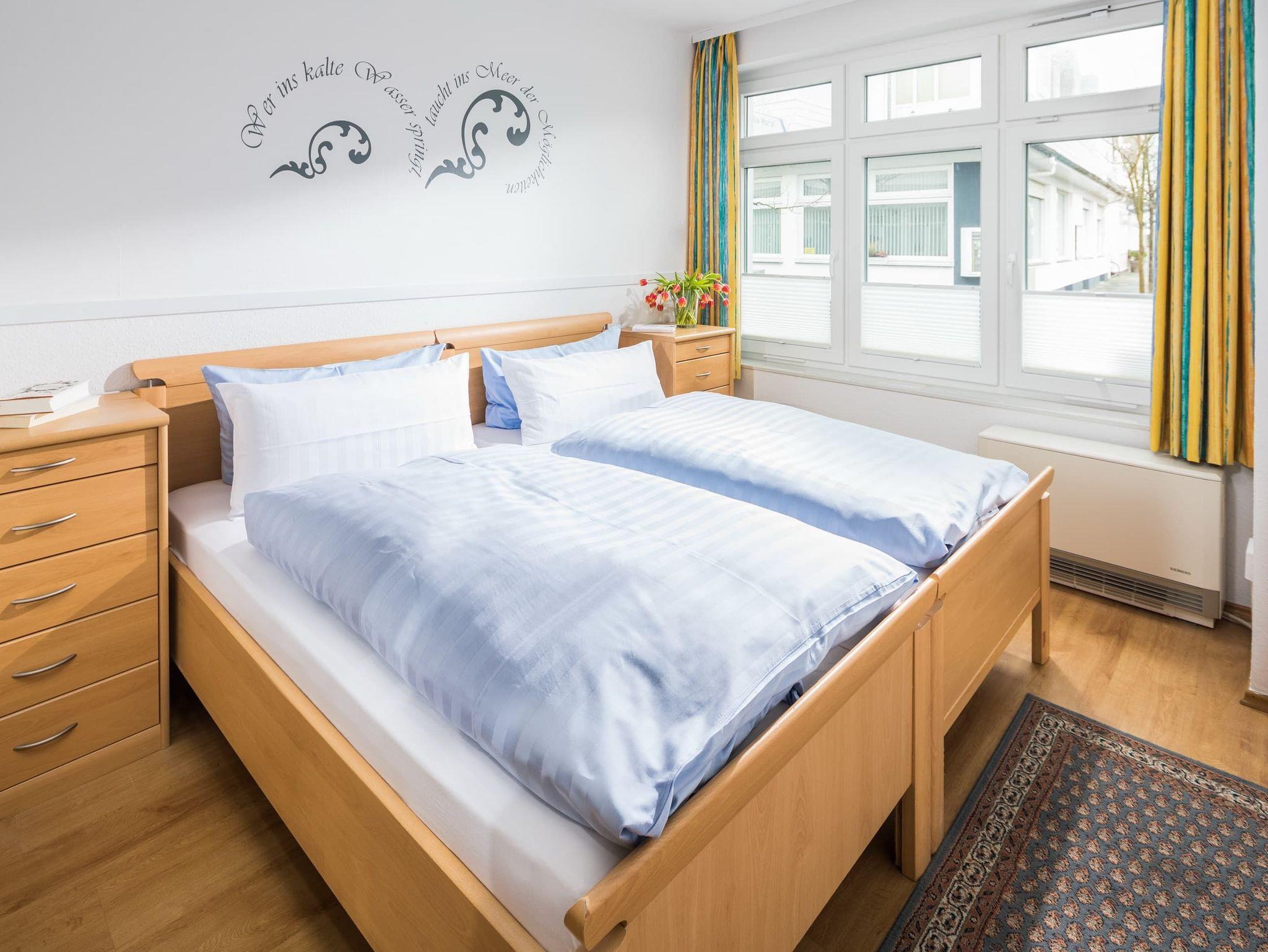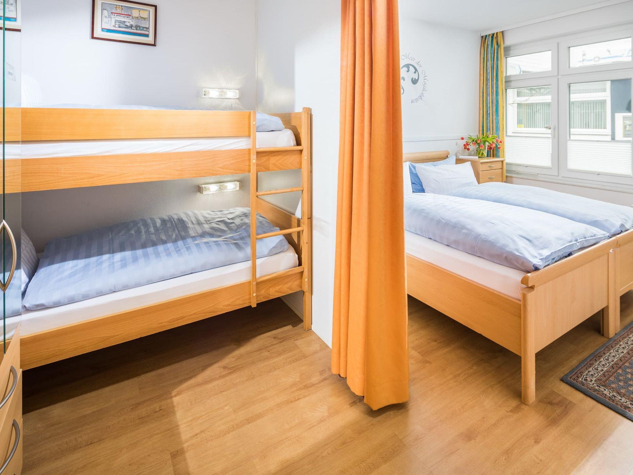 Das Schlafzimmer ist mit einem Doppelbett und einem Etagenbett (nur für die Nutzung von Kindern) ausgestattet. Beides befindet sich in einem Raum und ist durch einen Vorhang abgegrenzt. Für beide Bereiche sichtbar, ist auch dort ebenfalls ein Flachbildfernseher installiert. Die Wohnung ist beschränkt für die Nutzung von 3 Erwachsenen oder alternativ 2 Erwachsenen und 2 Kindern. Hunde sind herzlich Willkommen.