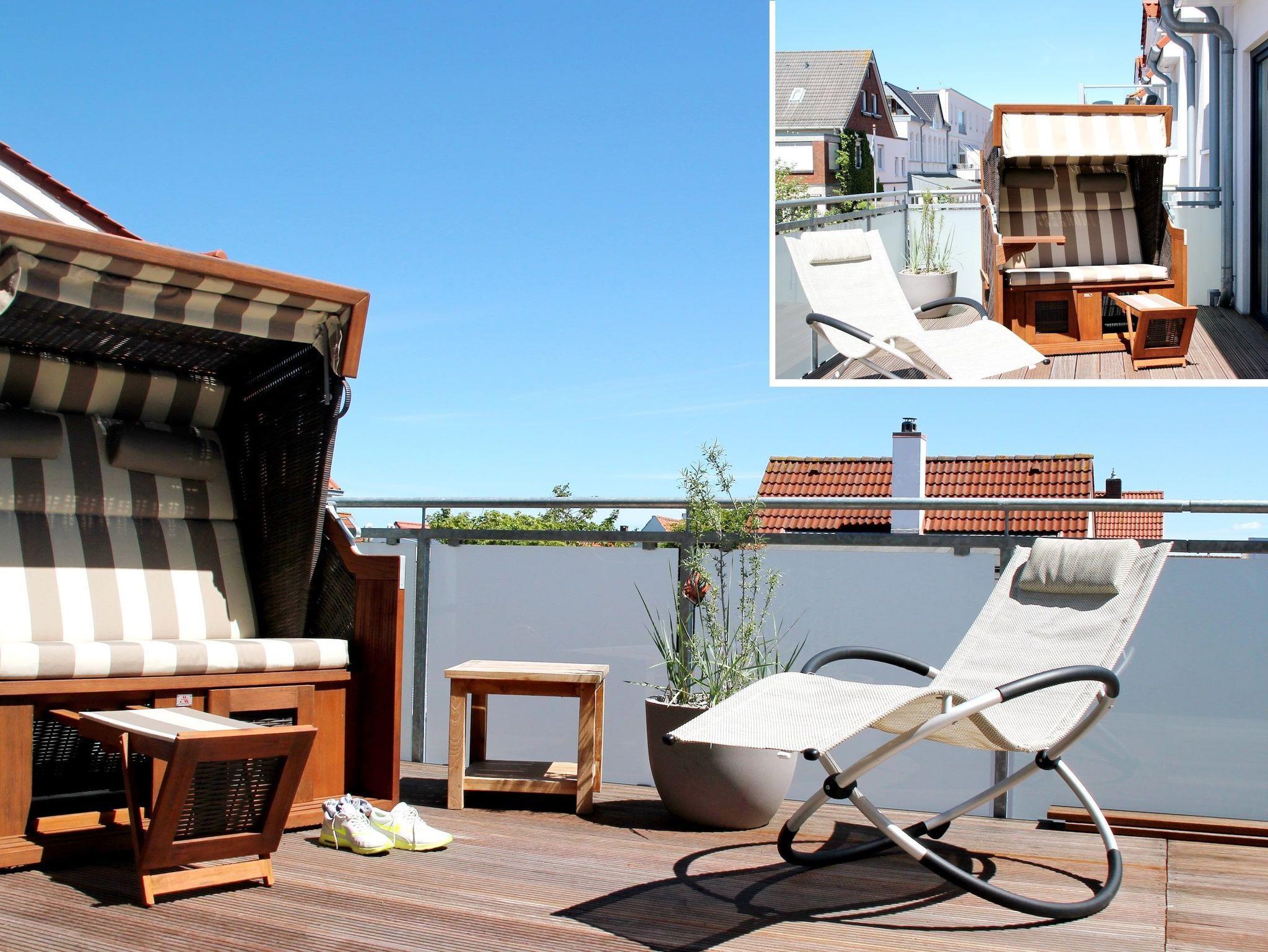 Besonders schön: Zwei große Terrassen ? eine zur Ost- (24 qm), eine zur Westseite (34 qm) ? schenken Ihnen Sonnenmomente zu jeder Tageszeit. Machen Sie es sich in den beiden Strandkörben bequem, lassen Sie den Tag mit einem Glas Wein ausklingen oder starten Sie mit einem Frühstück an der frischen Luft.