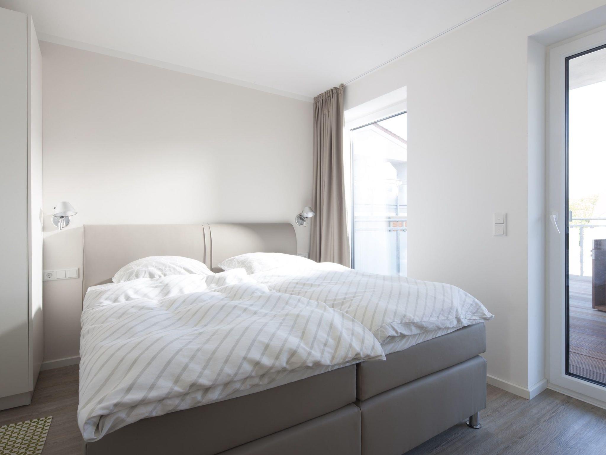Besonders schön: Zwei große Terrassen eine zur Ost- (24 qm), eine zur Westseite (34 qm) schenken Ihnen Sonnenmomente zu jeder Tageszeit. Machen Sie es sich in den beiden Strandkörben bequem, lassen Sie den Tag mit einem Glas Wein ausklingen oder starten Sie mit einem Frühstück an der frischen Luft.