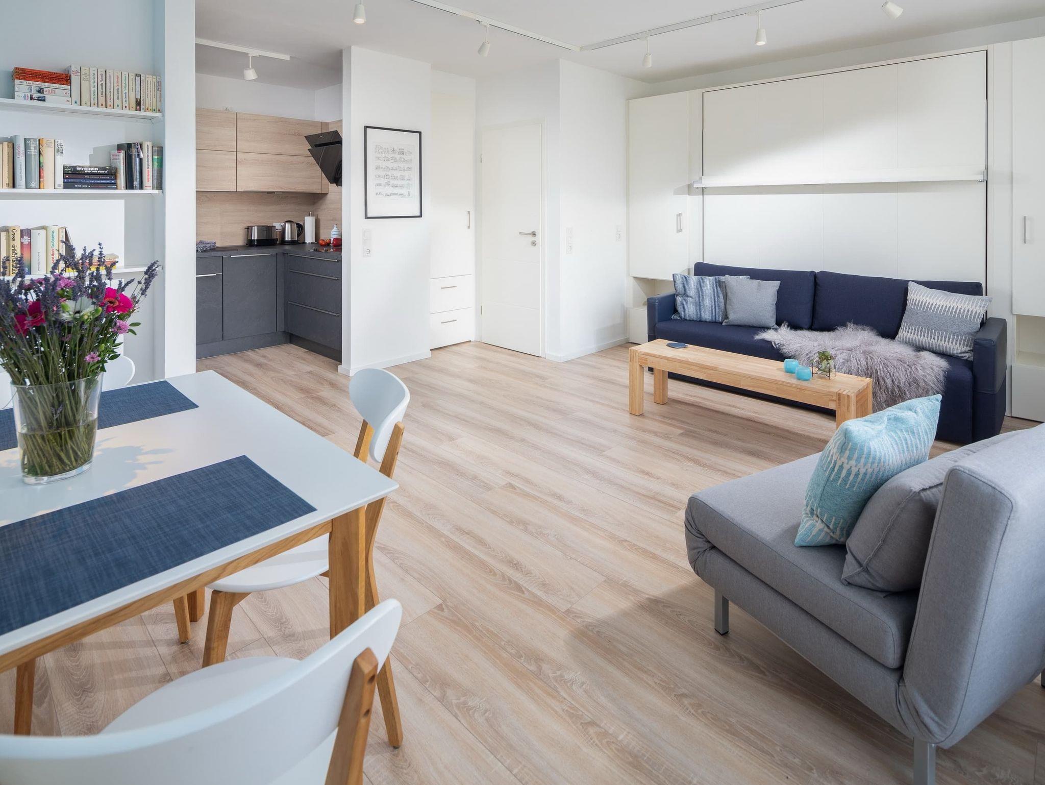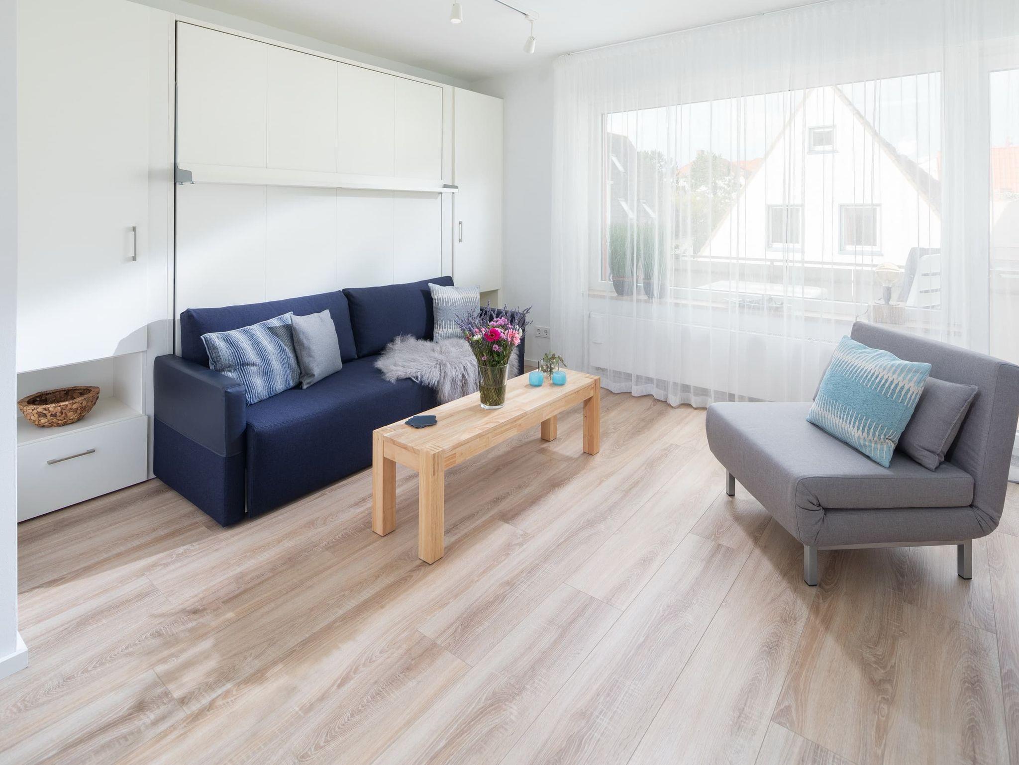 Die Ferienwohnung wurde 2019 komplett saniert. Der helle Wohn- und Schlafraum bietet ein hochwertiges Schrankbett mit integriertem Sofa. Am Esstisch können Sie gemeinsam frühstücken oder im gemütlichen Sessel etwas lesen. Die schöne Fototapete sorgt auch bei Nieselregen für Urlaubsgefühl! Die Küche bietet alle gängigen Elektrogeräte und wird auch Kochliebhabern gerecht. Vom Wohn- und Schlafraum aus gelangen Sie auf den geräumigen Balkon, von dem aus Sie die Dünen des Nordstrandes sehen können. Nur 50m sind es bis zum beliebten „Januskopf“ mit Surfcafé und Cornelius.