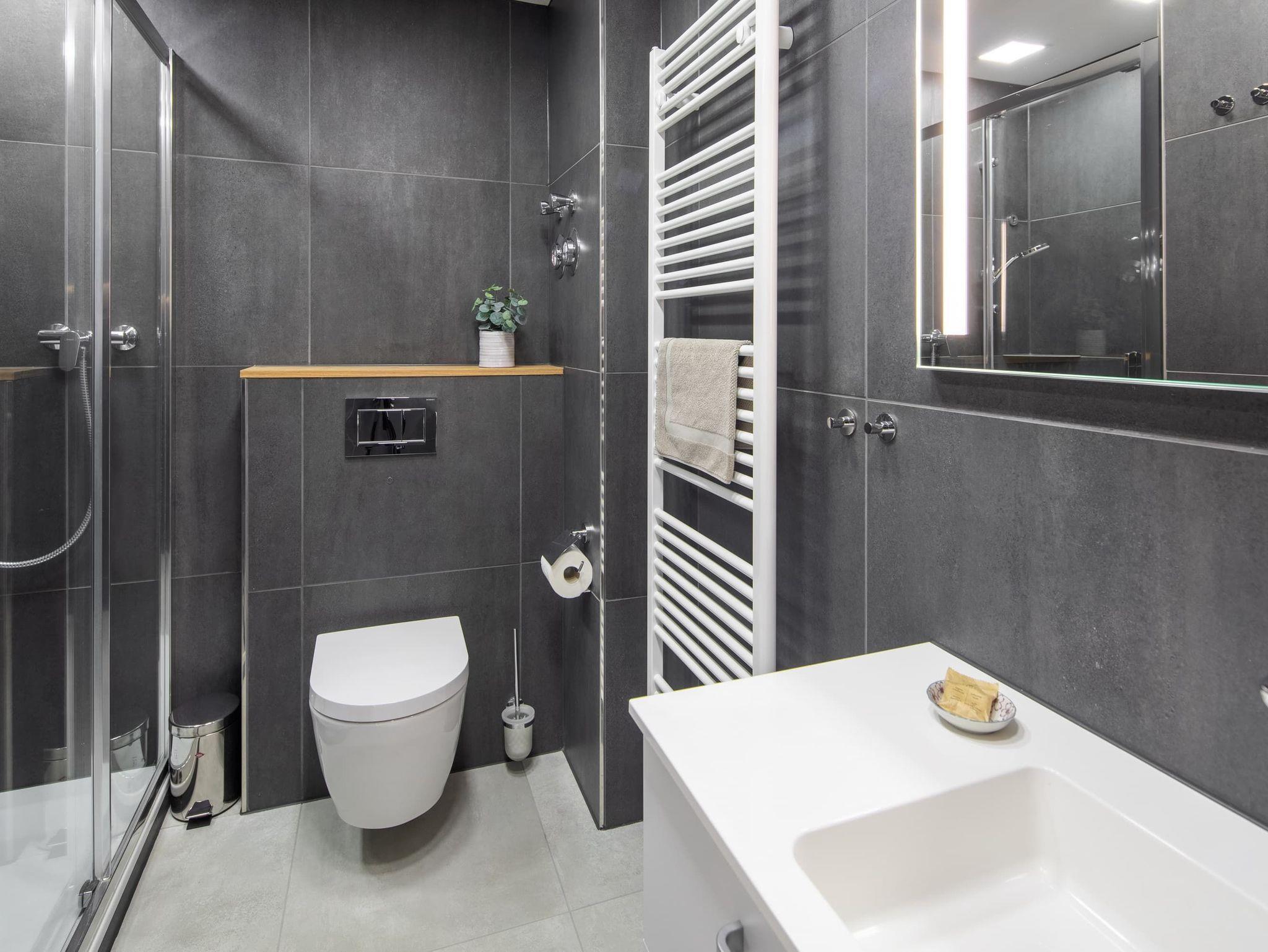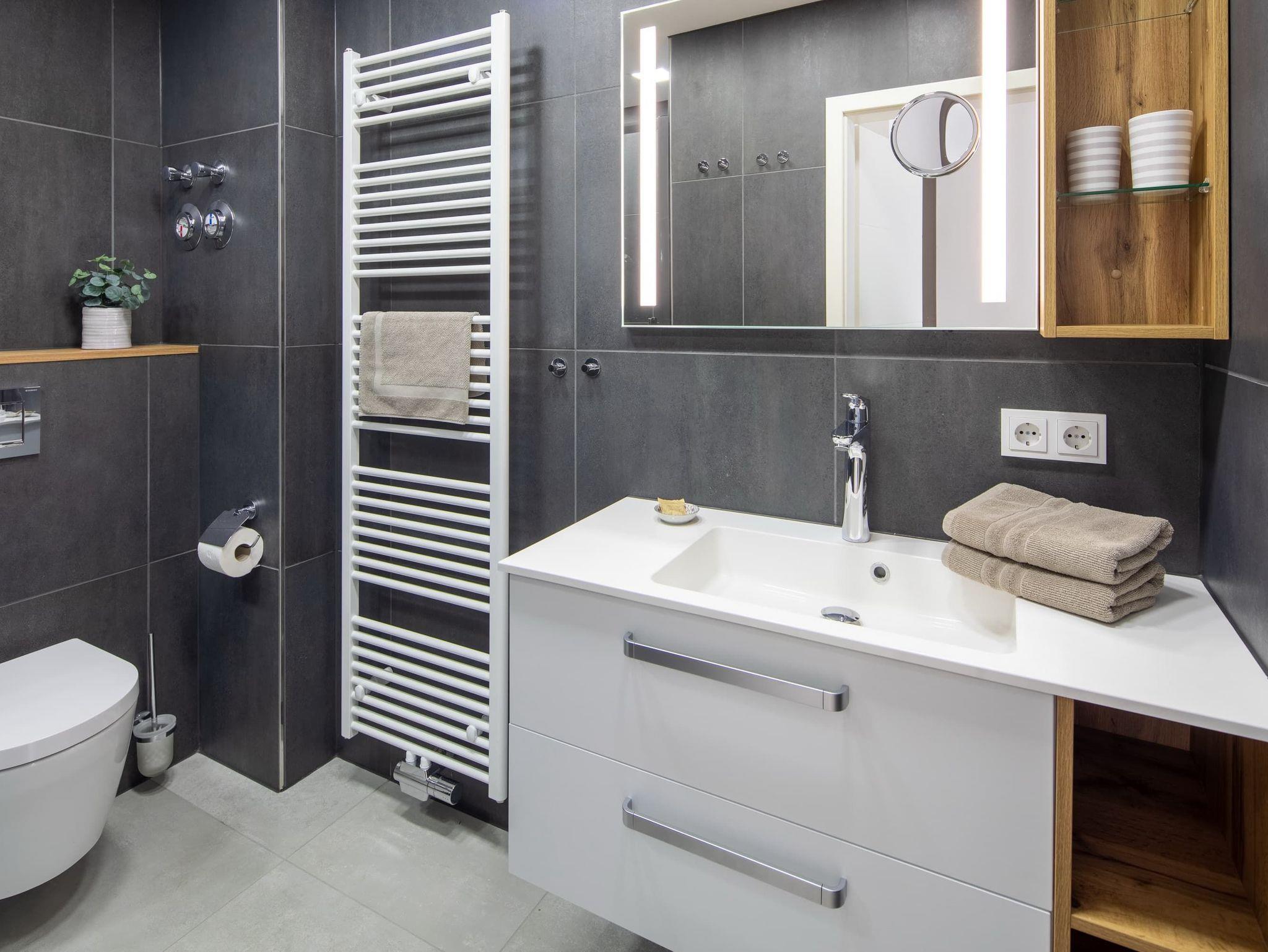 Das hochwertige Badezimmer hat eine bodentiefe Duschwanne. Ein gemütlicher Ort für Strandliebhaber, die sich eine entspannte Auszeit auf der Insel gönnen möchten.