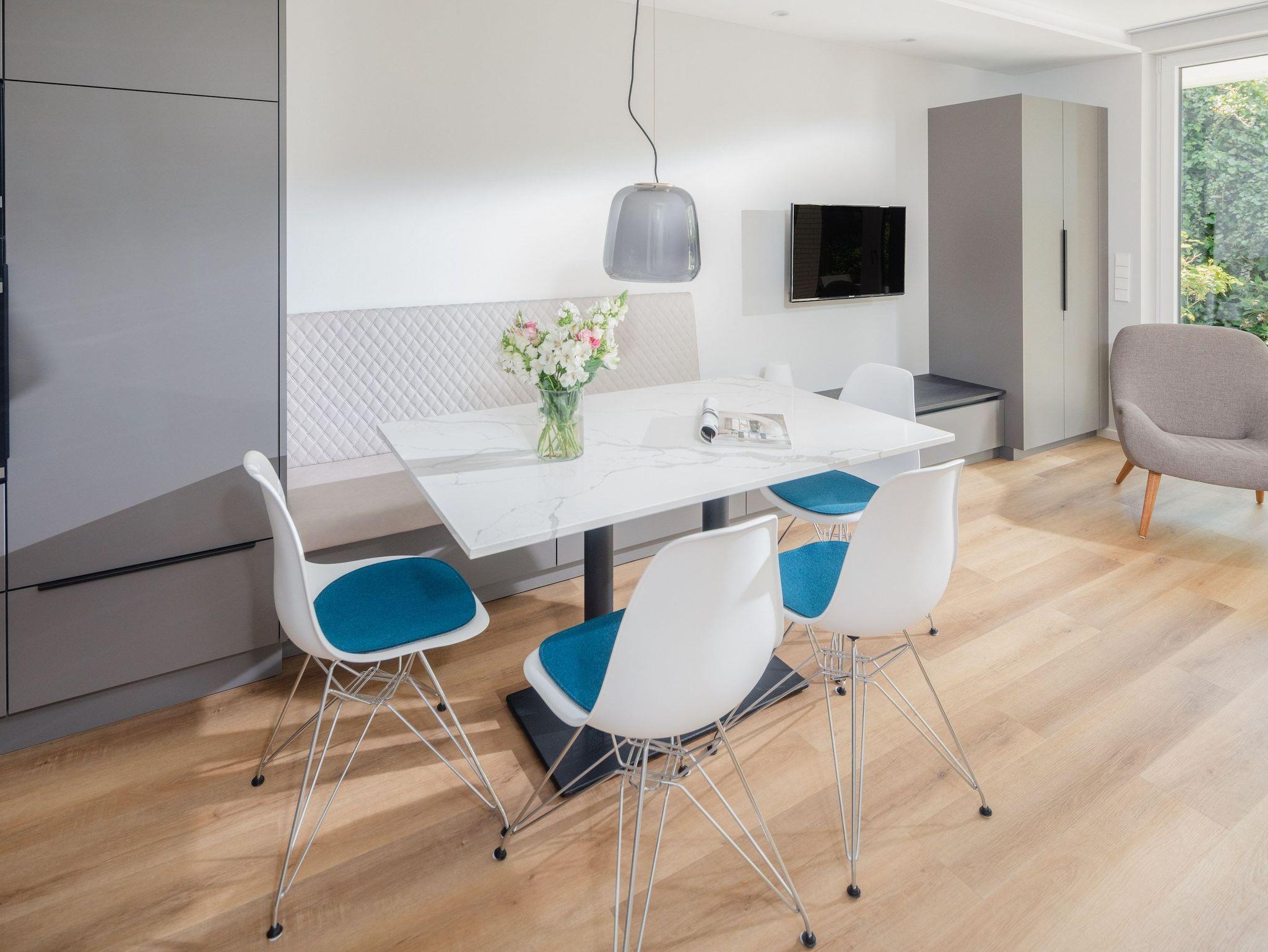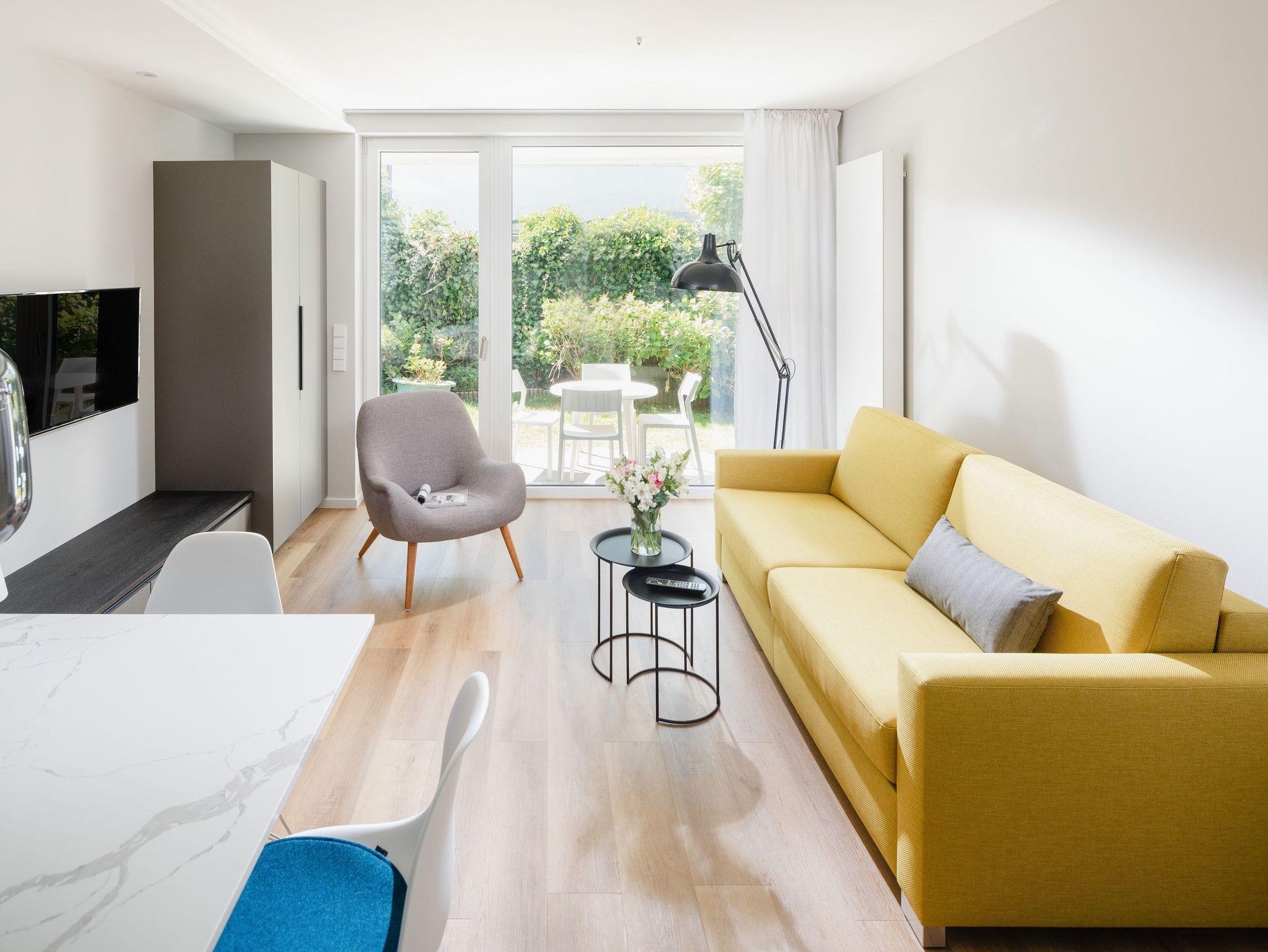 Der Wohn- und Essbereich bietet eine gemütliche Sofaecke (Ausziehcouch 160x200) mit Fernseher. Am geräumigen Essplatz lassen sich entspannte, gemeinsame Mahlzeiten geniessen. Die moderne, offene Küche ist umfangreich mit Spülmaschine, Backofen, Mikrowelle und Annehmlichkeiten wie u.a. einer Nespresso-Maschine ausgestattet. Vom Wohnraum gelangen Sie auch auf die geräumige Terrasse mit Gartenanteil. Auch im separaten Schlafzimmer gibt es neben dem Doppelbett (180x200) einen Fernseher. Das moderne Duschbad bietet Ihnen Entspannung unter der Regendusche.