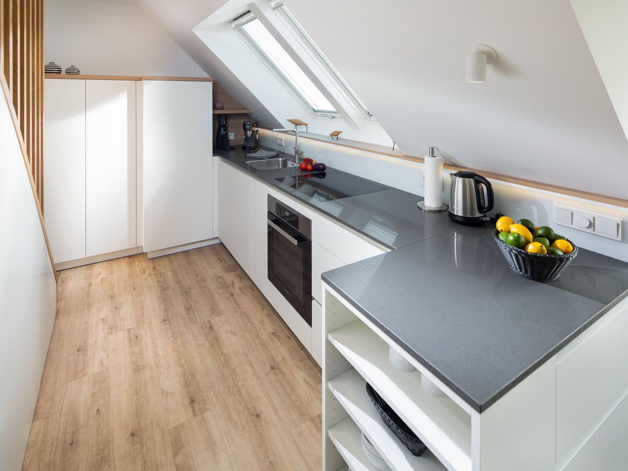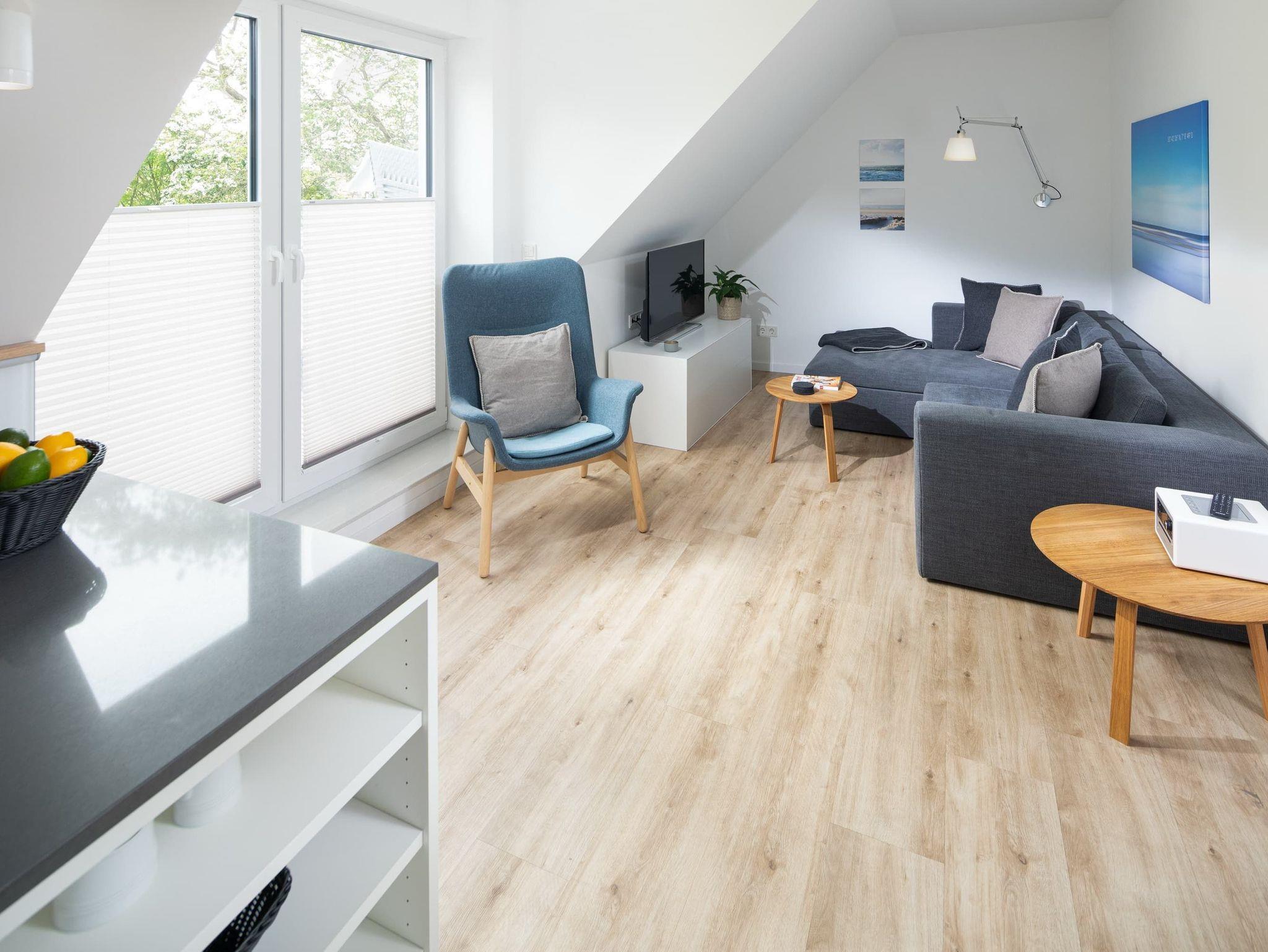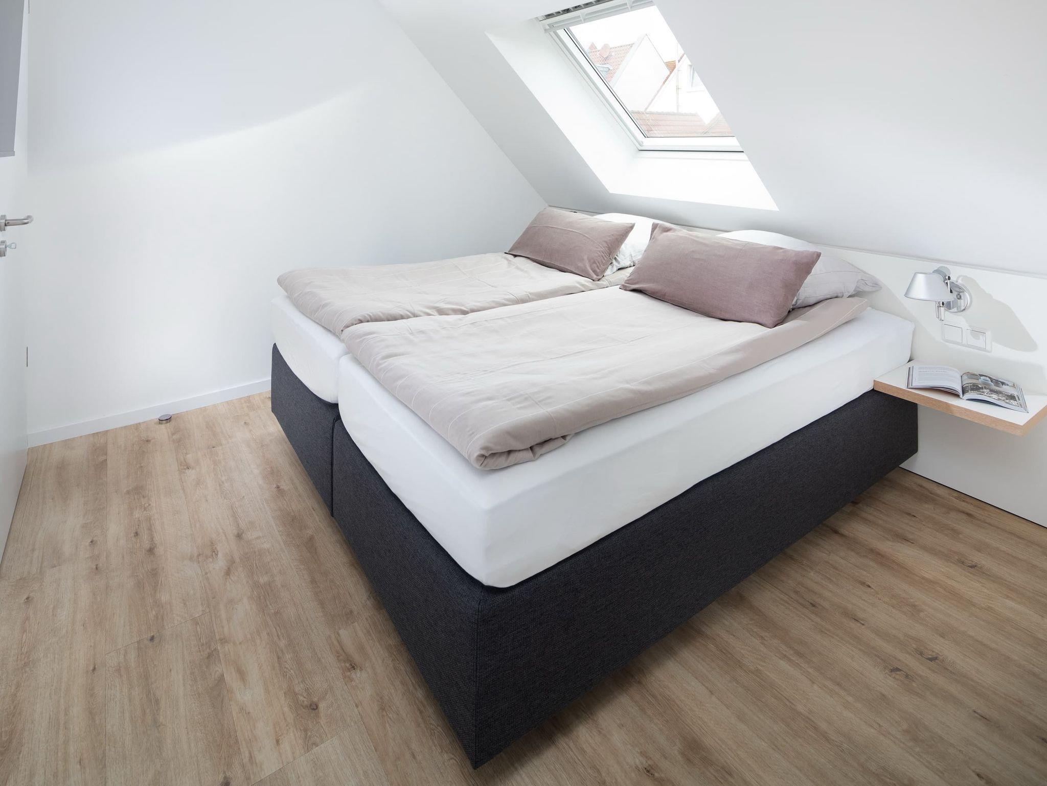 Die großzügige Maisonette-Wohnung im 1. Obergeschoss bietet auf zwei Ebenen ausreichend Platz für bis zu fünf Personen. Im unteren Bereich erwartet Sie ein elegantes Schlafzimmer mit gemütlichem Boxspringbett, ein modernes Duschbad sowie ein separates WC. Der offen gestaltete Wohnbereich begeistert mit einer hochwertigen Küche, einem Esstisch mit einladender Eckbank und einer bequemen Sofaecke perfekt für entspannte Abende. Für den perfekten Soundtrack im Urlaub sorgt die exklusive Sonoro-Hifianlage. Eine Waschmaschinen-Trockner-Kombination steht Ihnen selbstverständlich zur alleinigen Nutzung zur Verfügung.