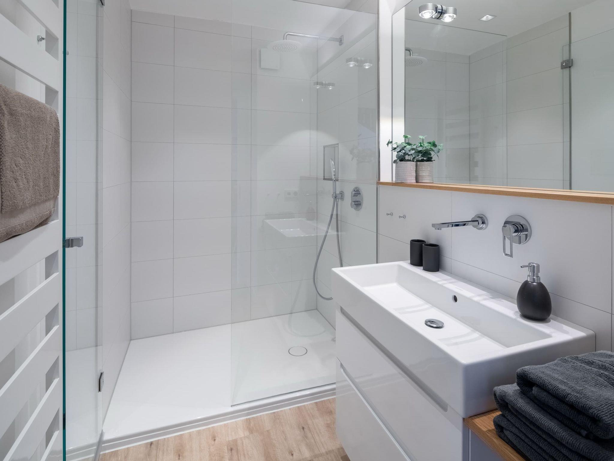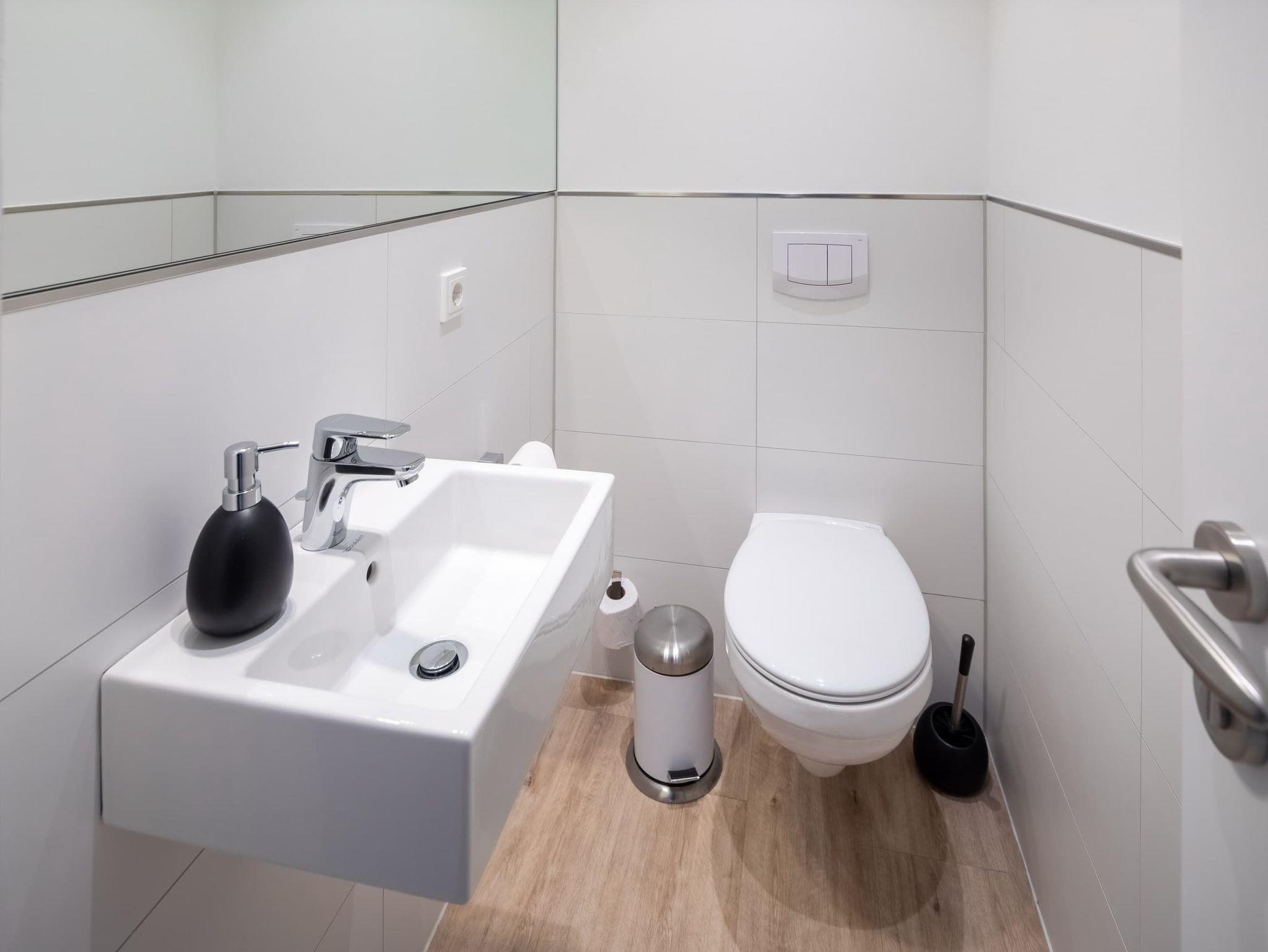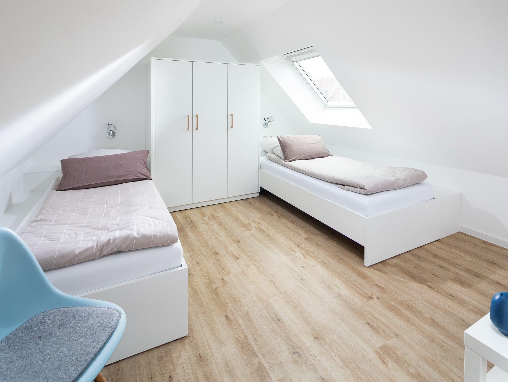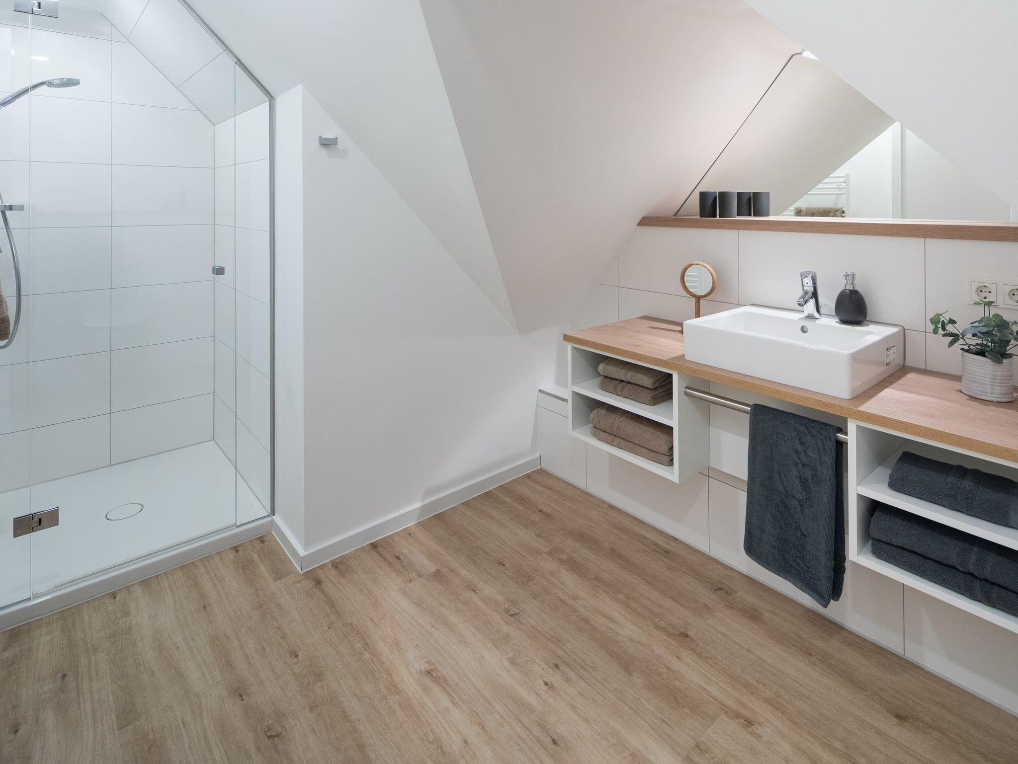 Die großzügige Maisonette-Wohnung im 1. Obergeschoss bietet auf zwei Ebenen ausreichend Platz für bis zu fünf Personen. Im unteren Bereich erwartet Sie ein elegantes Schlafzimmer mit gemütlichem Boxspringbett, ein modernes Duschbad sowie ein separates WC. Der offen gestaltete Wohnbereich begeistert mit einer hochwertigen Küche, einem Esstisch mit einladender Eckbank und einer bequemen Sofaecke perfekt für entspannte Abende. Für den perfekten Soundtrack im Urlaub sorgt die exklusive Sonoro-Hifianlage. Eine Waschmaschinen-Trockner-Kombination steht Ihnen selbstverständlich zur alleinigen Nutzung zur Verfügung.