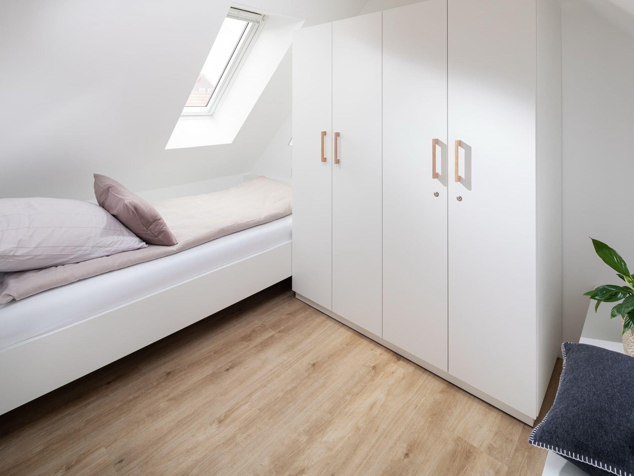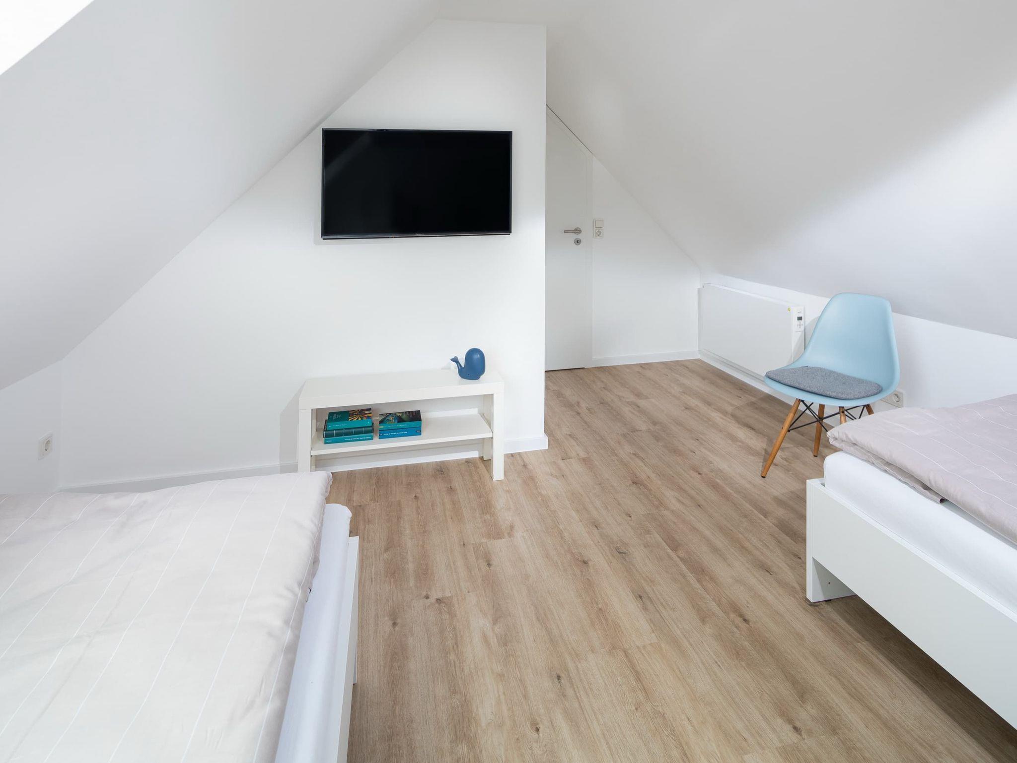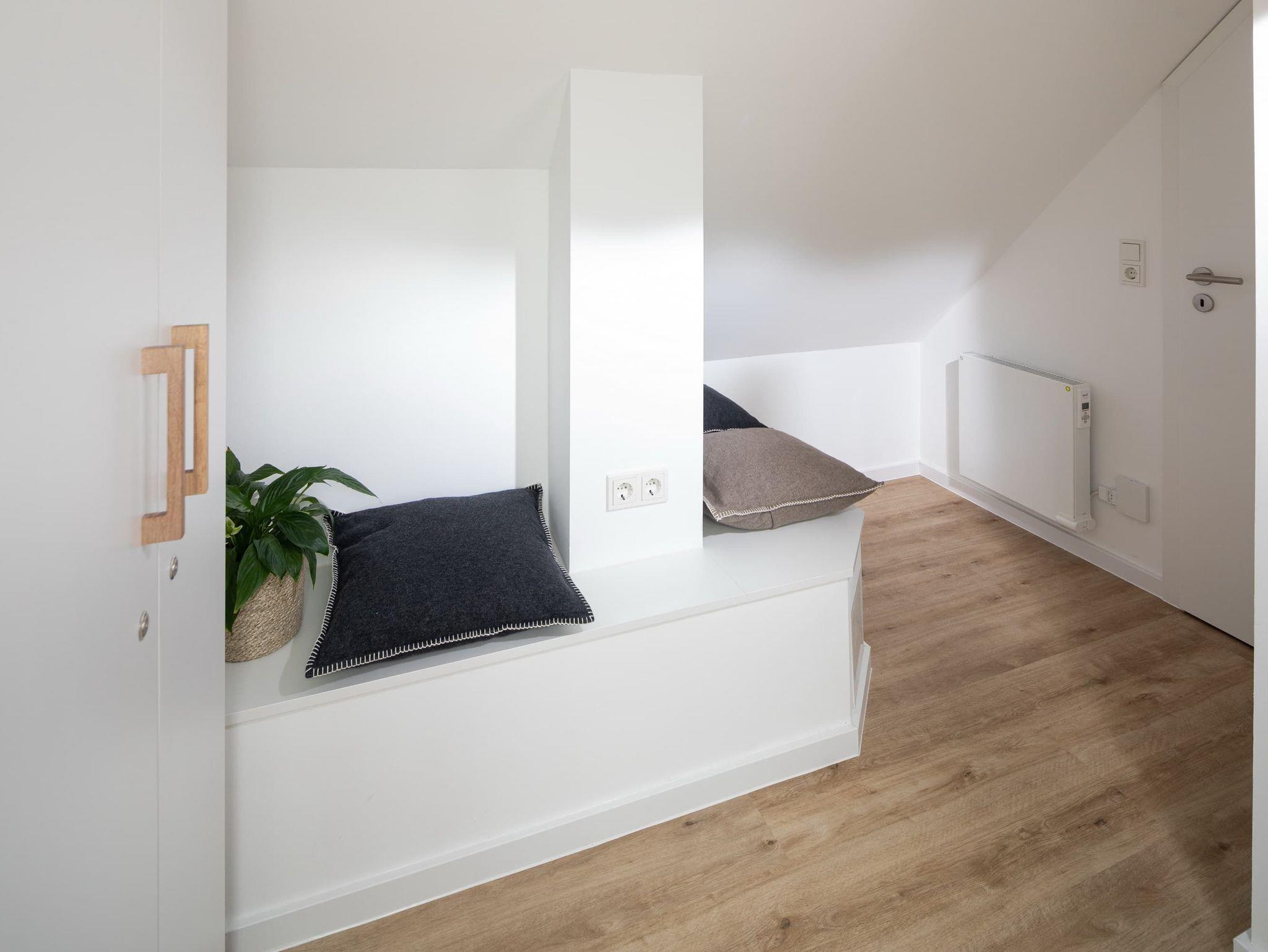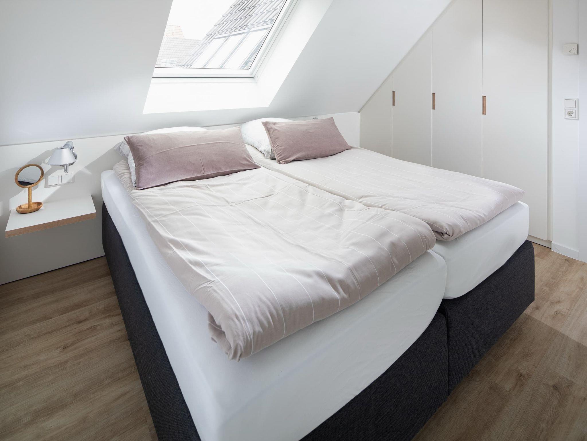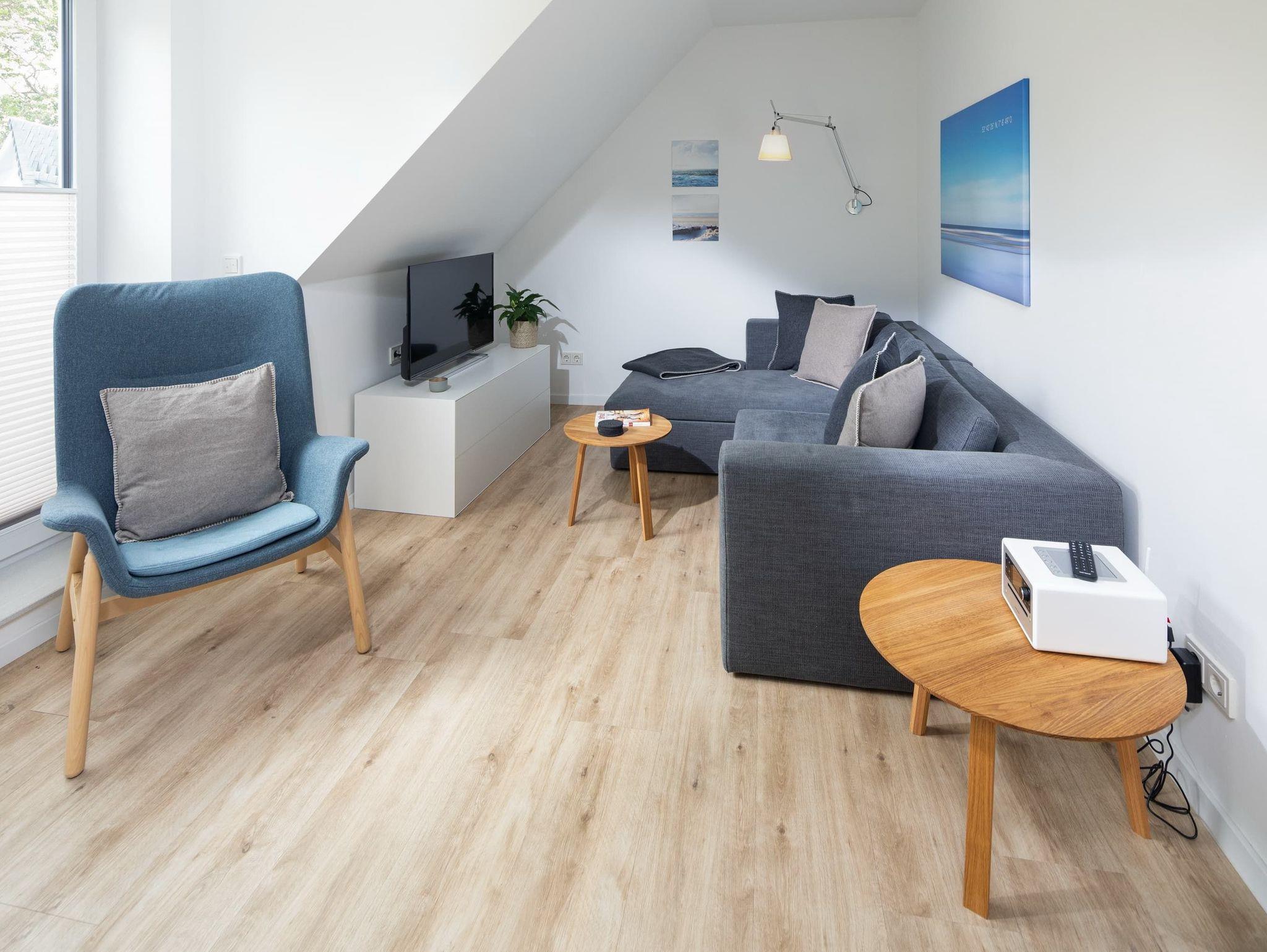 Die großzügige Maisonette-Wohnung im 1. Obergeschoss bietet auf zwei Ebenen ausreichend Platz für bis zu fünf Personen. Im unteren Bereich erwartet Sie ein elegantes Schlafzimmer mit gemütlichem Boxspringbett, ein modernes Duschbad sowie ein separates WC. Der offen gestaltete Wohnbereich begeistert mit einer hochwertigen Küche, einem Esstisch mit einladender Eckbank und einer bequemen Sofaecke ? perfekt für entspannte Abende. Für den perfekten Soundtrack im Urlaub sorgt die exklusive Sonoro-Hifianlage. Eine Waschmaschinen-Trockner-Kombination steht Ihnen selbstverständlich zur alleinigen Nutzung zur Verfügung.