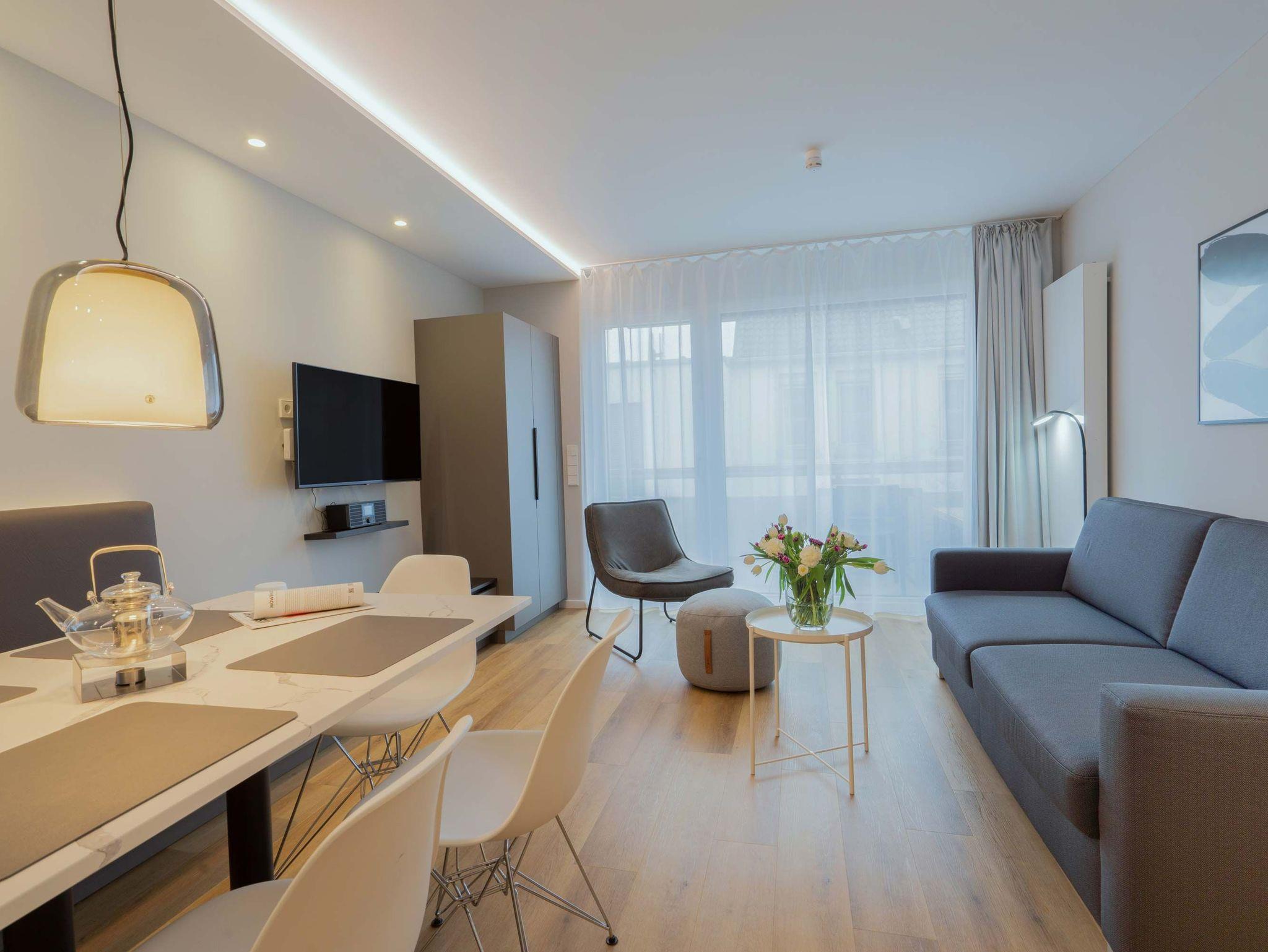 Der Wohn- und Essbereich bietet eine gemütliche Sofaecke (Ausziehcouch 160x200) mit Fernseher. Am geräumigen Essplatz lassen sich entspannte, gemeinsame Mahlzeiten geniessen. Die moderne, offene Küche ist umfangreich mit Spülmaschine, Backofen, Mikrowelle und Annehmlichkeiten wie u.a. einer Nespresso-Maschine ausgestattet. Vom Wohnraum gelangen Sie auf den Balkon mit Westausrichtung. Die Wohnung bietet Ihnen 2 separate Schlafzimmer, jeweils mit Doppelbett (180x200) und zusätzlichem TV ausgestattet. Das moderne Duschbad bietet Ihnen entspannten Komfort unter der Regendusche.