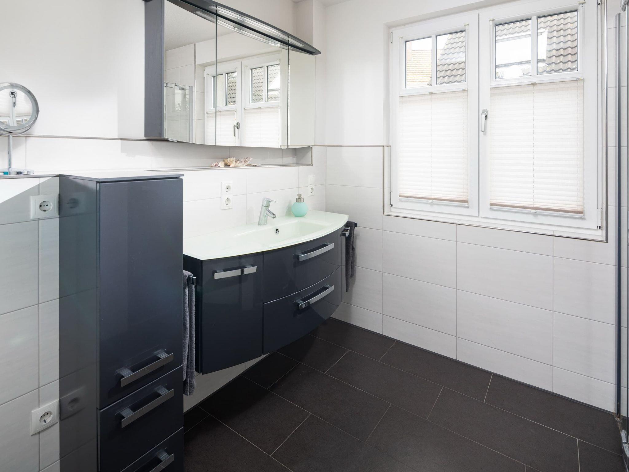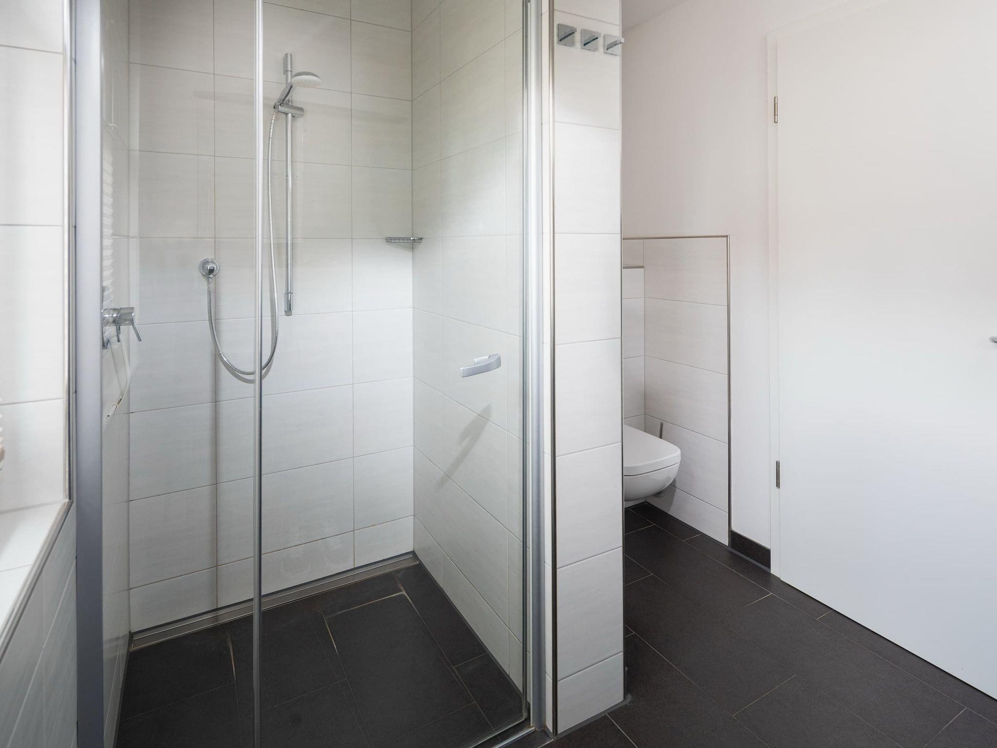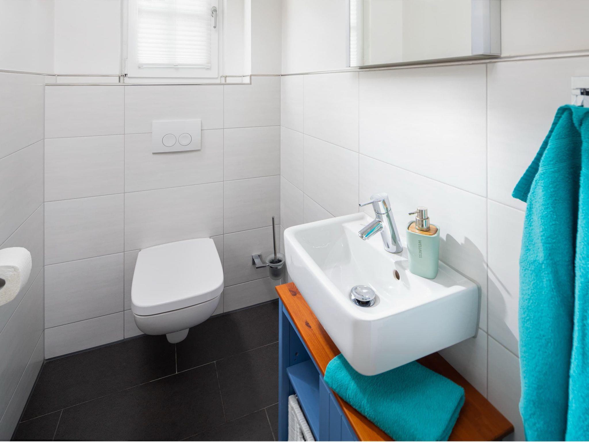 In der Wohnung befindet sich ein Tageslicht-Bad mit ebenerdig, verglaster Dusche, WC, Handtuchtrockner sowie hochwertige Badmöbel mit Glaswaschtisch und ein Spiegelschrank mit viel Ablagefläche. Zubehör wie ein Fön, Duschstuhl, Wäscheständer, Wäschekorb, Kinderhocker und eine Babybadewanne für die jüngsten Gäste sind auch vorhanden. Im Eingangsbereich befindet sich ein Gäste-WC mit Waschtisch und beleuchtetem Spiegel.