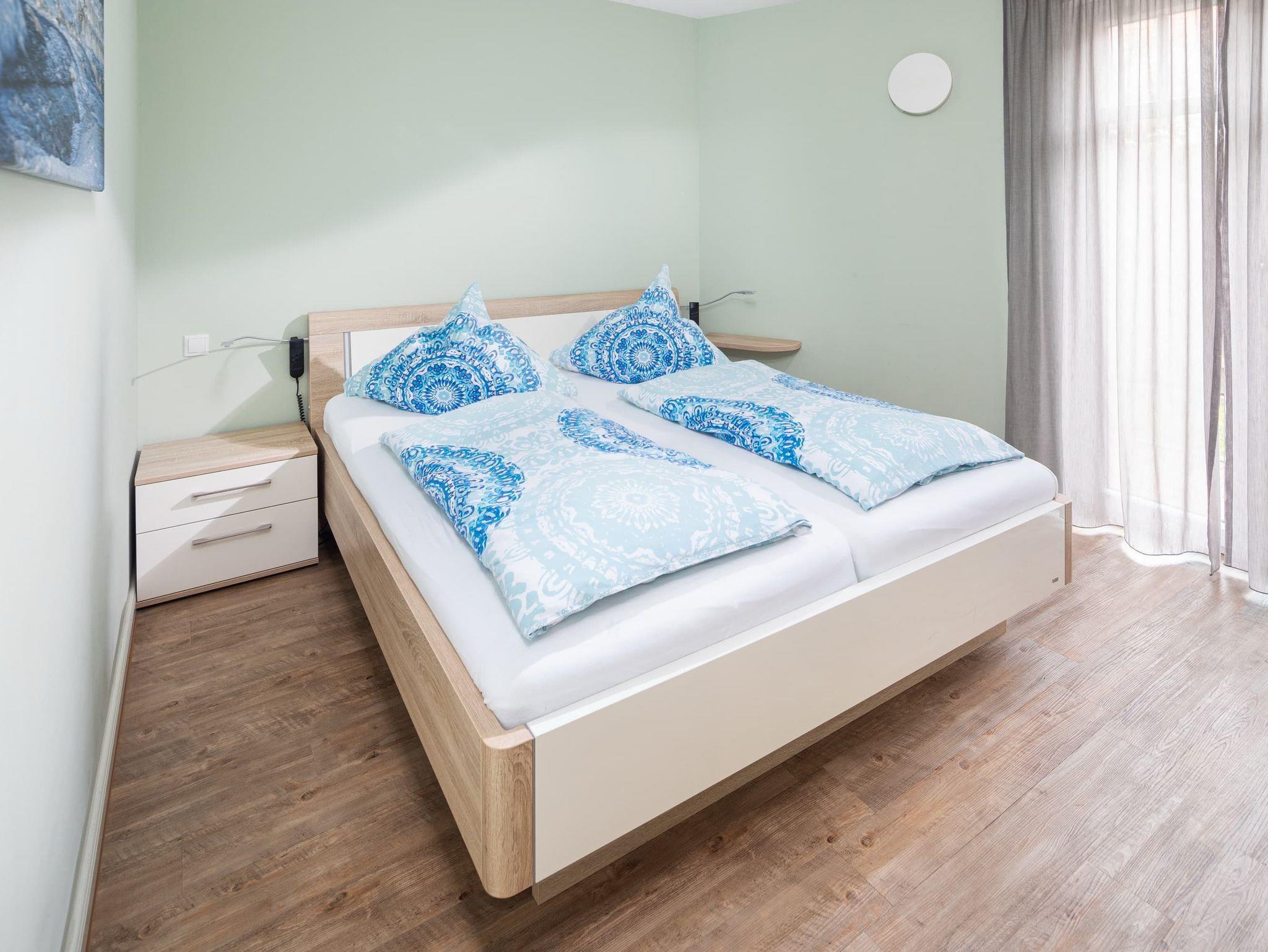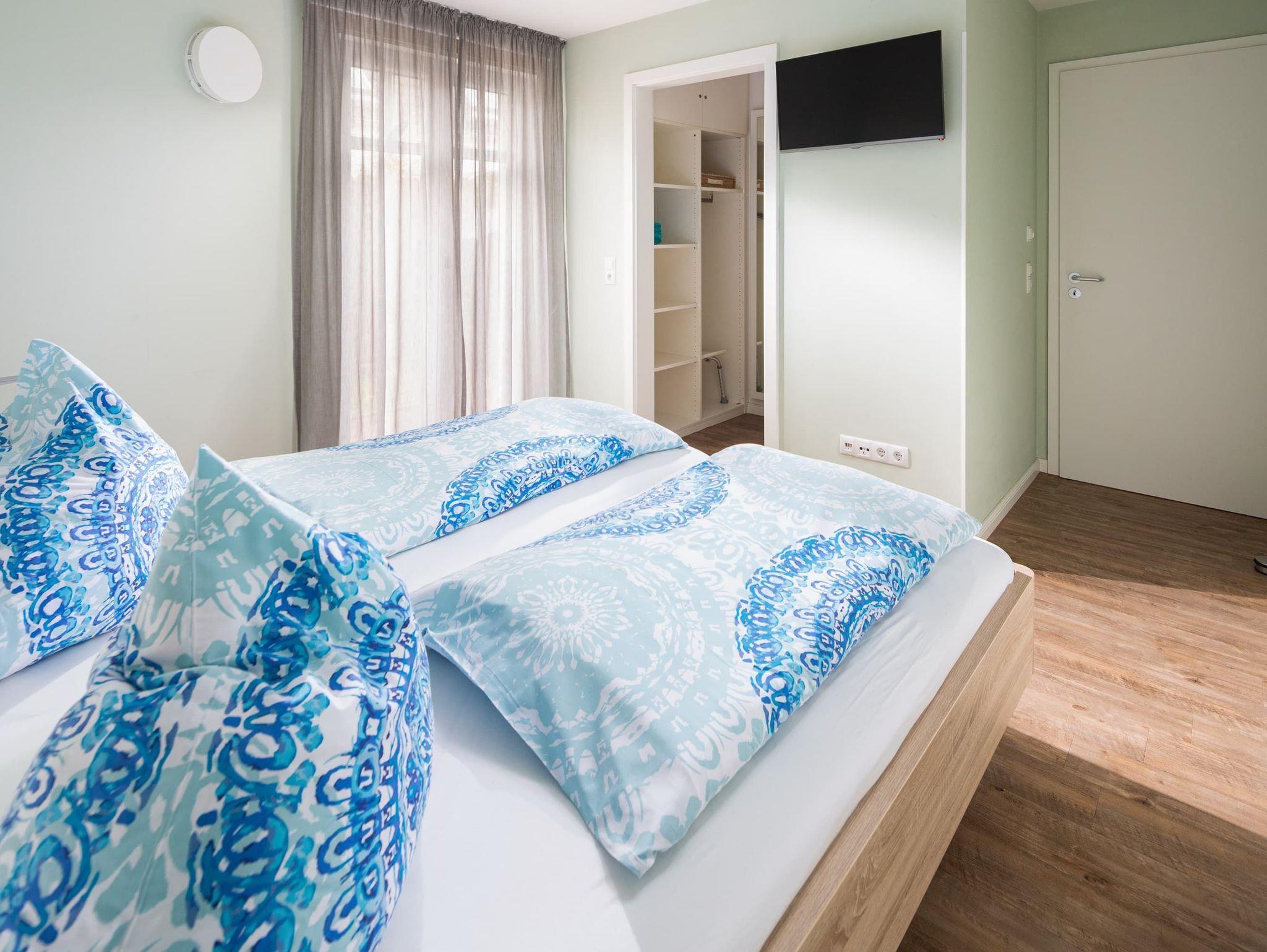 Ein Schlafzimmer verfügt über ein separat am Kopf- und Fußteil elektrisch verstellbares Boxspringbett und das andere Schlafzimmer über ein elektrisch verstellbares Doppelbett mit integrierter Beleuchtung. Beide Betten sind 1,80 m x 2,00 m. In jedem Schlafzimmer finden Sie einen begehbaren Kleiderschrank mit jeweils zwei Einzelschränken, welche mit ausreichend Regalen, einem Spiegel und einer Kleiderstange bestückt sind. Ein massives Kinderbett (1,20m x 0,60 m) kann auf Wunsch bereitgestellt werden. Nachttische, Leselampen, Sessel, stilvolle Stores und Plissees sorgen für Behaglichkeit. Zur medialen Unterhaltung finden Sie in jedem Schlafzimmer einen Samsung 32? LED-TV.