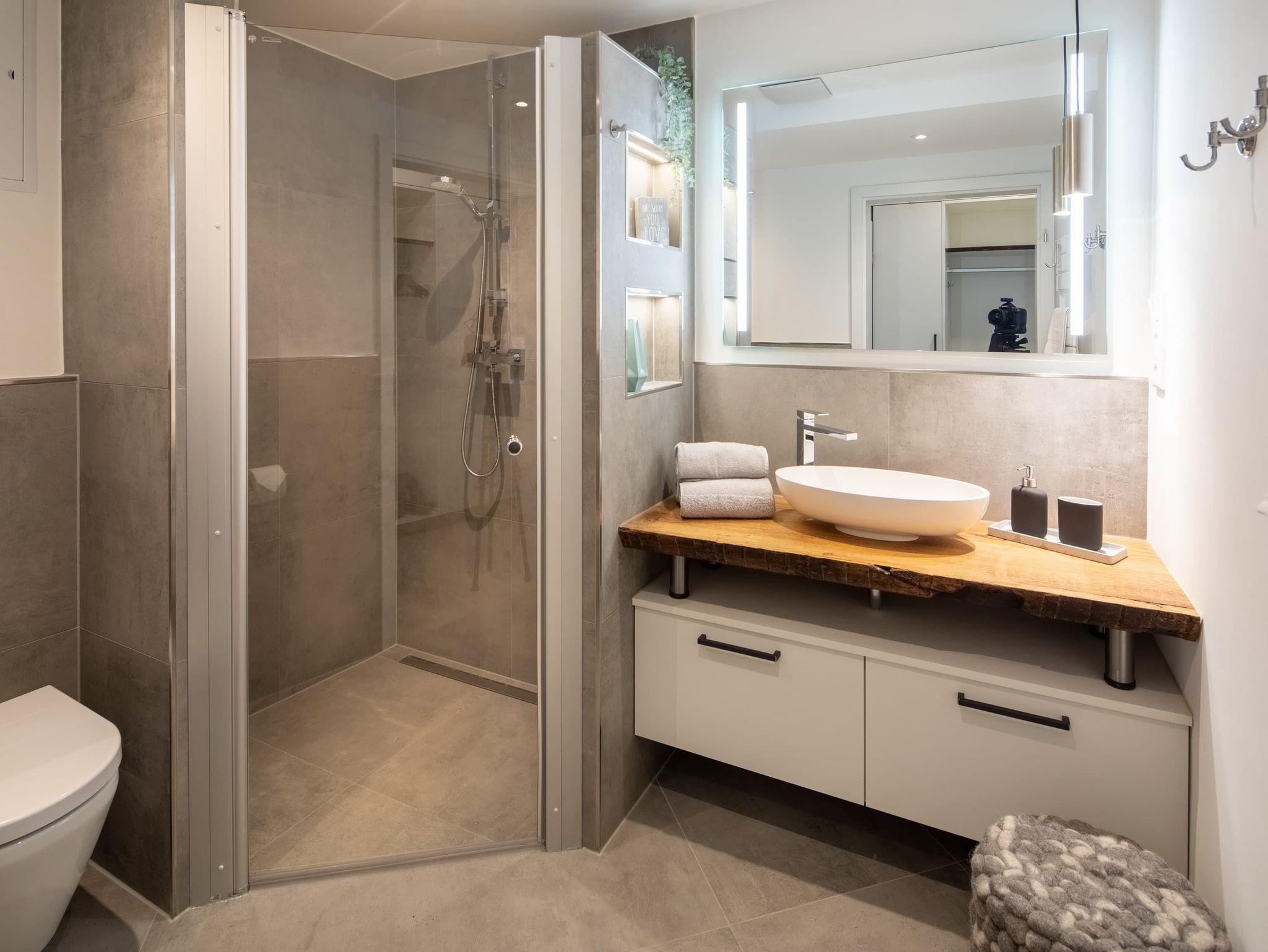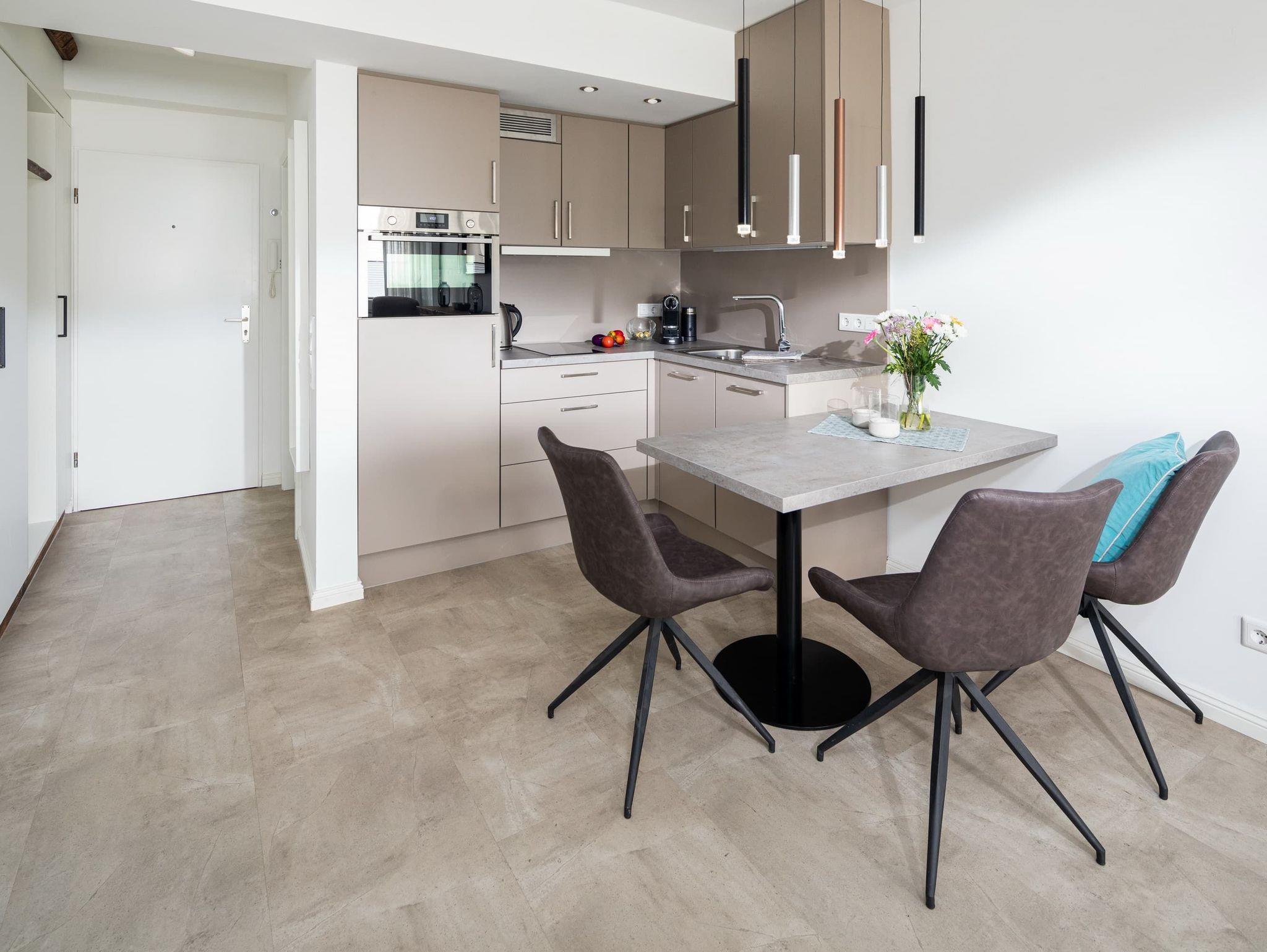 Es erwartet Sie eine charmante, moderne Einbauküche, in der Sie bei Ankunft einen aromatischen Kaffee aus der Nespressomaschine (inkl. Milchaufschäumer) aufbrühen können. Der Esstisch bietet Platz für 2-4 Personen. Im Flur erwartet Sie ein großzügiger Kleiderschrank. Im modernen Bad spiegelt sich die Gemütlichkeit des Wohnraumes wider, es ist mit einer bodentiefen und großzügigen Dusche und mit schönem Lichtambiente ausgestattet. Nicht zu Hause, aber doch daheim!
