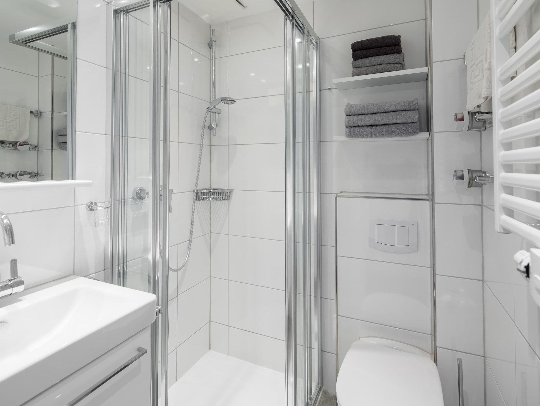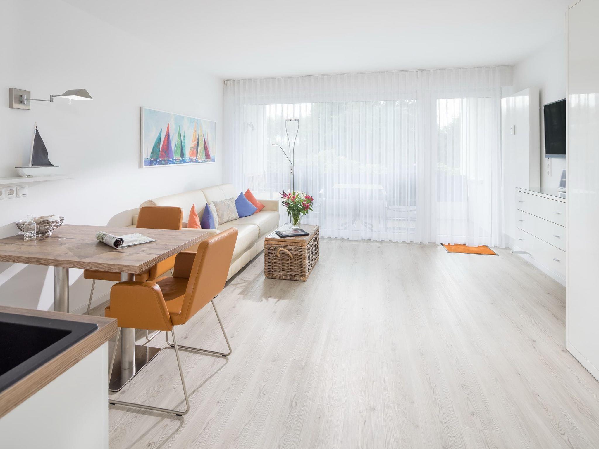 Die moderne Küchenzeile bietet eine Spülmaschine, Kühlschrank mit Gefrierfach, eine Mikrowelle mit Backfunktion, Herd, Toaster, Wasserkocher und eine Tchibo Cafissimo Kapselmaschine. Ein Esstisch für bis zu drei Personen grenzt die Küche vom Wohnbereich ab. Neben Kabel-TV über den Flachbildfernseher sorgen Radio und CD Player und kostenfreies WLAN für Urlaubsstimmung. Das weiß geflieste Bad bietet eine bodentiefe Duschwanne.