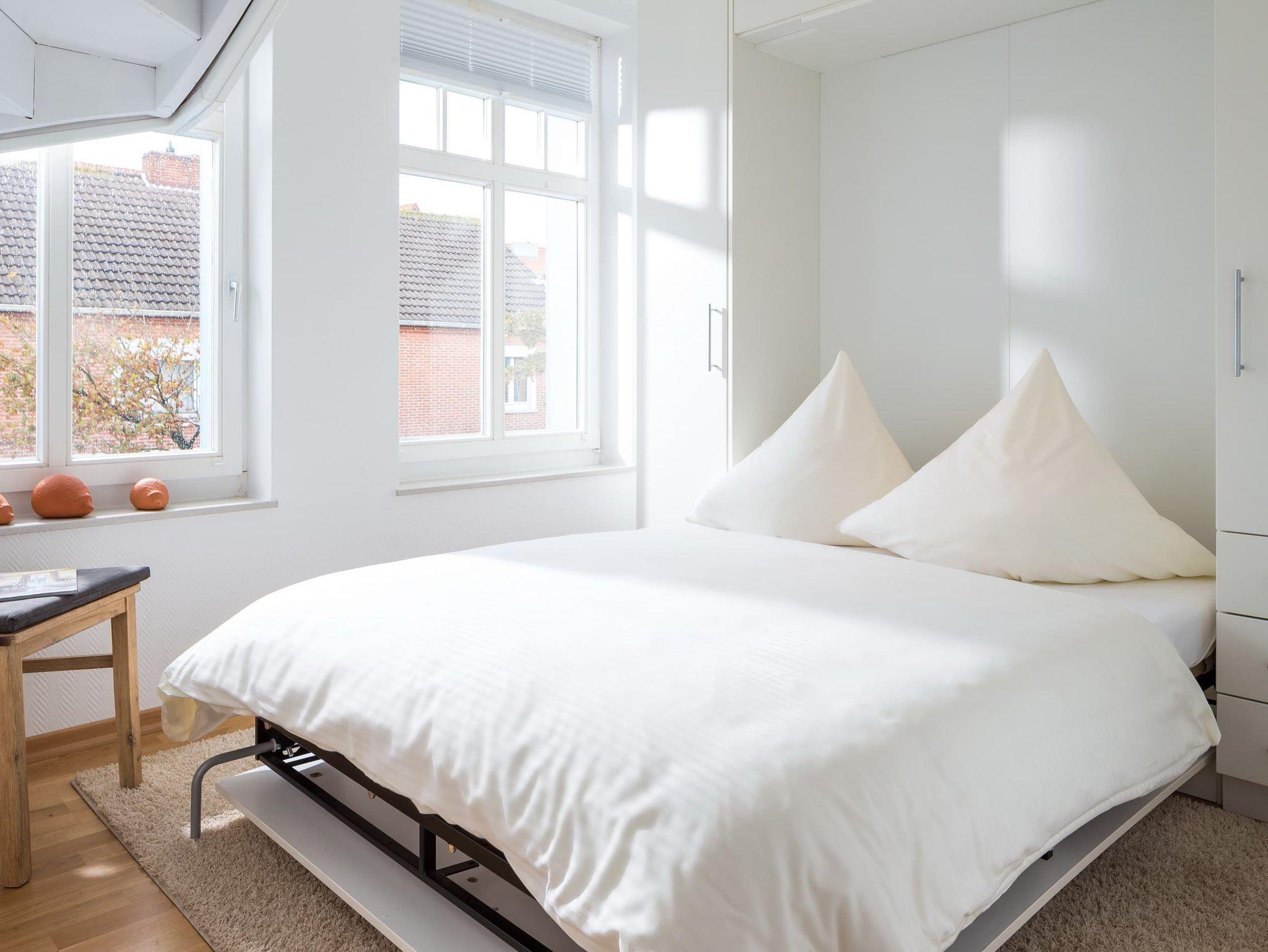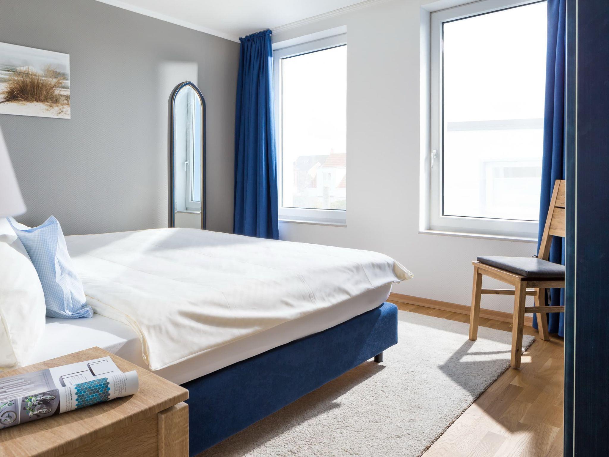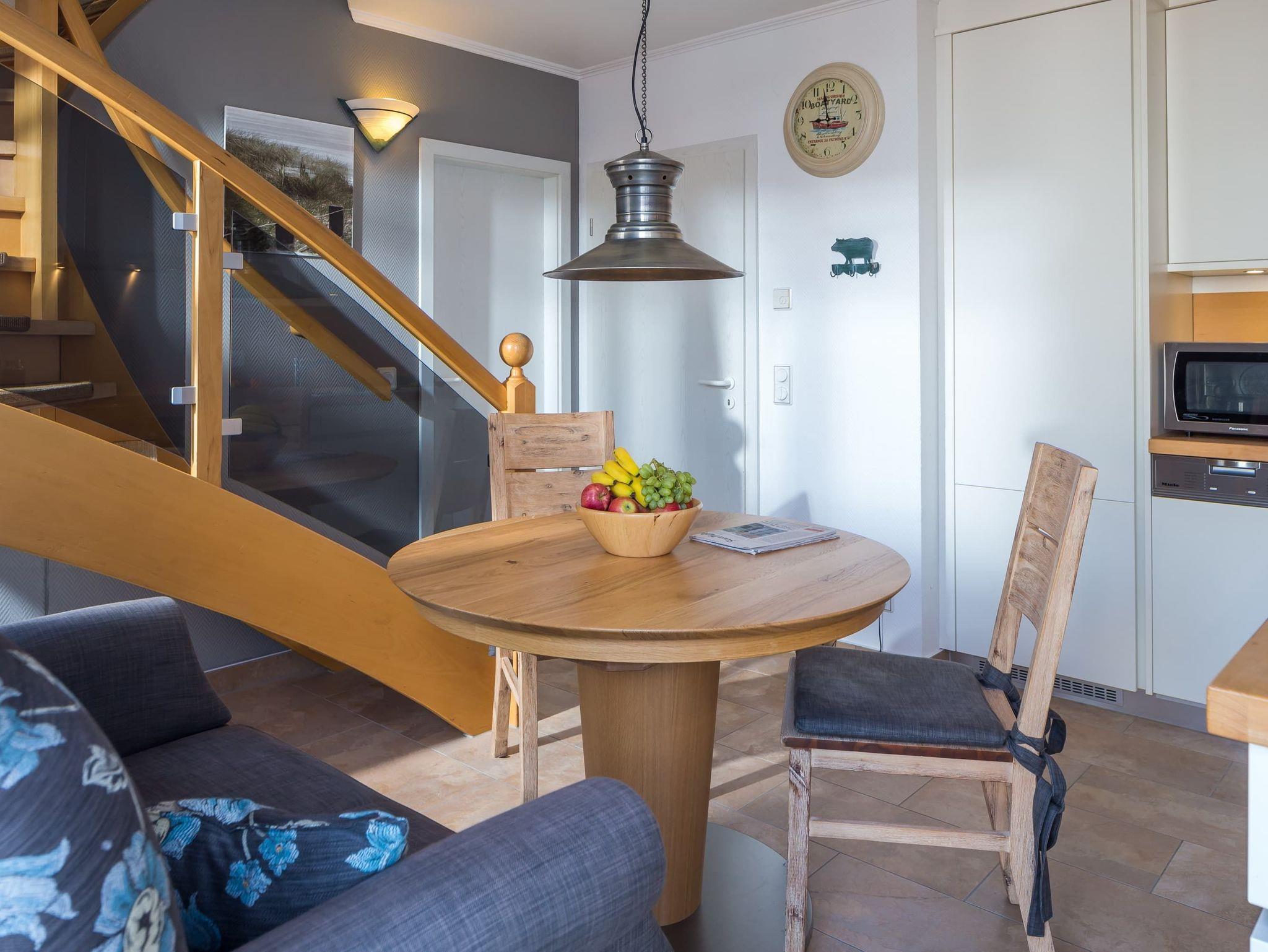 Die geräumige 85m² Maisonette ? Wohnung mit einer 12m² Terrasse im 1. OG, sowie einer 42m² Dach-Terrasse bietet großzügigen Platz für bis zu 4 Personen. Ein Schlafzimmer verfügt über ein Doppelbett und das zweite über ein komfortables 1,40 Kingsize Schrankbett.