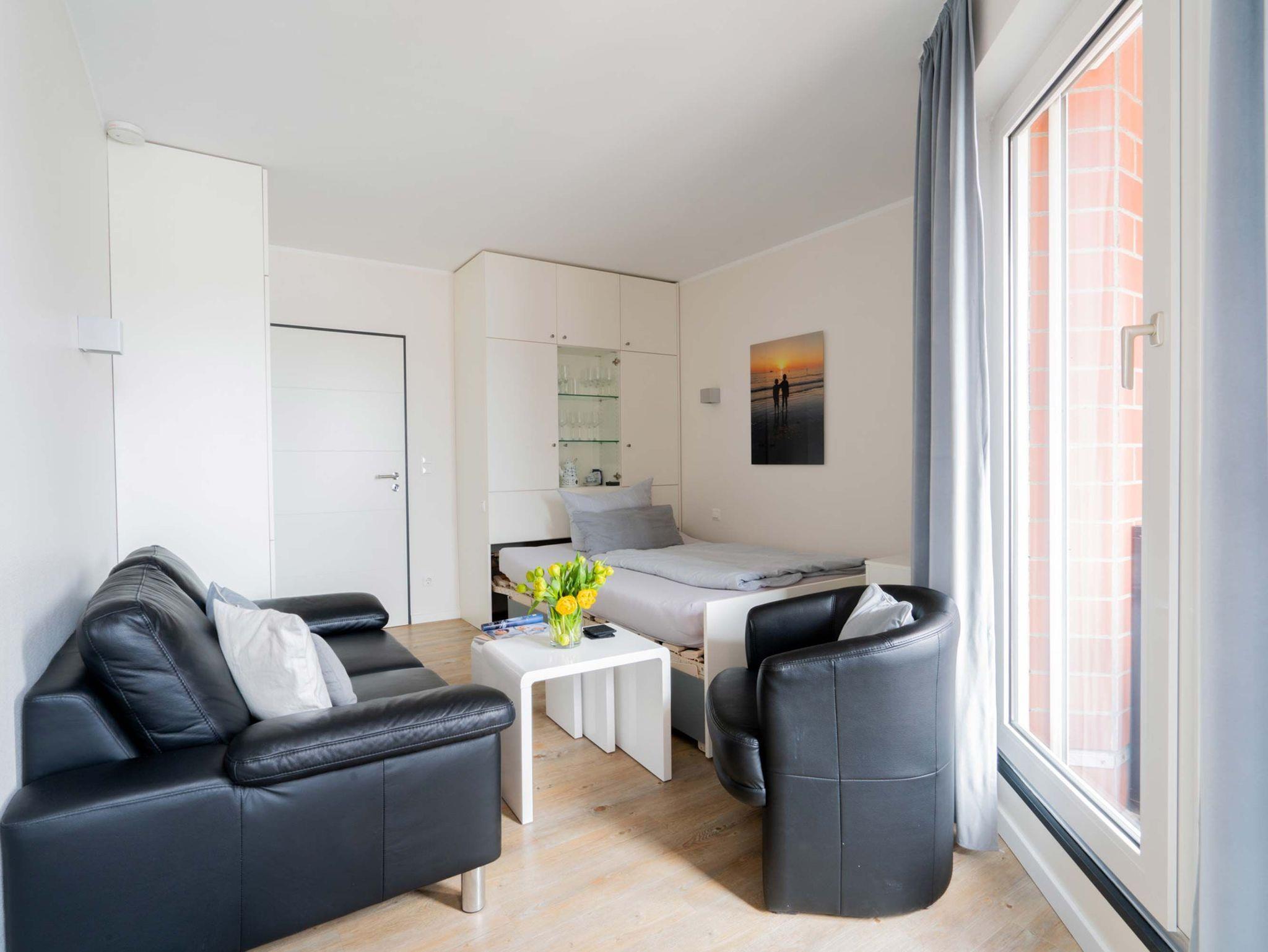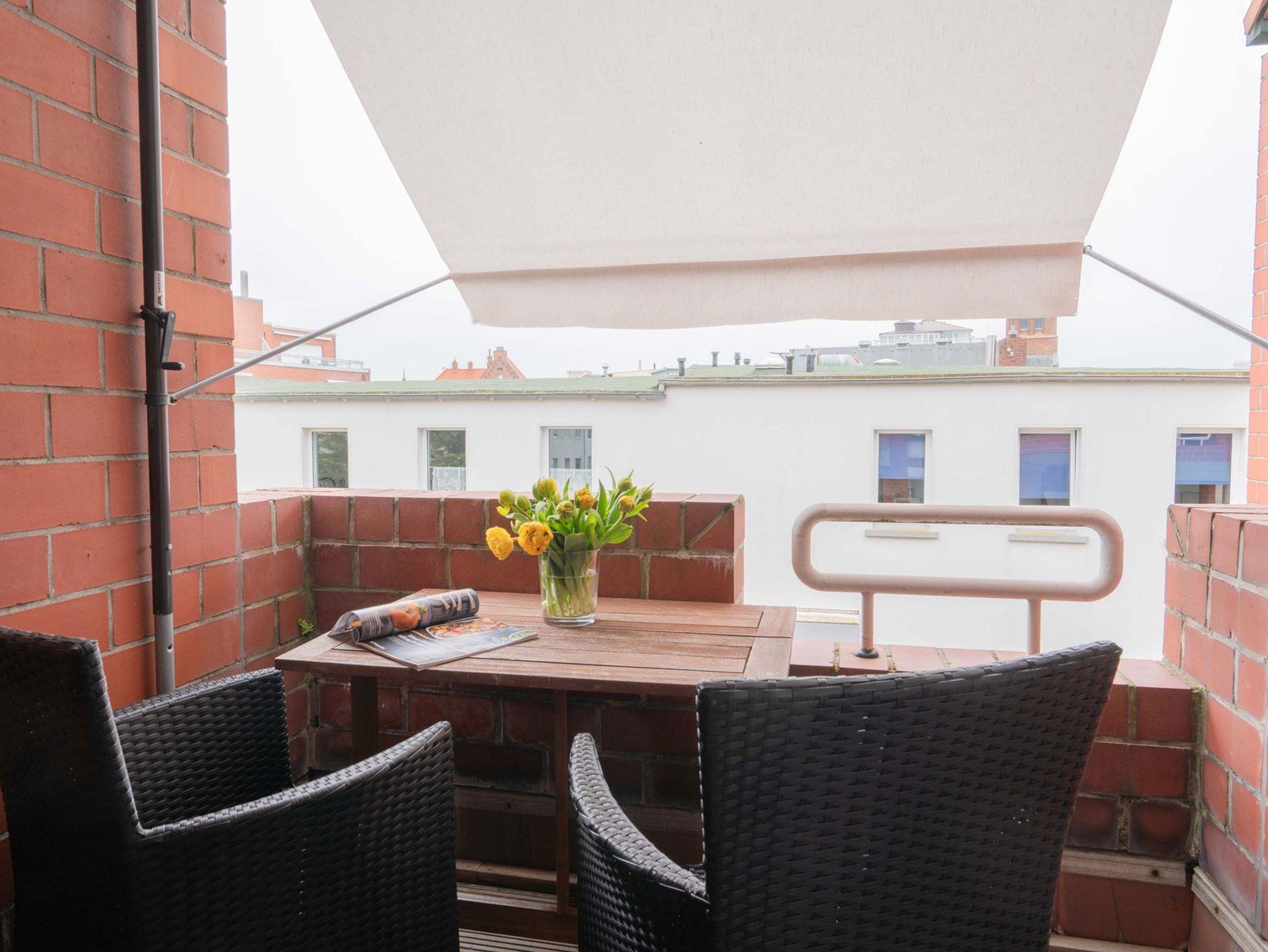 Der kleine, windgeschützte Balkon bietet einen schönen Ausblick auf die Dächer Norderneys und die Inselkirche.