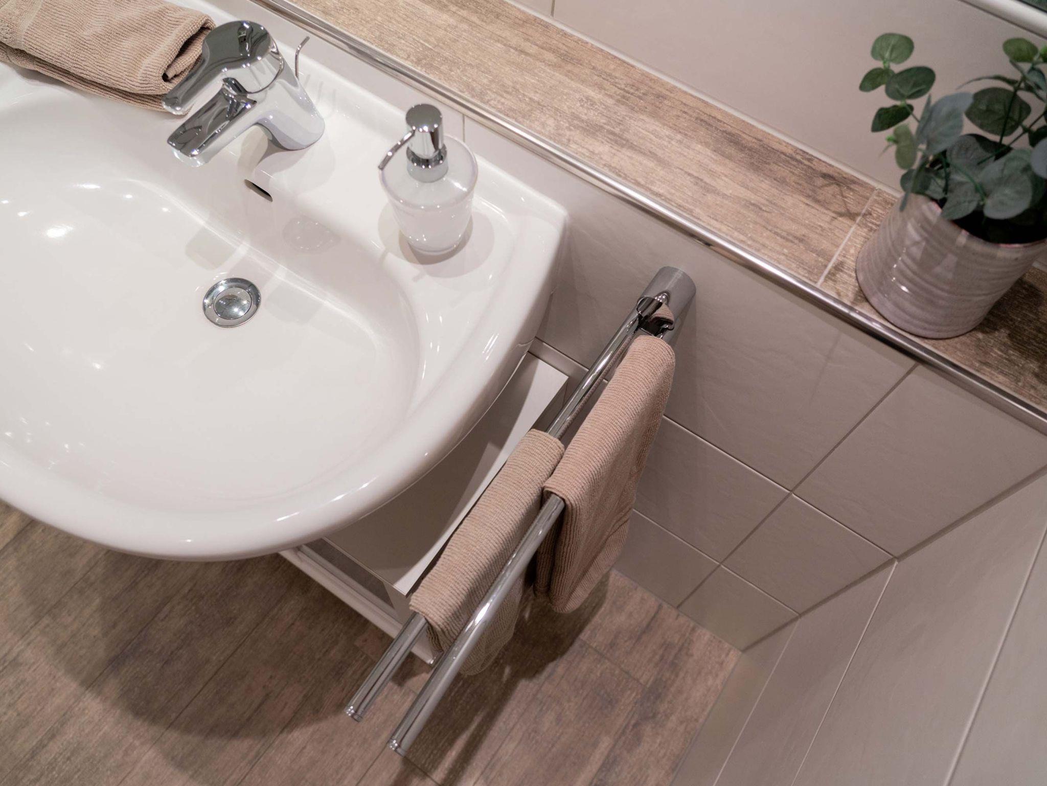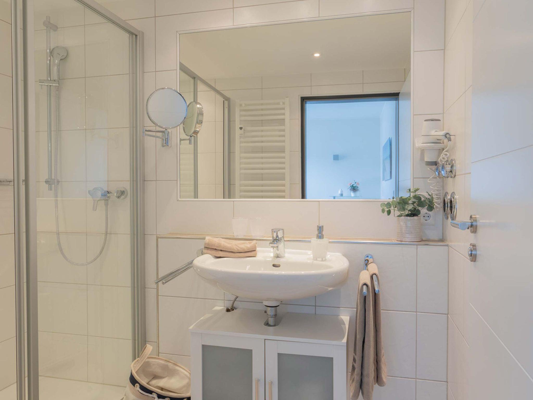 Das moderne Badezimmer verfügt über eine bodentiefe Dusche und ein separat ans Bad angeschlossenes WC.