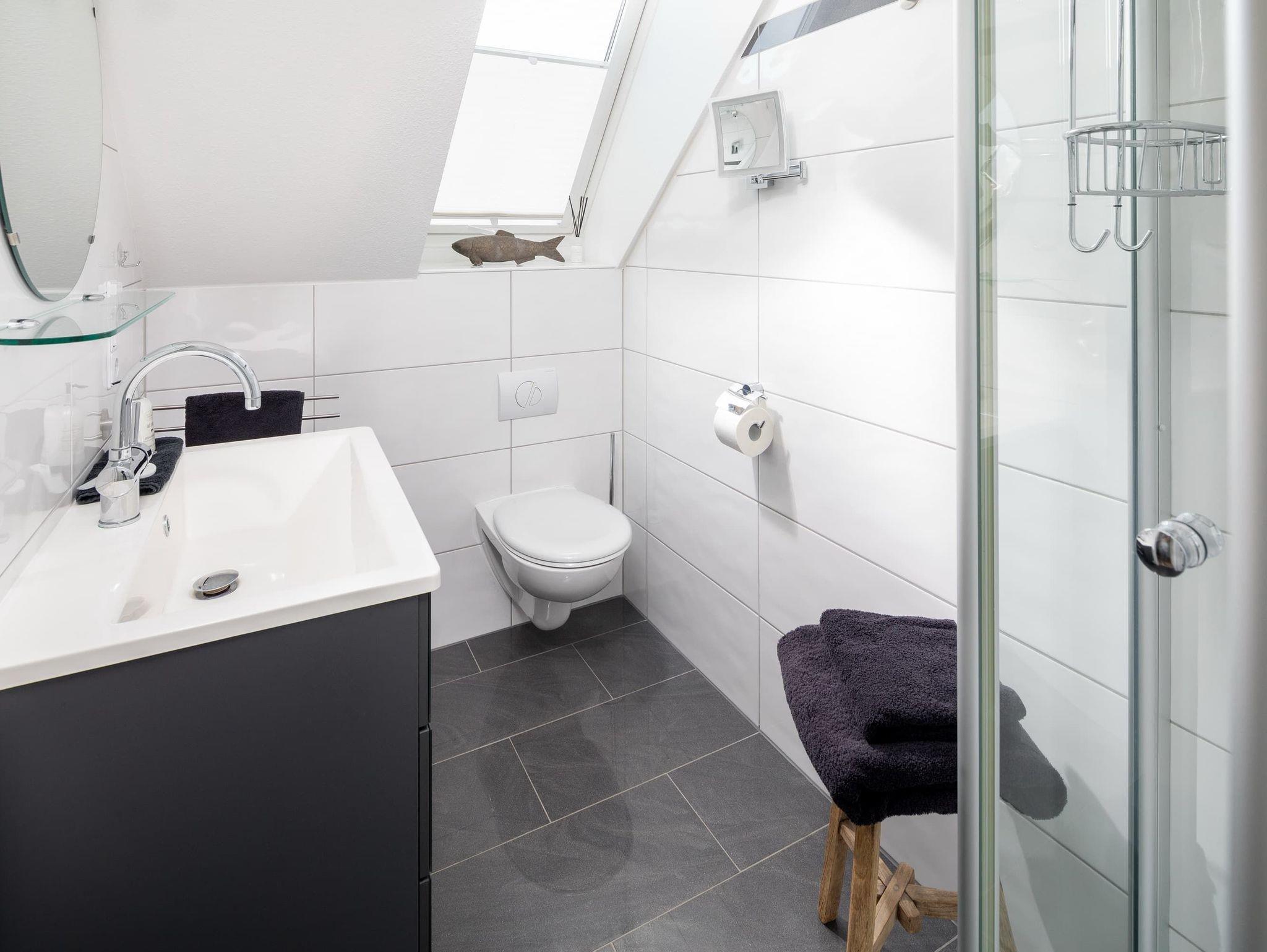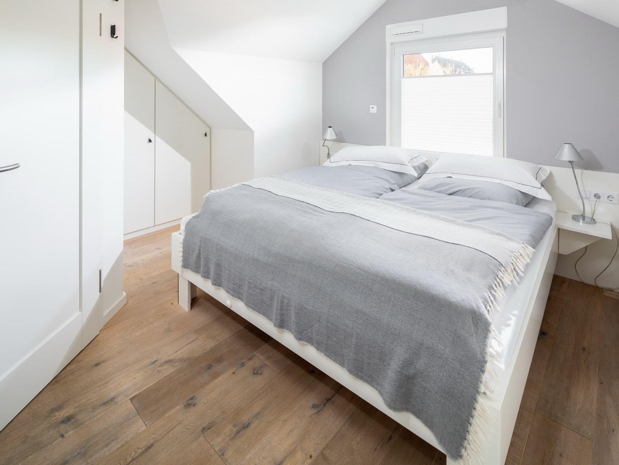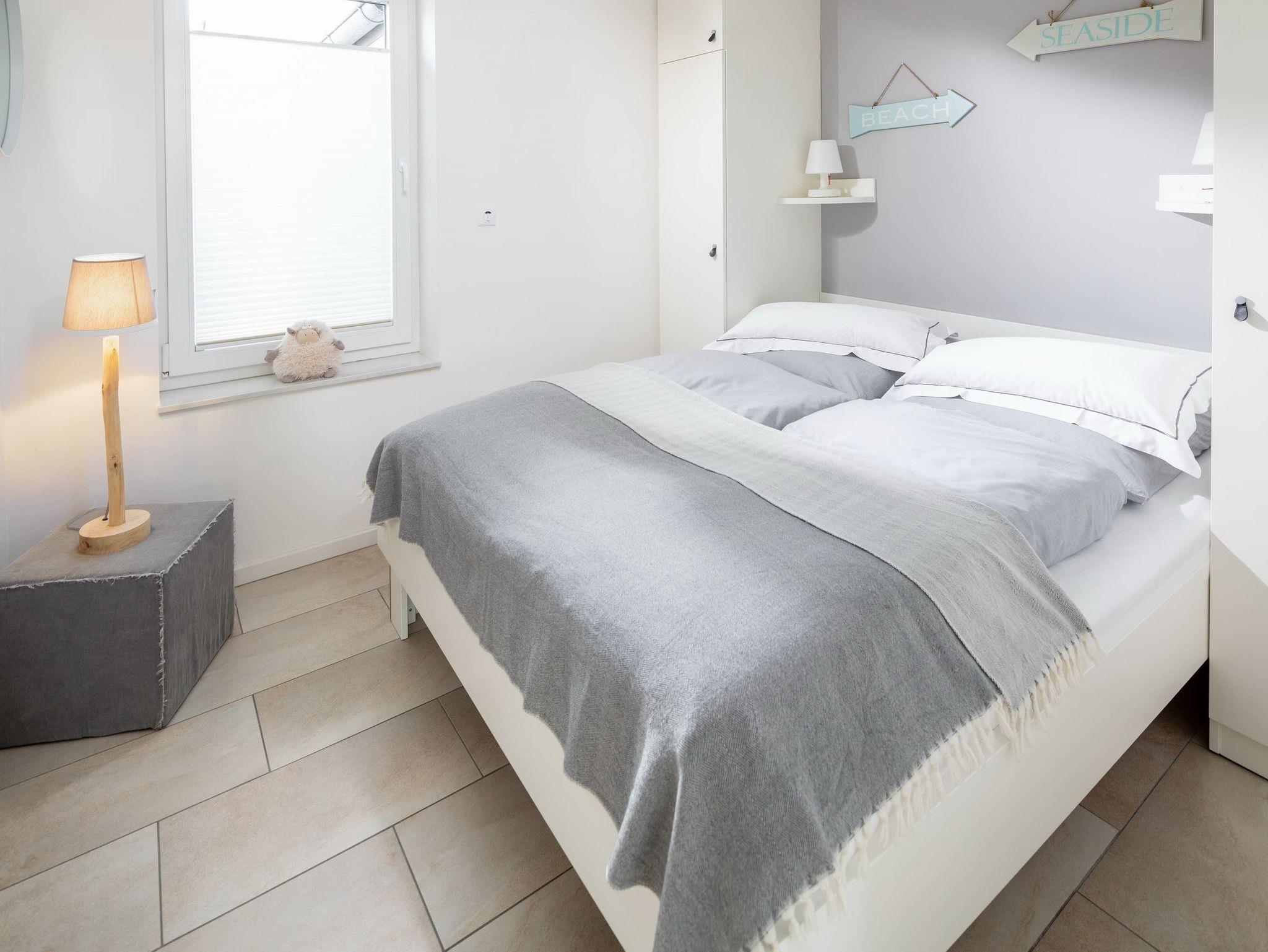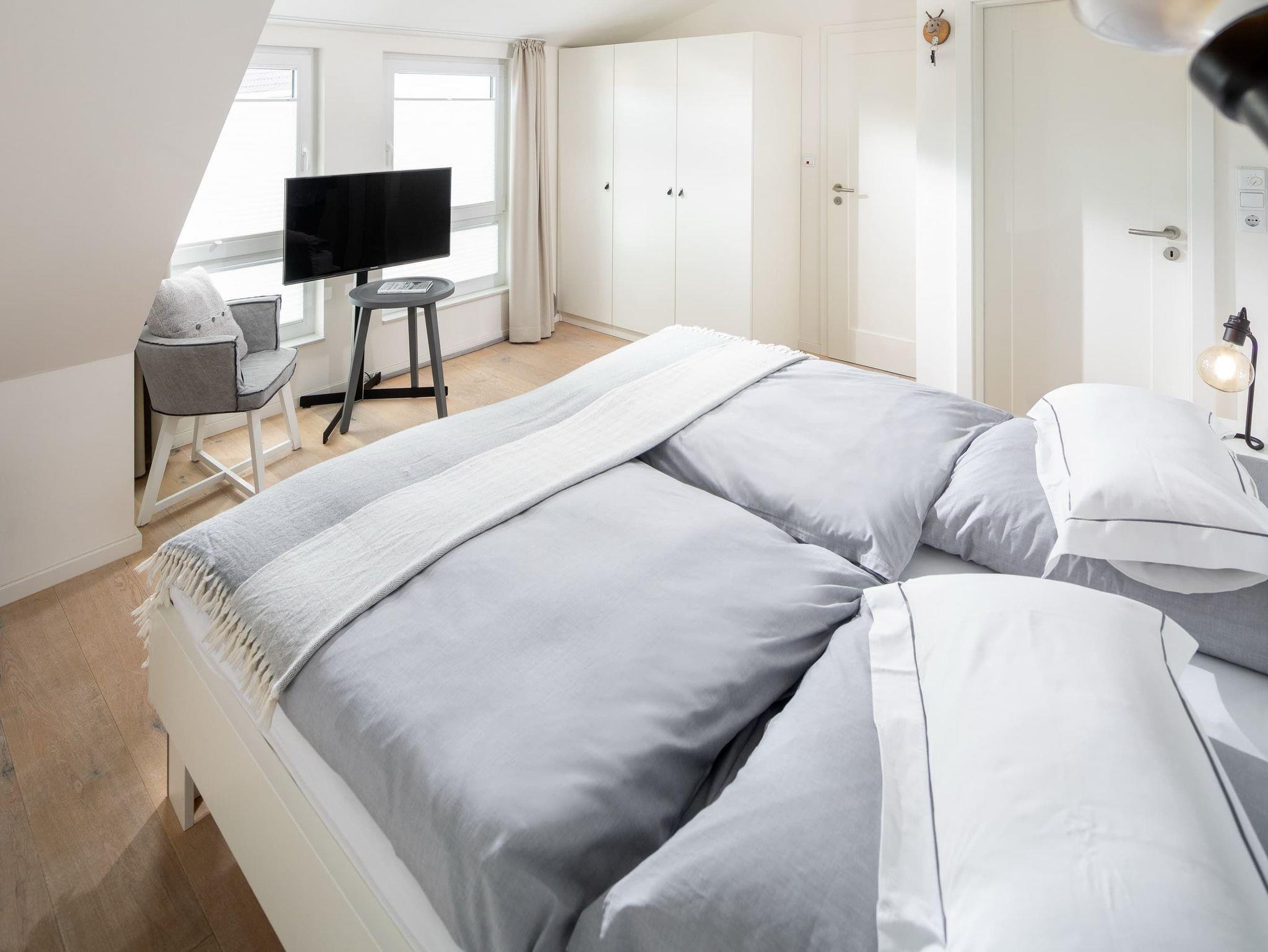 Im unteren Bereich befindet sich eines der 3 Schlafzimmer (Doppelbett, 1,80m) mit angrenzendem Badezimmer (ebenerdig). Im oberen Stockwerk befinden sich zwei weitere Schlafzimmer mit Doppelbetten (1,80m breit) ? jeweils mit einem Bad en suite. Alle Schlafzimmer verfügen über einen Fernseher. Für kleine Gäste stellen wir gern ein Reisebett zur Verfügung und haben natürlich auch auch eine Treppensicherung im Haus.