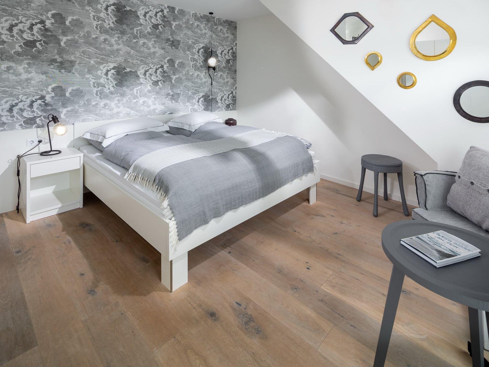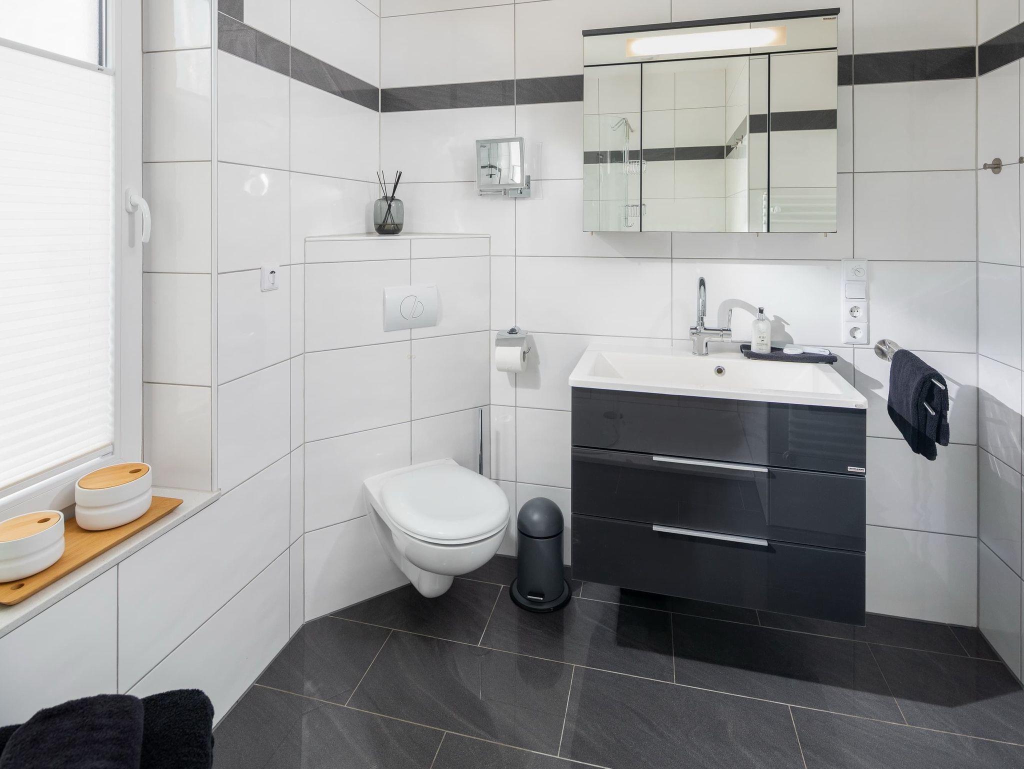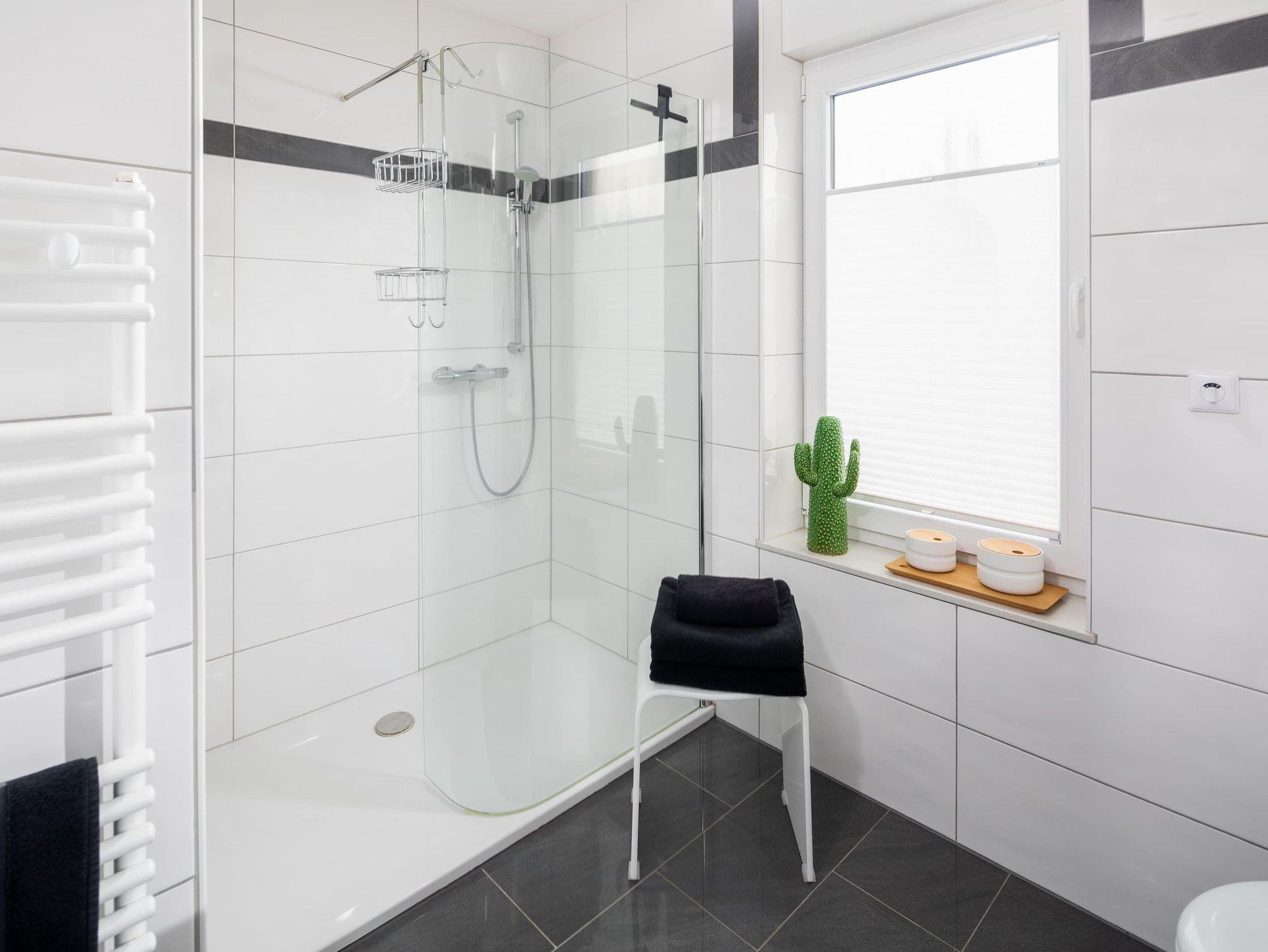 Im unteren Bereich befindet sich eines der 3 Schlafzimmer (Doppelbett, 1,80m) mit angrenzendem Badezimmer (ebenerdig). Im oberen Stockwerk befinden sich zwei weitere Schlafzimmer mit Doppelbetten (1,80m breit) ? jeweils mit einem Bad en suite. Alle Schlafzimmer verfügen über einen Fernseher. Für kleine Gäste stellen wir gern ein Reisebett zur Verfügung und haben natürlich auch auch eine Treppensicherung im Haus.