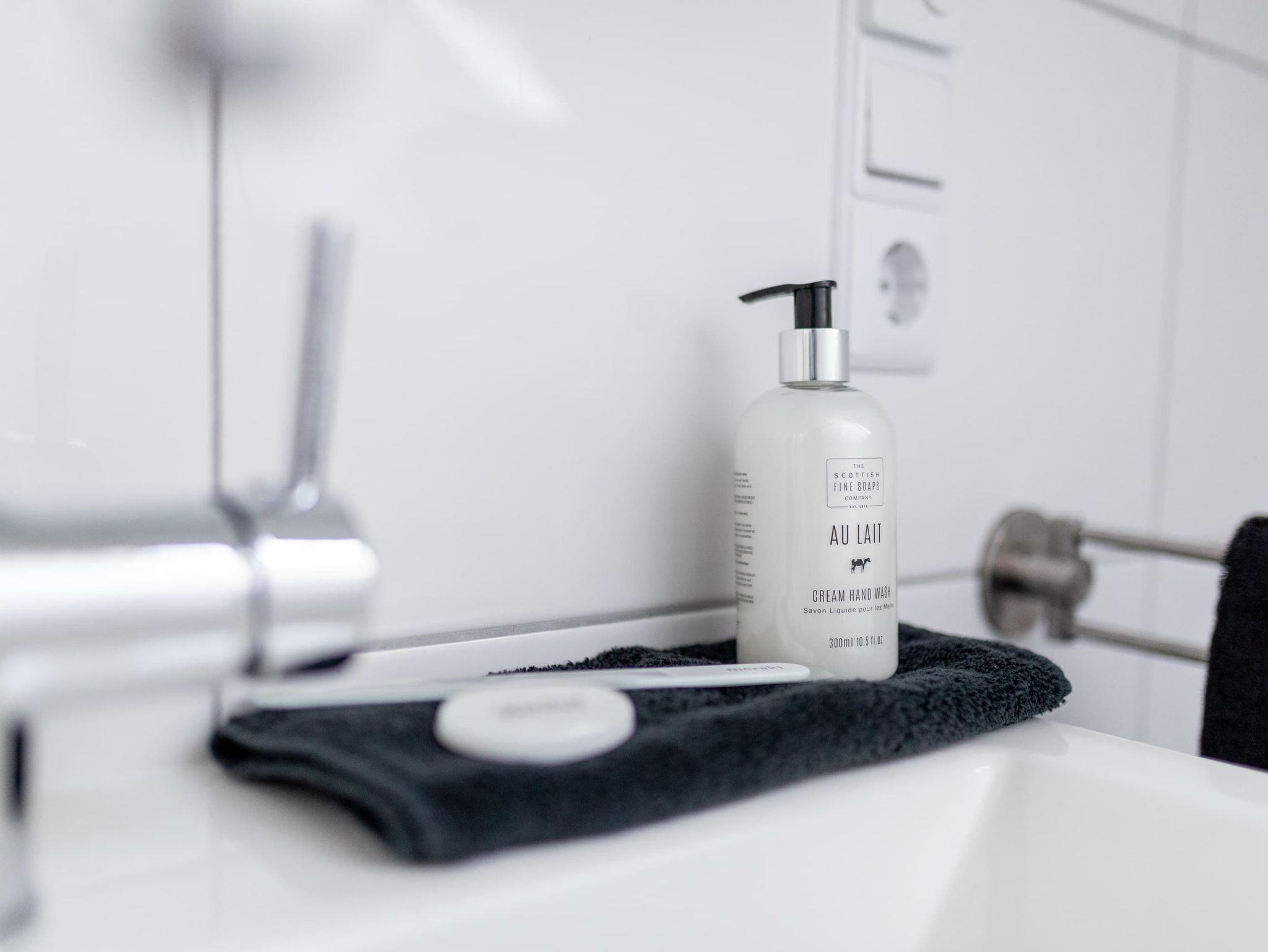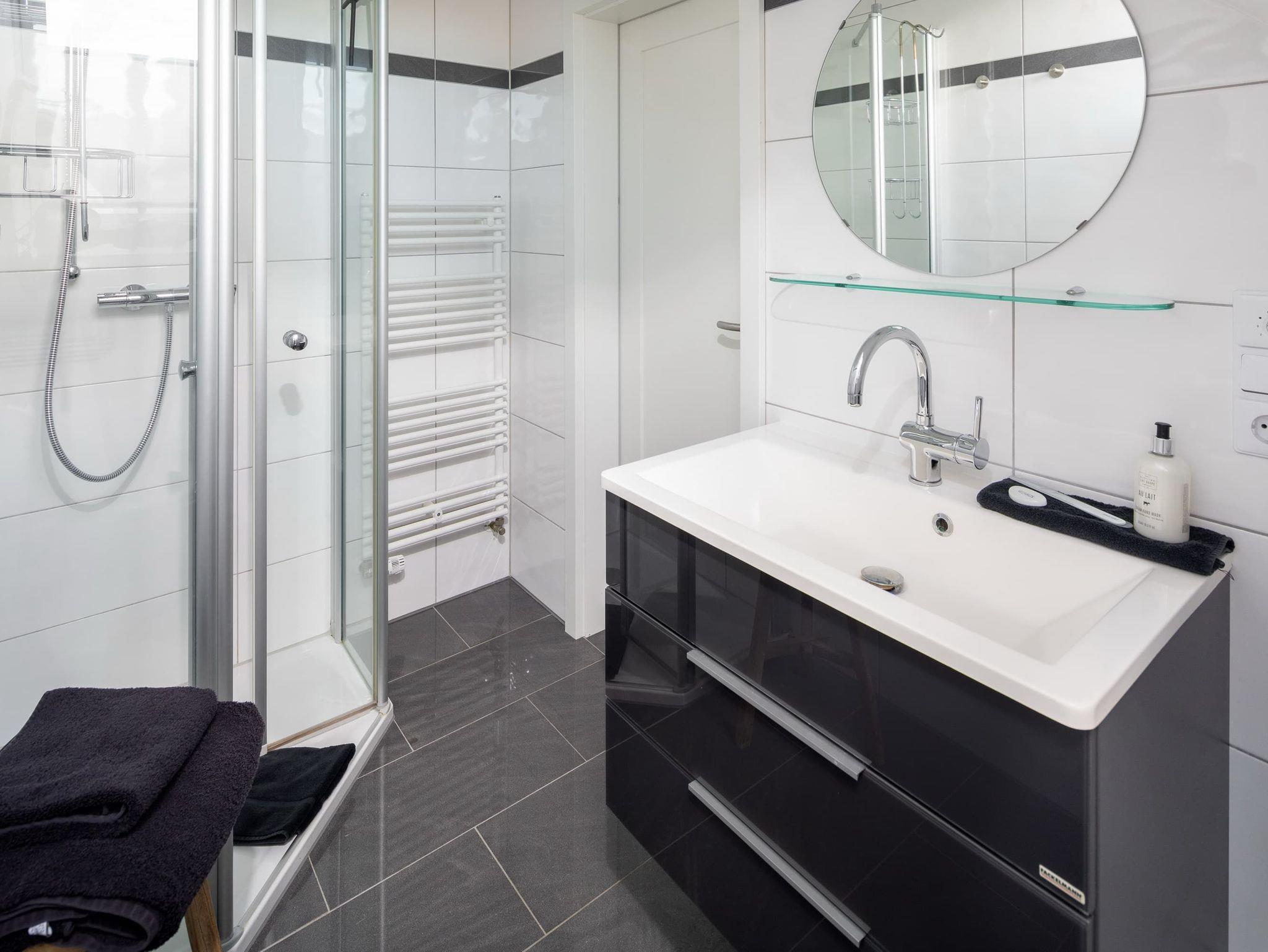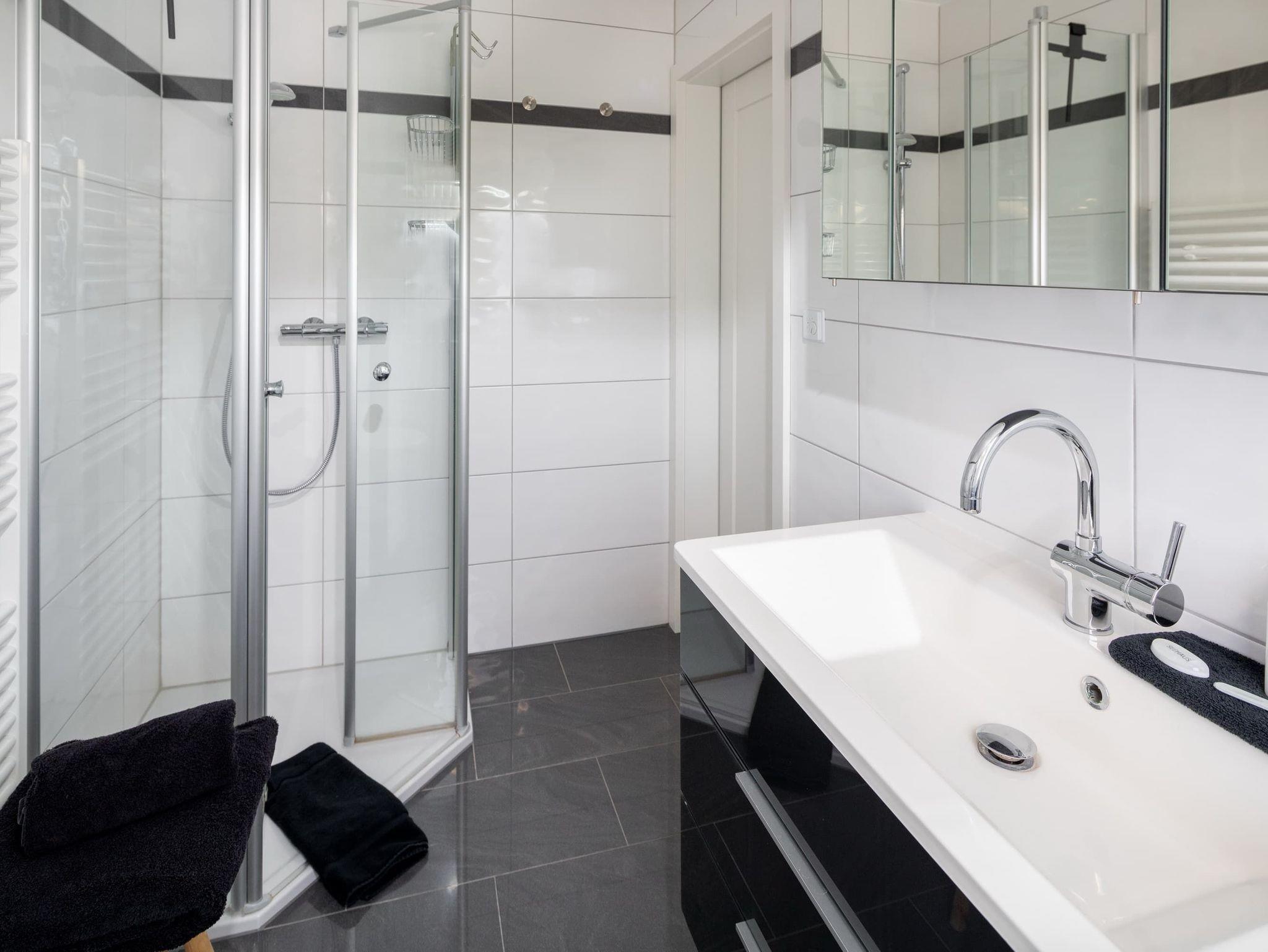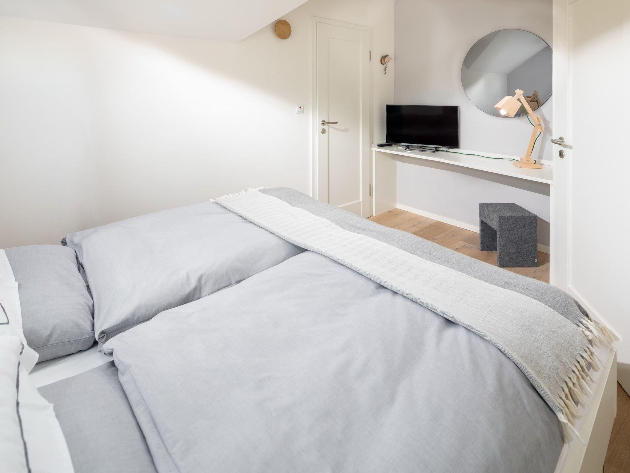 Im unteren Bereich befindet sich eines der 3 Schlafzimmer (Doppelbett, 1,80m) mit angrenzendem Badezimmer (ebenerdig). Im oberen Stockwerk befinden sich zwei weitere Schlafzimmer mit Doppelbetten (1,80m breit) ? jeweils mit einem Bad en suite. Alle Schlafzimmer verfügen über einen Fernseher. Für kleine Gäste stellen wir gern ein Reisebett zur Verfügung und haben natürlich auch auch eine Treppensicherung im Haus.