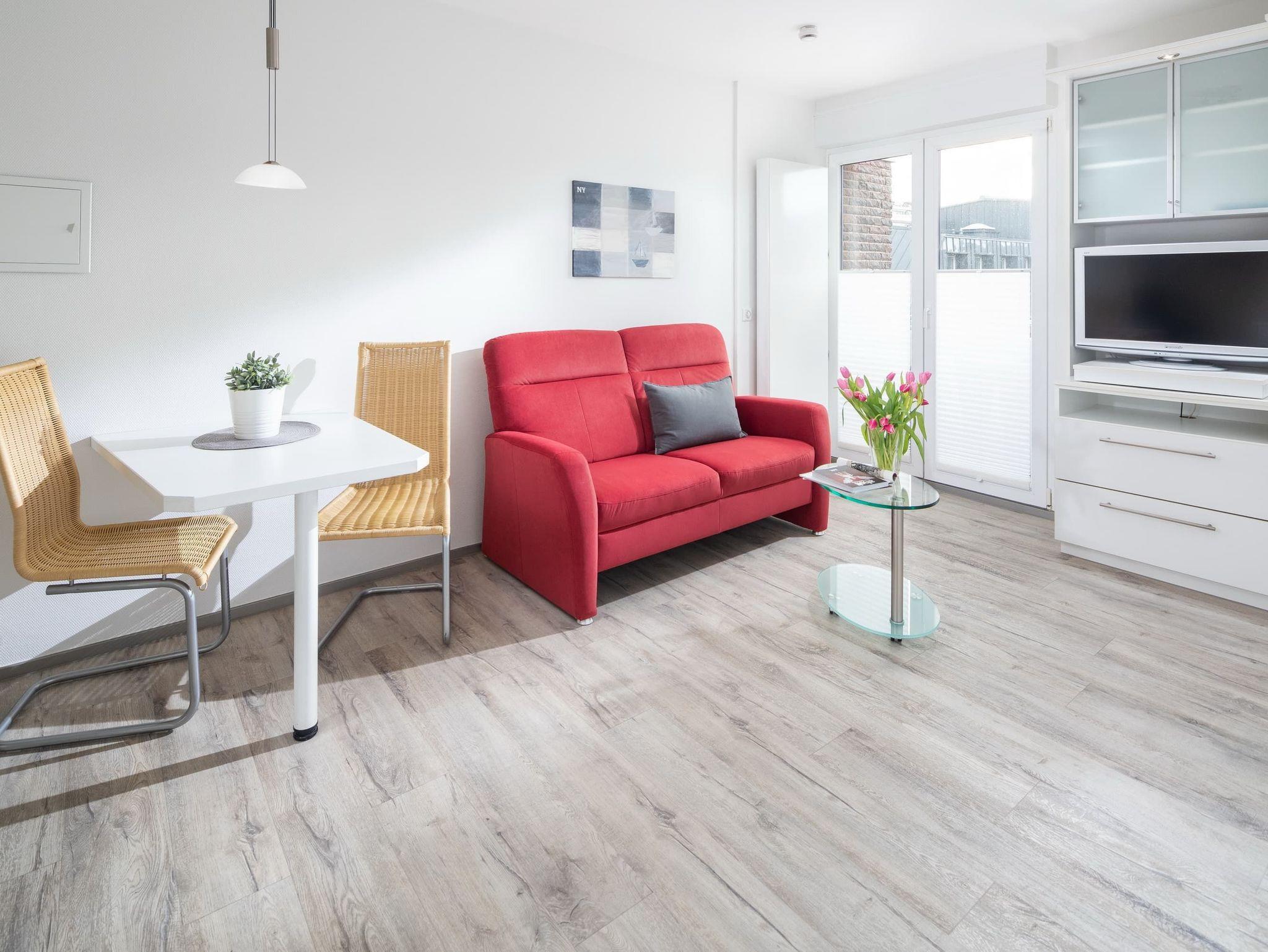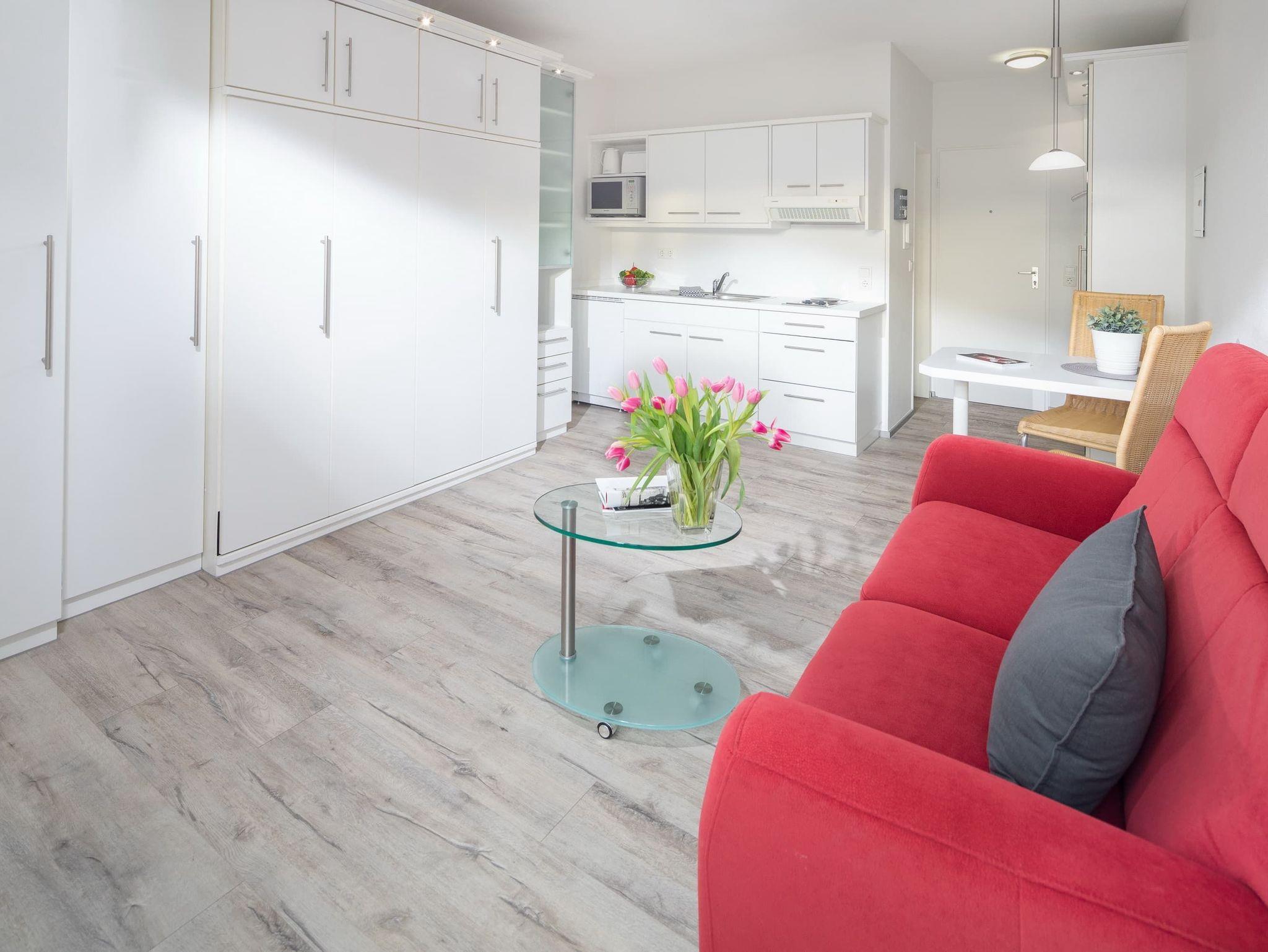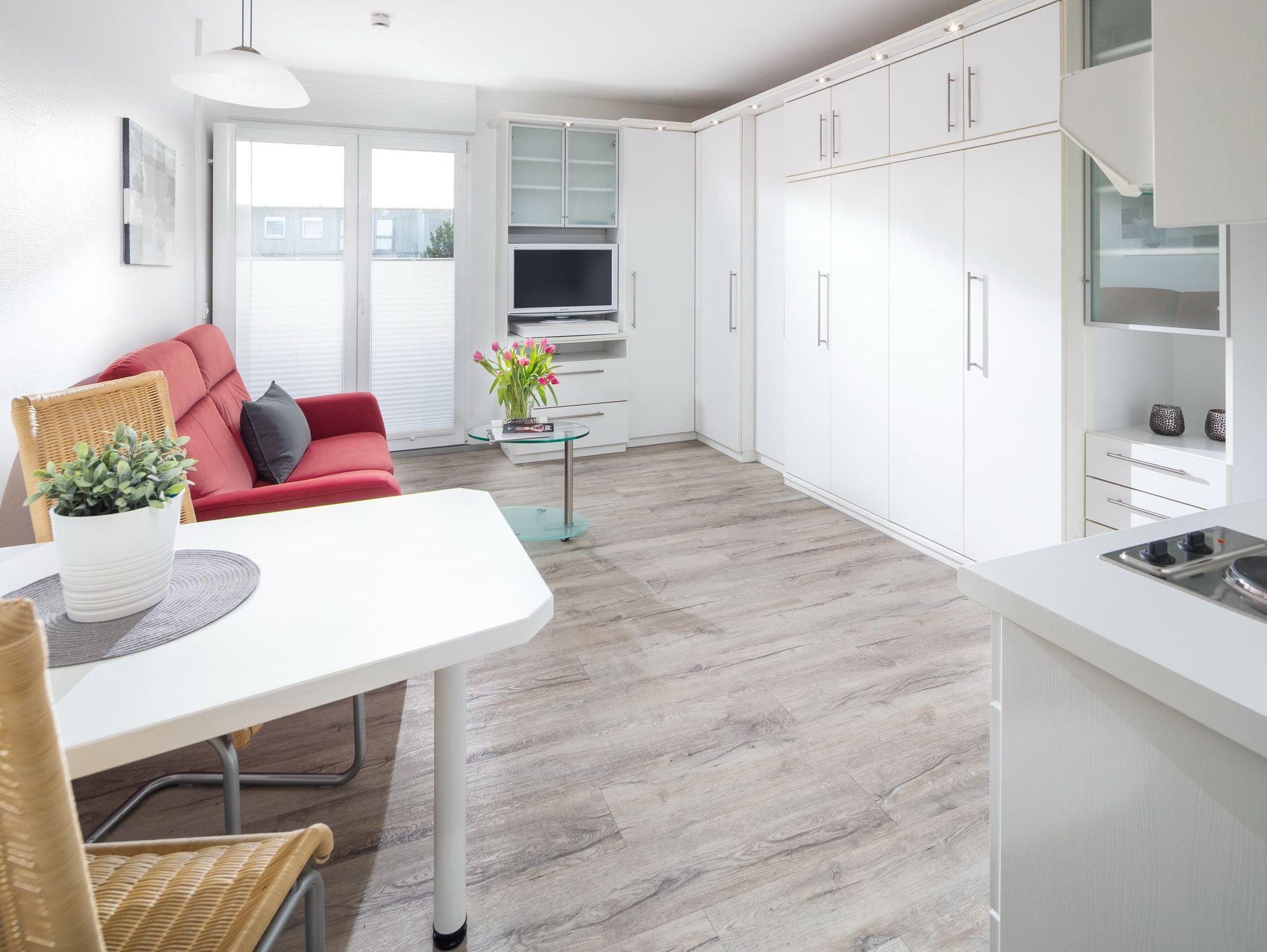 Das gemütliche Einraum-Apartment bietet Platz für 2 Personen. Neben einer gemütlichen Couch und TV steht ein platzsparendes Doppel-Schrankbett zur Verfügung. Am Esstisch kann man gemeinsam essen und spielen. Die Wohnung hat eine kleine Küchenzeile mit allen nötigen Geräten. Das Duschbad ist weiß gefliest. Die Wohnung bietet einen kleinen französischen Balkon zum Luftschnappen.