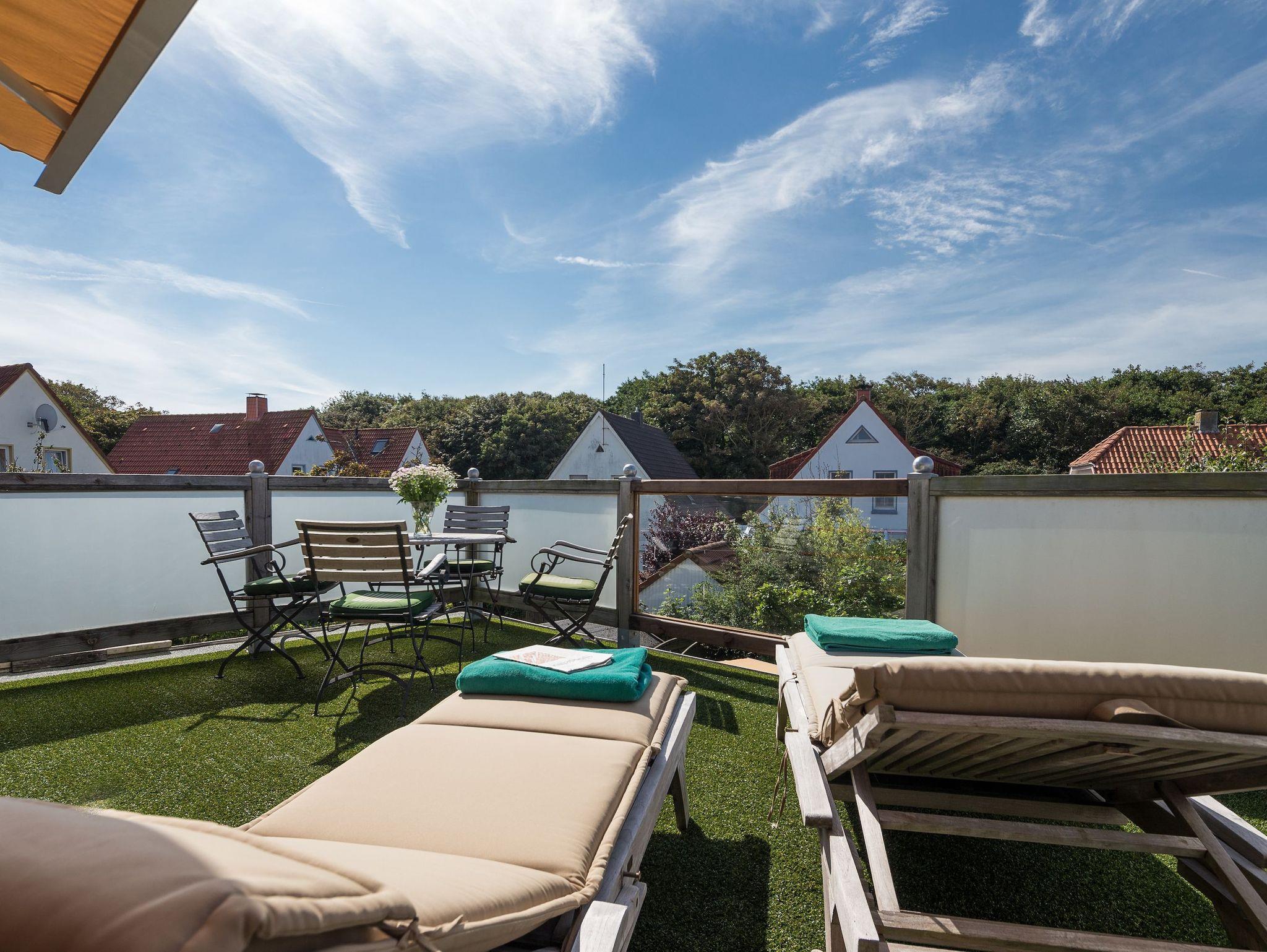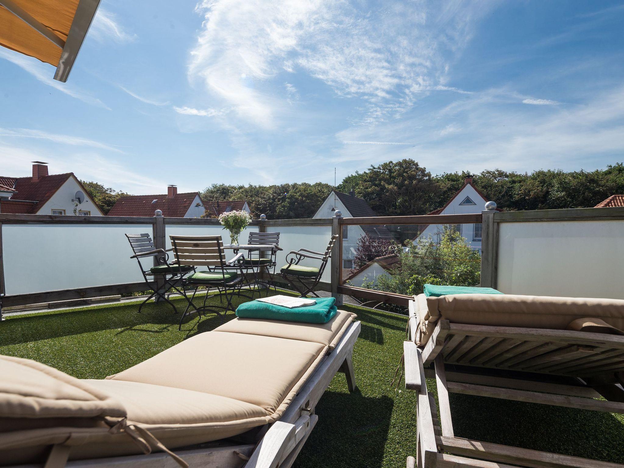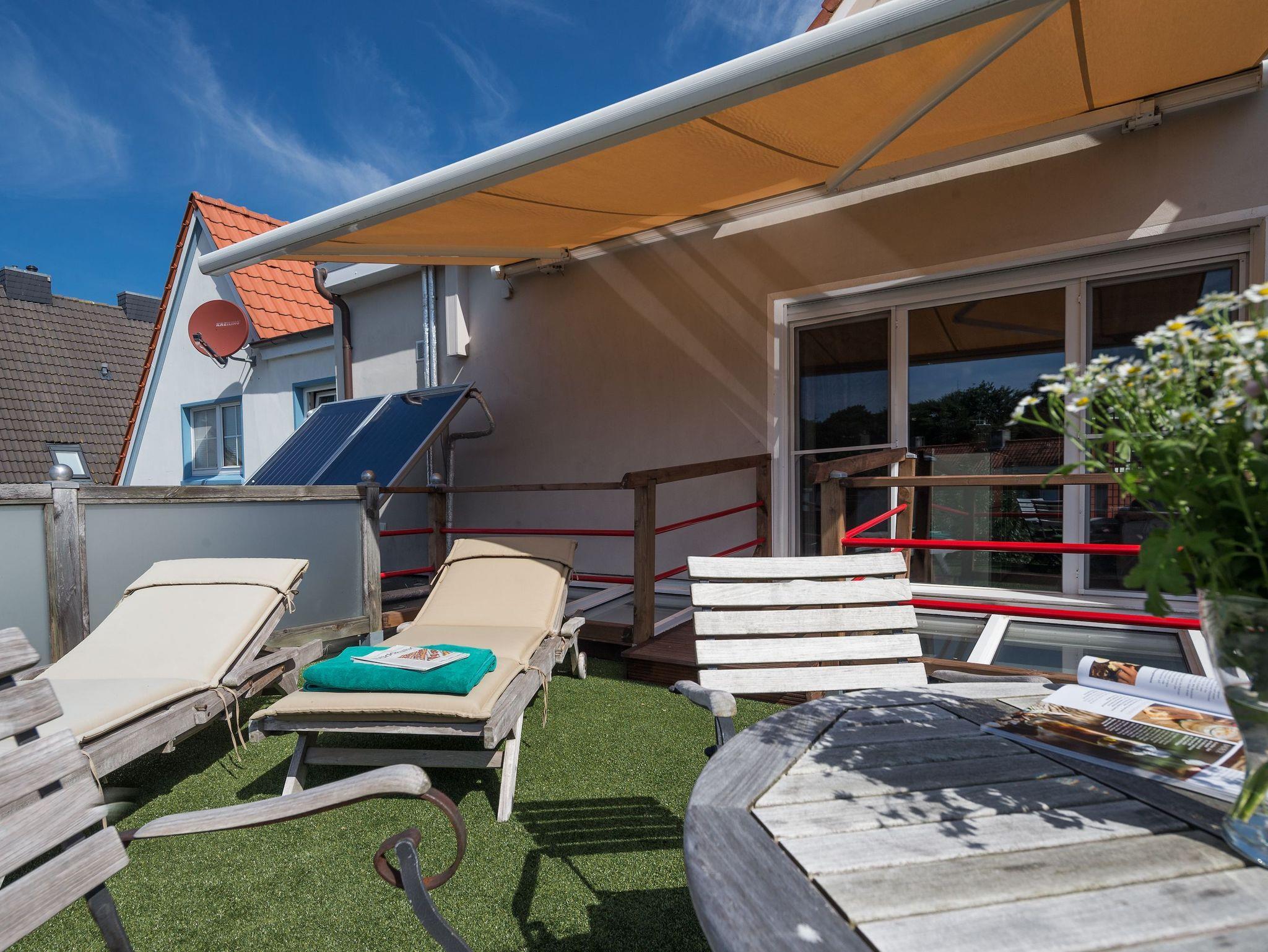 Herzstück der Wohnung ist der offene Wohn- und Essbereich, in dem sich ein hochwertig ausgestatteter Küchenbereich mit Induktionsherd, amerikanischer Theke und direktem Zugang zur 18 Quadratmeter großen Dachterrasse befindet. Ob entspanntes Frühstück in der Morgensonne oder ein Sundowner mit Blick über die Dächer Norderneys ? die Sitzgruppe, Sonnenliege und Markise machen diese Terrasse zu Ihrem Lieblingsplatz.