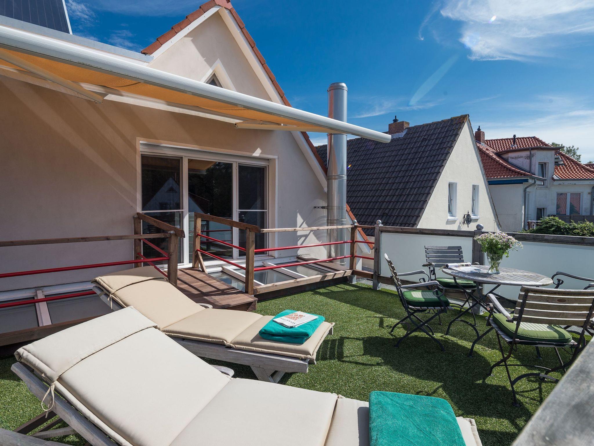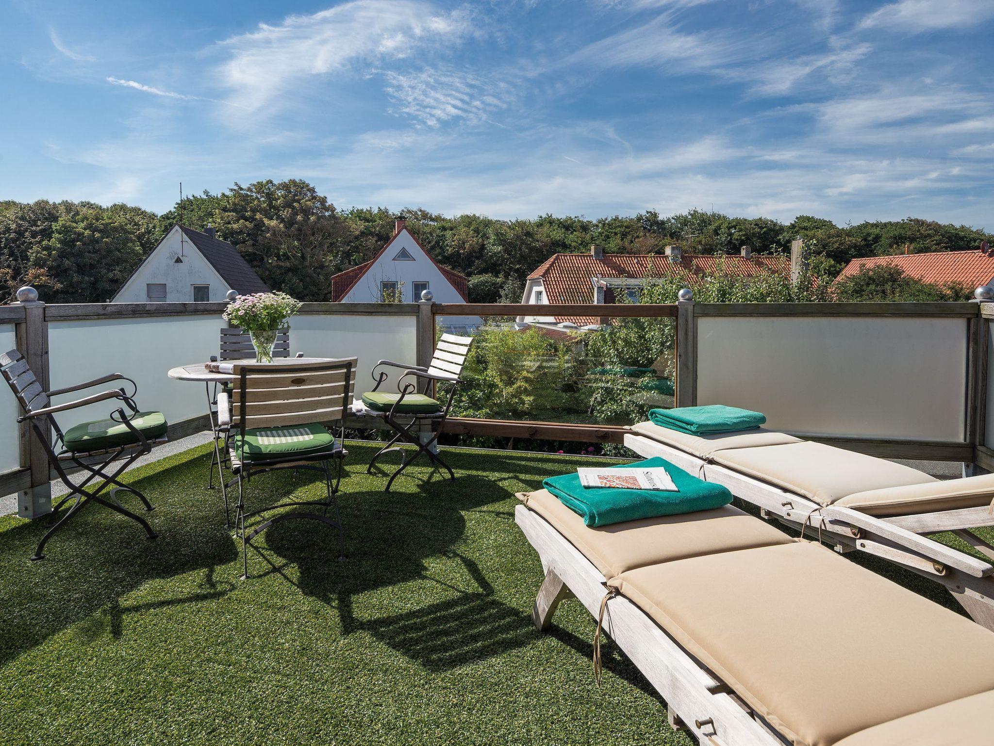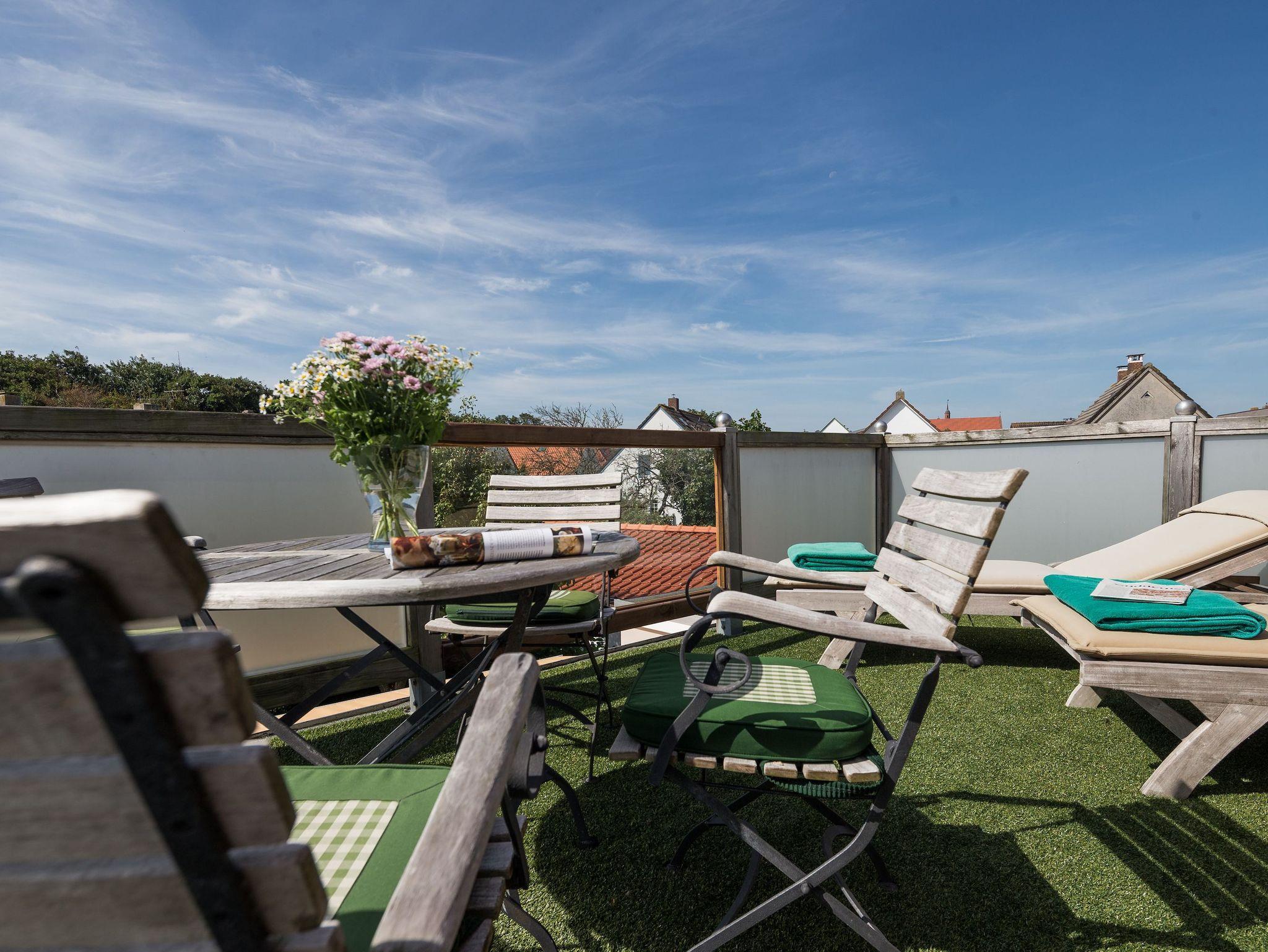 Herzstück der Wohnung ist der offene Wohn- und Essbereich, in dem sich ein hochwertig ausgestatteter Küchenbereich mit Induktionsherd, amerikanischer Theke und direktem Zugang zur 18 Quadratmeter großen Dachterrasse befindet. Ob entspanntes Frühstück in der Morgensonne oder ein Sundowner mit Blick über die Dächer Norderneys ? die Sitzgruppe, Sonnenliege und Markise machen diese Terrasse zu Ihrem Lieblingsplatz.