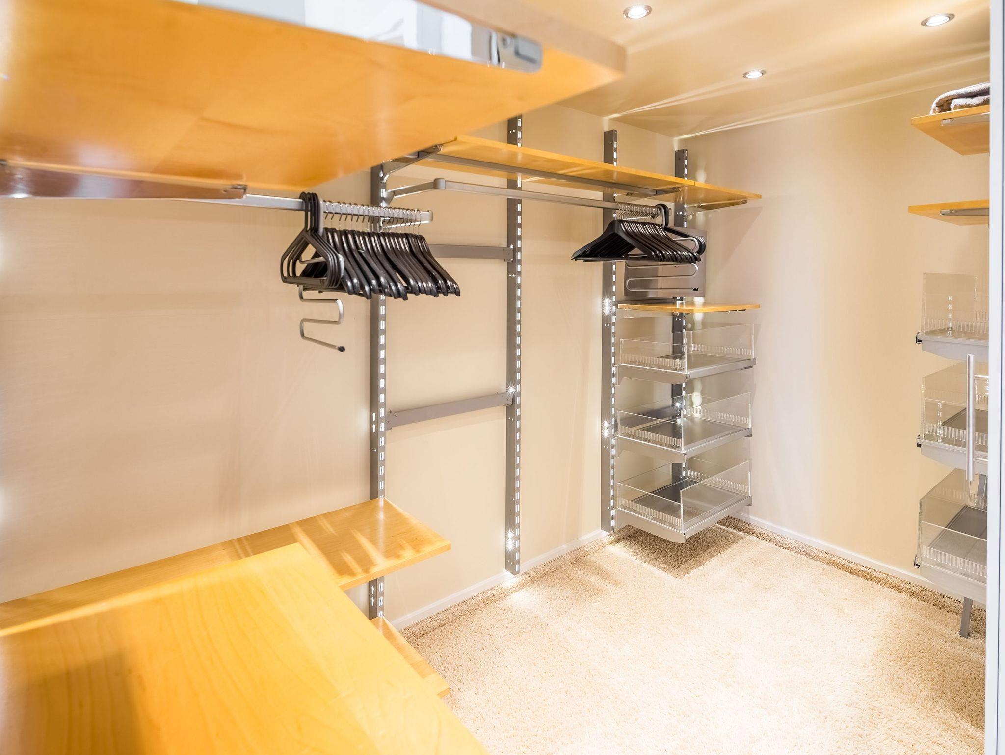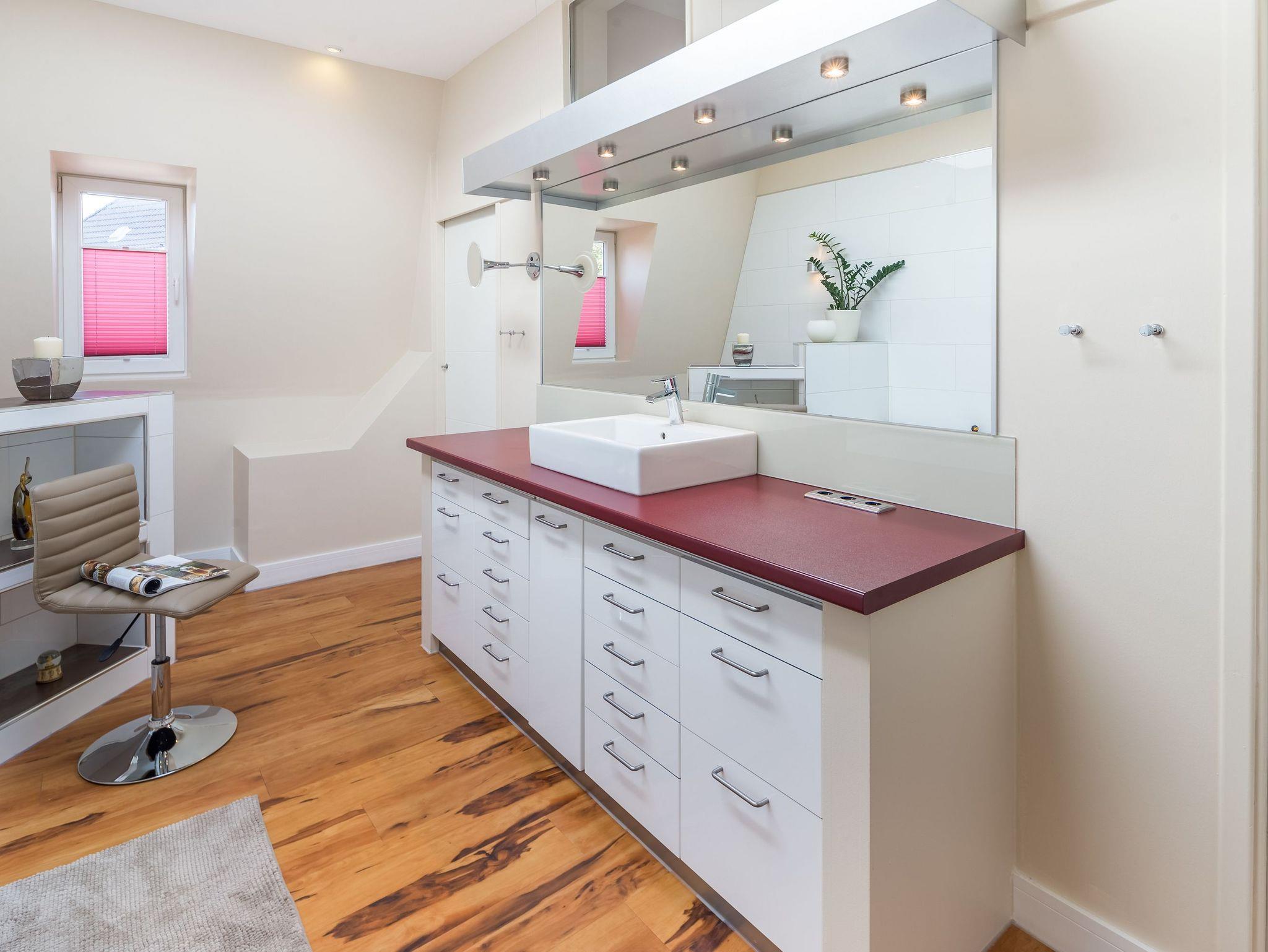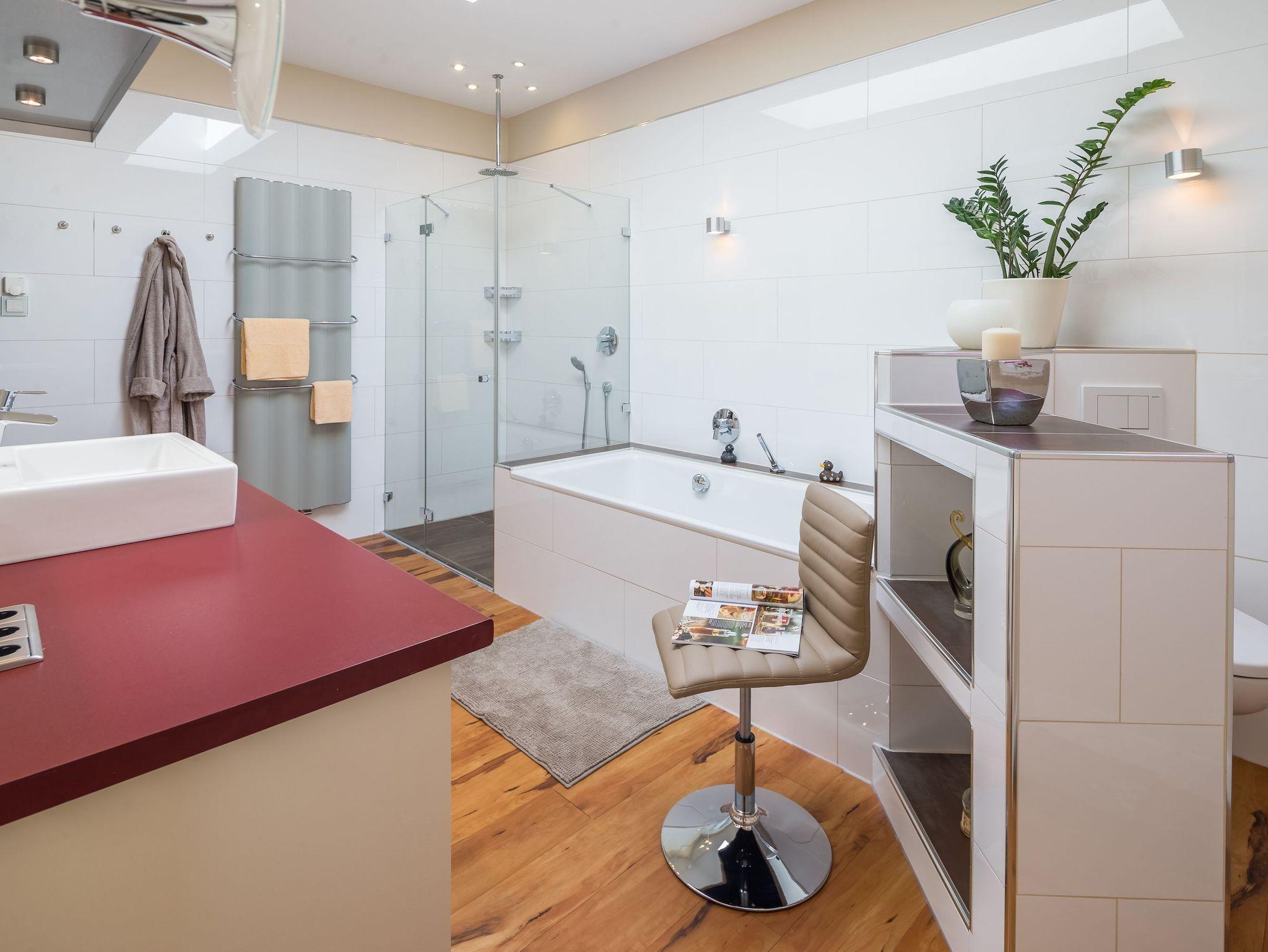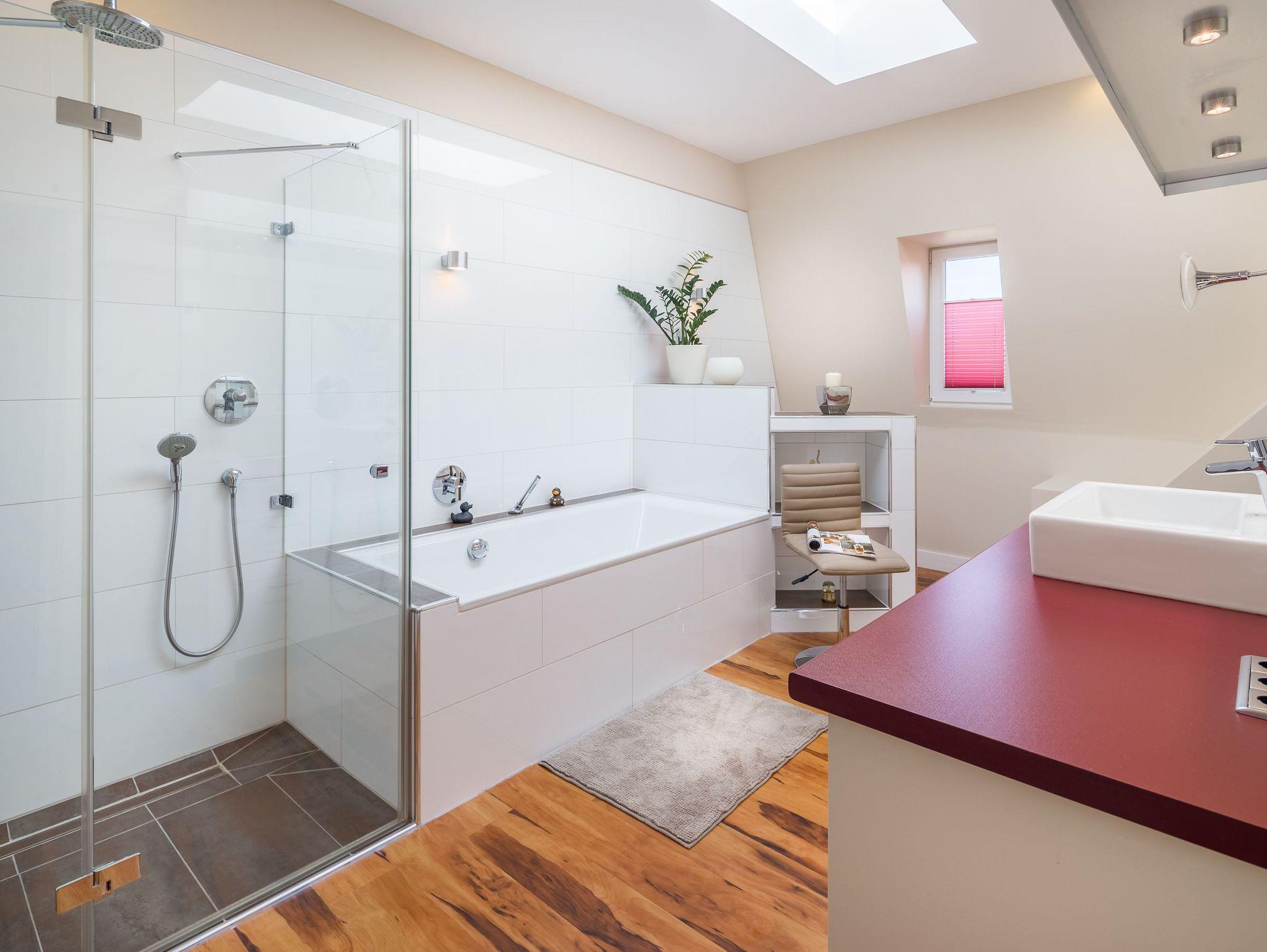 Das moderne Badezimmer überzeugt mit Dusche, Badewanne und einem großzügigen Schminkbereich. Besonders praktisch: ein begehbarer Kleiderschrank, in dem Sie Ihre Urlaubsgarderobe bestens unterbringen können.