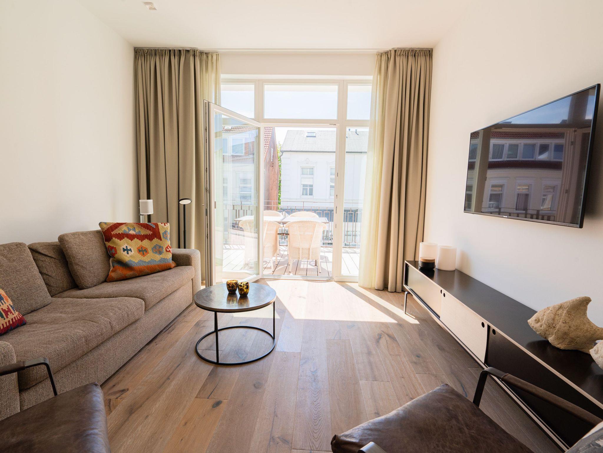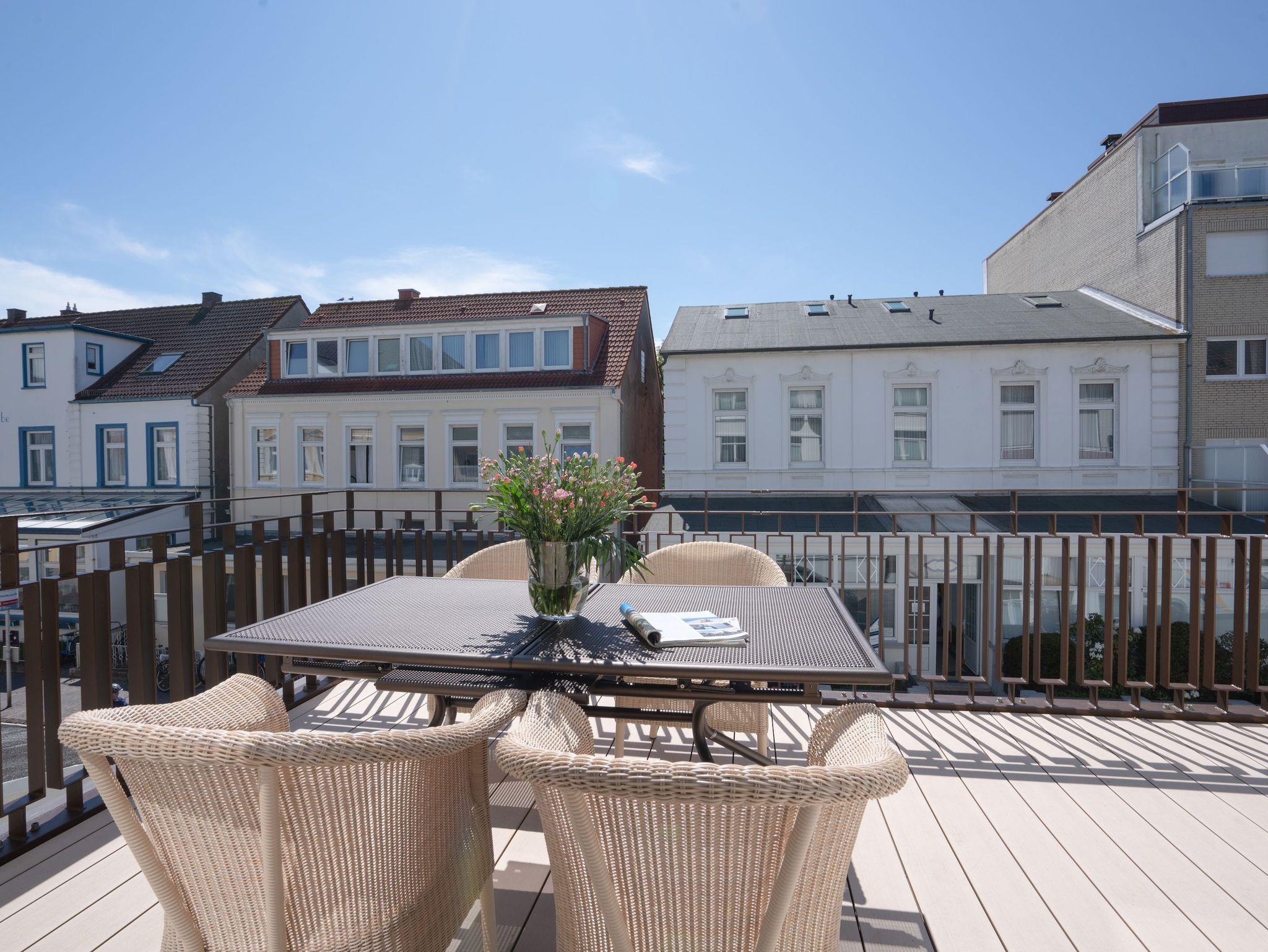 Diese exklusive „Meerliebe“ für bis zu 4 Personen lässt keine Wünsche offen. Sie befindet sich im 01. Obergeschoss und überzeugt durch den großzügigen Grundriss mit großen Wohn- und Esszimmer mit integrierter Küche, zwei Schlafräumen, 2 Badezimmern (en Suite) sowie der großen Dachterrasse, die einen kleinen, seitlichen Blick auf das Meer zulässt.