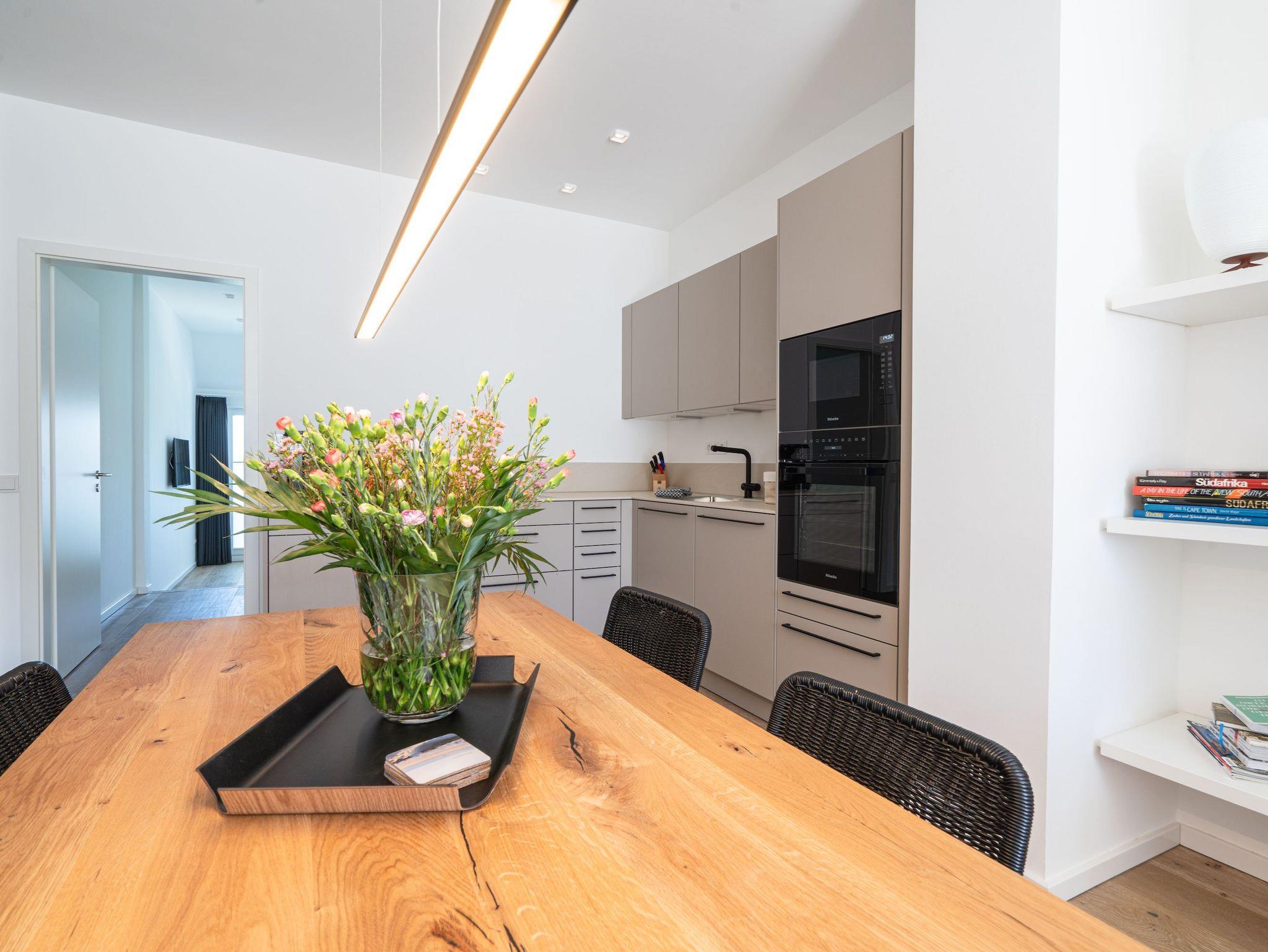 Das zur Dachterrasse gelegene, lichtdurchflutete Wohnzimmer bietet neben der gemütlichen Sofaecke mit TV und zwei Sesseln einen geräumigen Esstisch und eine angrenzende, großzügige Wohnküche. Ein perfekter Ort zum Zusammensein, Kochen, Spielen und Entspannen. Die Einbauküche bietet ein Glaskeramikkochfeld mit 4 Kochzonen, Backofen, Mikrowelle, Spülmaschine und Kühl-/Gefrierkombination.