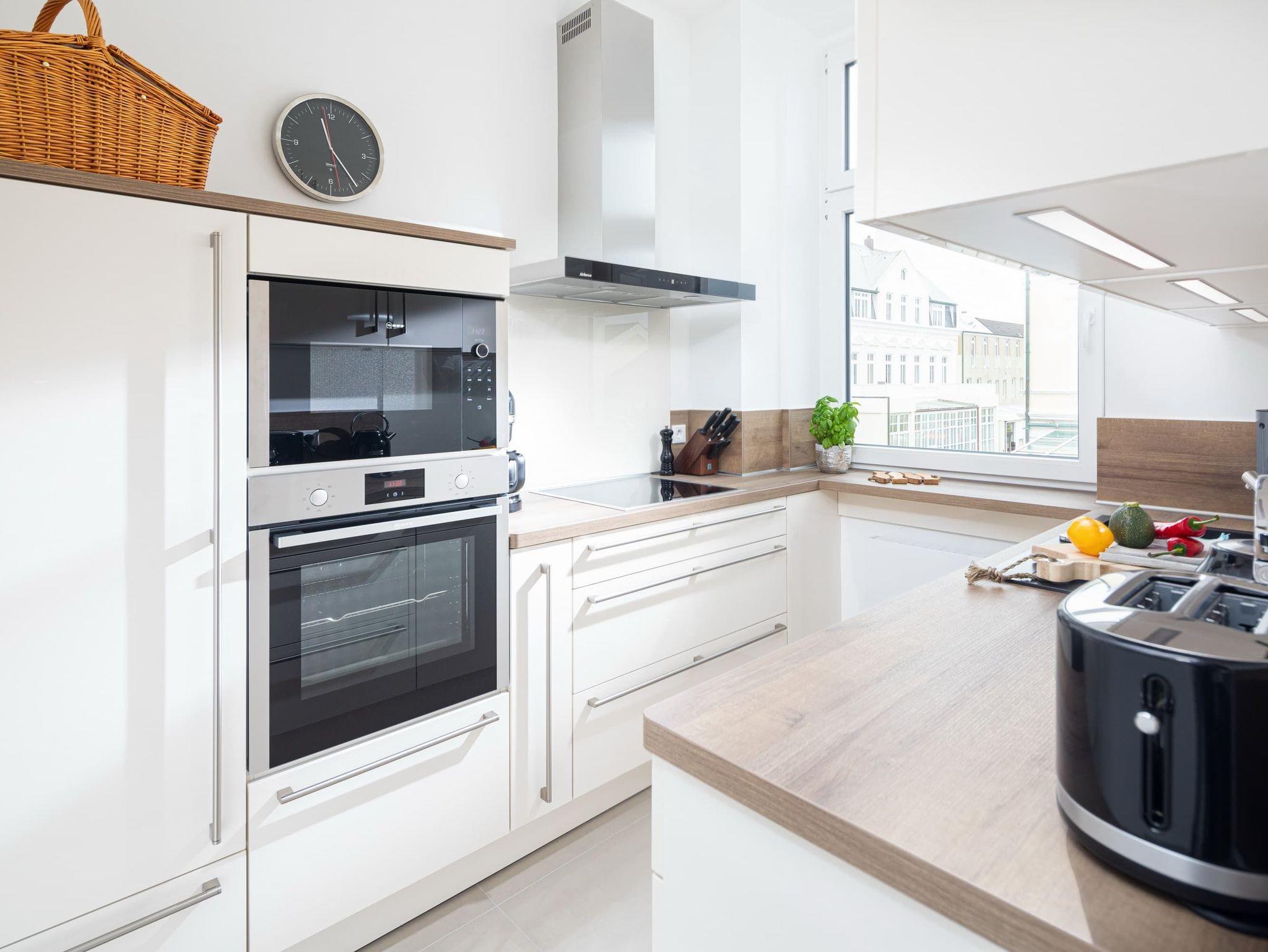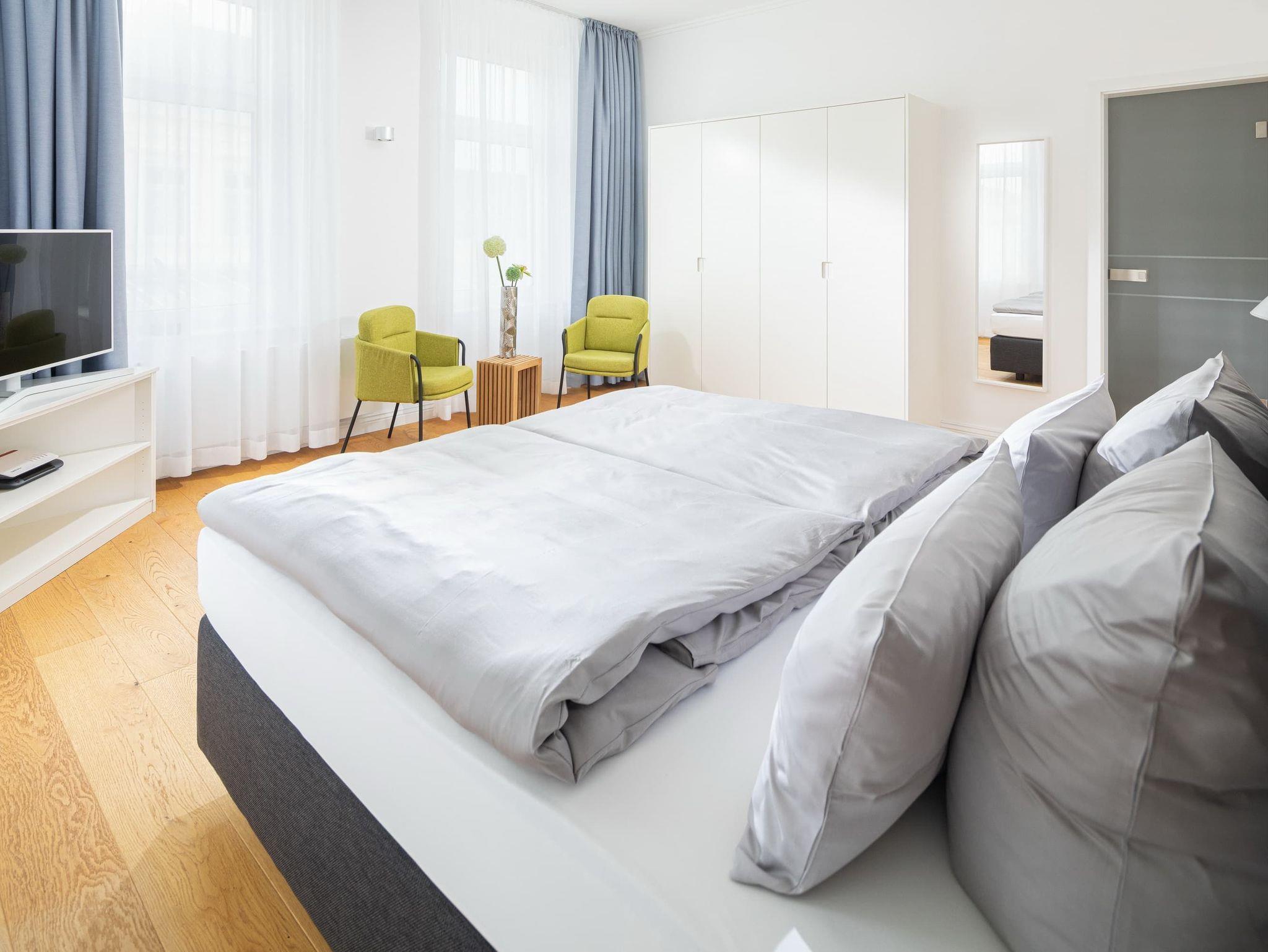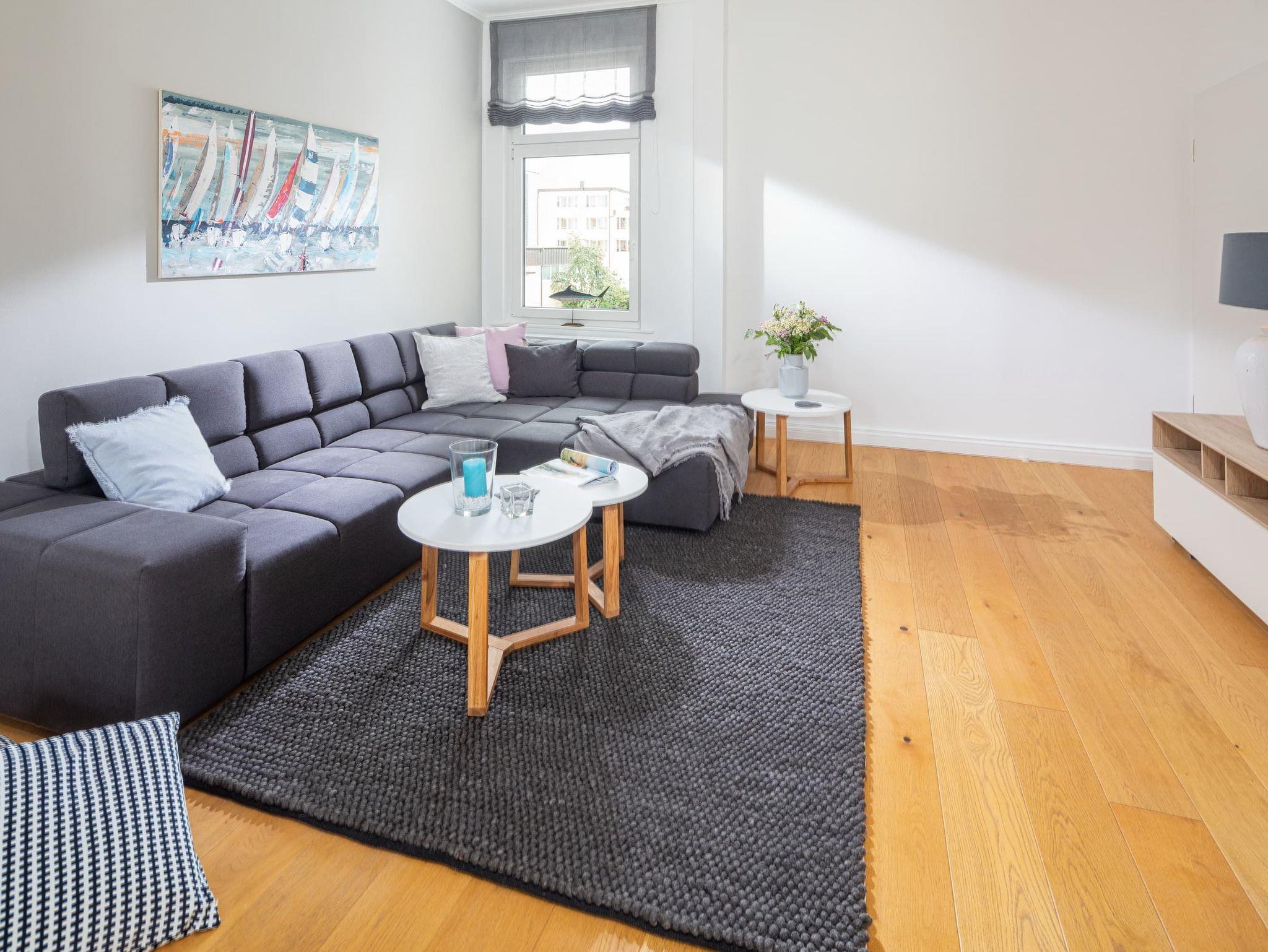 Es besticht durch seine hochwertige und gradlinige Ausstattung. Durch den Eingangsbereich gelangen Sie in das großzügige Wohnzimmer mit Eckcouch, Esstisch für bis zu 6 Personen und angrenzender Küche (separater Raum). Beide Schlafzimmer sind mit hochwertigen Boxspringbetten ausgestattet, haben reichlich Stauraum und sind durch die großen Altbaufenster wunderbar hell. Eines der beiden Badezimmer liegt en Suite eines Schlafzimmers, das andere ist vom Flur aus zu begehen. Die Einrichtung ist modern, funktional, durchdacht und luxuriös. Auf der Kaiserwiese steht Ihnen ein privater Strandkorb zur Verfügung (Zeitraum: April bis Oktober).