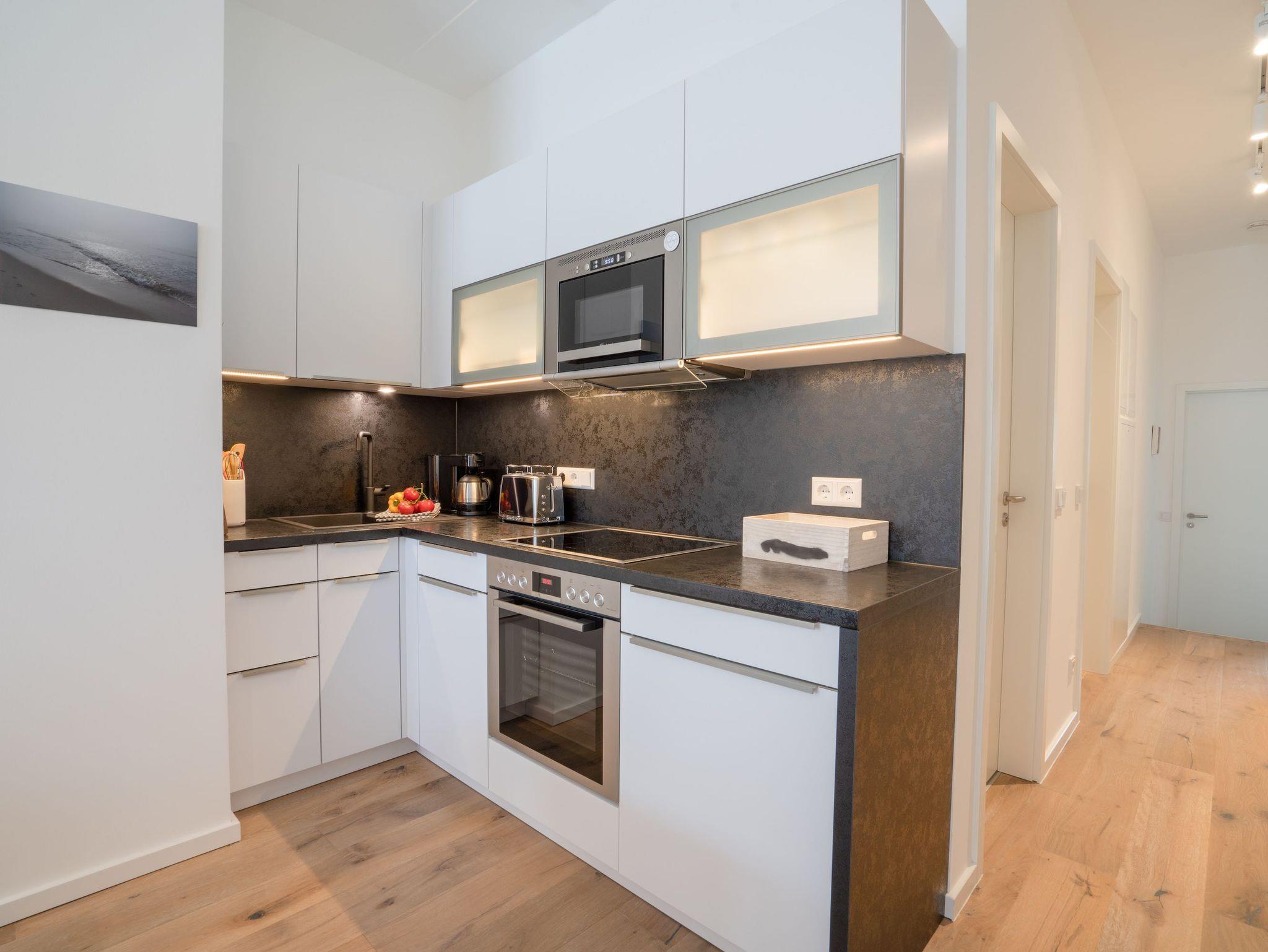 Die moderne Einbauküche mit einem Glaskeramikkochfeld mit 4 Kochzonen, Backofen, Mikrowelle, Spülmaschine und Kühl-/Gefrierkombination bietet die Möglichkeit zu einem Kochvergnügen am Abend.