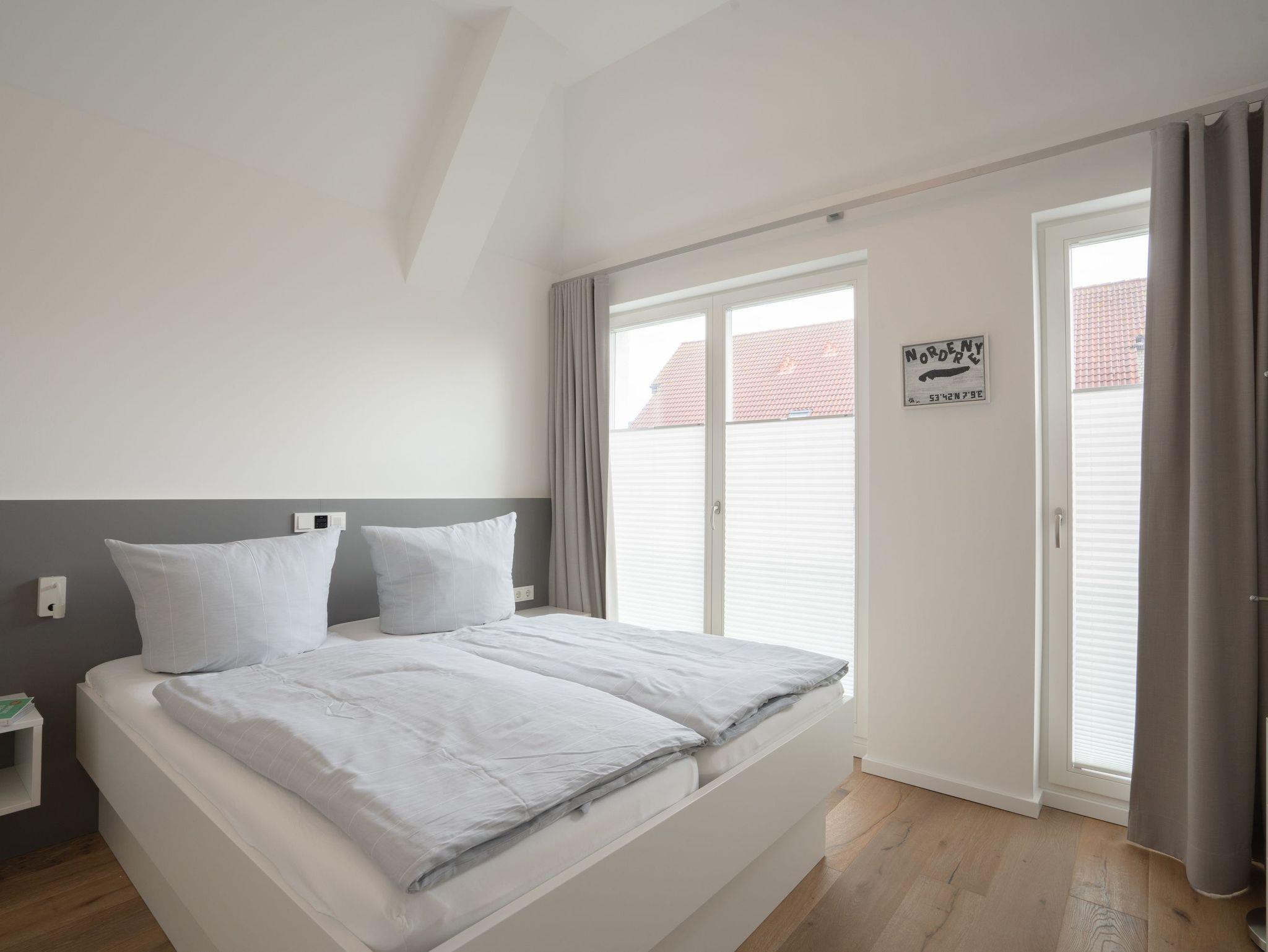 Das Elternschlafzimmer ist mit einem maßgefertigten Doppelbett und großzügigem Schrank eingerichtet.