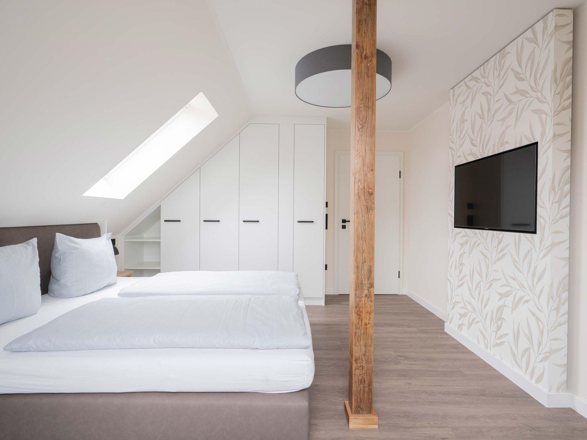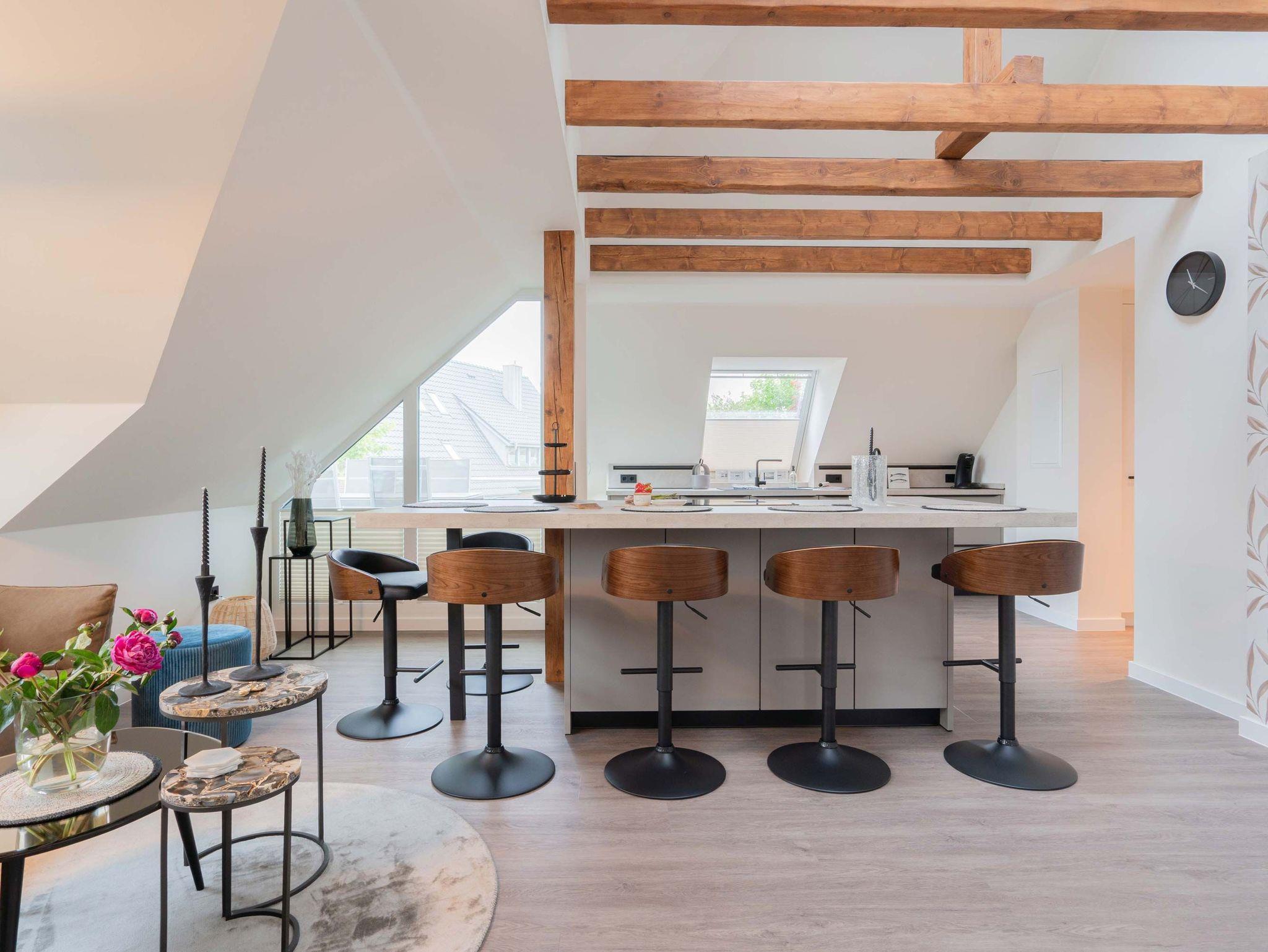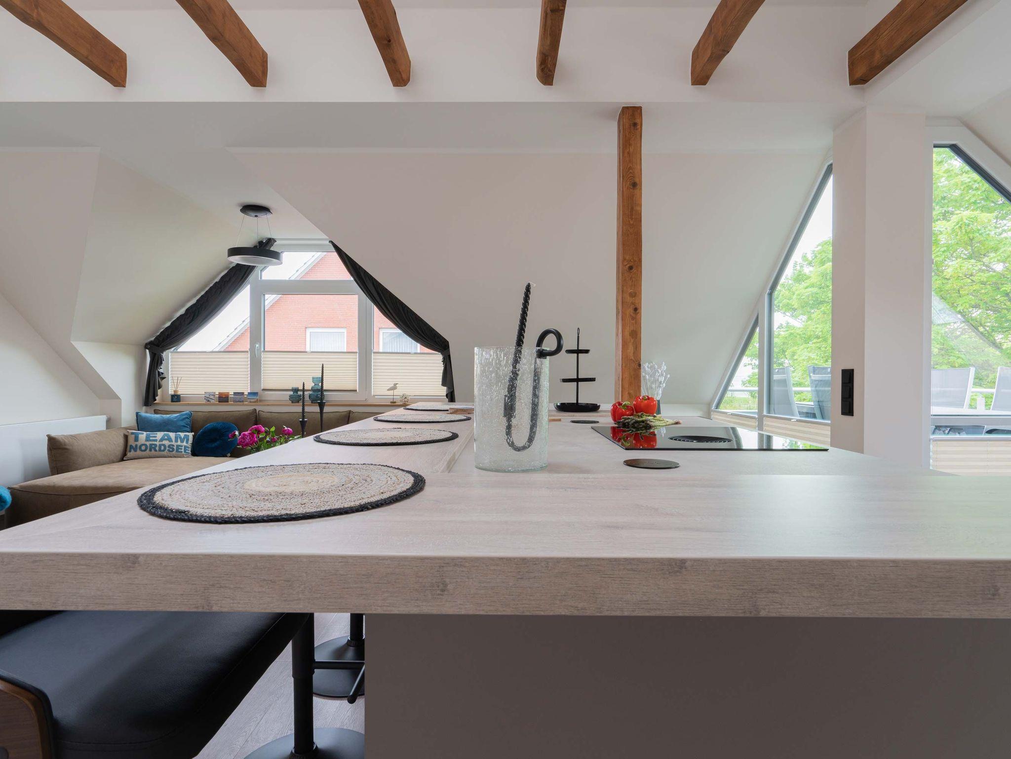 Die 70qm große Ferienwohnung Neywatt 1“ wurde 2022 komplett neugestaltet. Sie liegt ruhig und grün im Fischerhafen, nahe der Surferbucht. Vom Balkon aus haben Sie einen schönen Blick ins Grüne und auf das Wattenmeer. Im Wohnbereich besticht die Wohnung mit ihrer Großzügigkeit und einer sehr geräumigen Wohnküche. An der gut ausgestatteten Kochinsel können köstliche Mahlzeiten zubereitet werden und dort direkt gemeinsam genossen werden. Entspannung danach bietet die liebevoll gestaltete, gemütliche Sofaecke. Die zwei großzügigen Schlafräume sind jeweils mit einem Doppelbett (180cm) und TV ausgestattet. Einen zusätzlichen Schlafplatz für eine weitere Person gibt es im Giebel des Wohnraums. Das Duschbad bietet neben der Regendusche eine eigene Waschmaschine (kostenpflichtig) und einen Trockner (kostenpflichtig). Vor dem Haus steht Ihnen ein PKW-Stellplatz zur Verfügung.