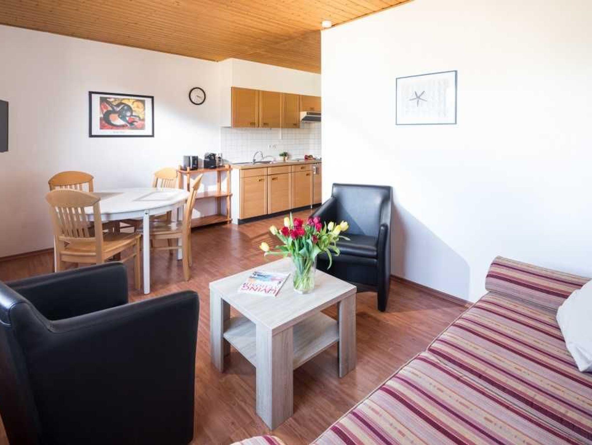 Die Drei-Raum-Wohnung eignet sich ideal für bis zu vier Personen. Zwei Schlafzimmer mit je einem Doppelbett und ein helles Bad mit einer Dusche gehören zu dieser schönen Wohnung. Im Wohn-/Essbereich stehen Ihnen eine Kochzeile, ein Esstisch und eine Sitzgruppe ebenso zur Verfügung wie ein Flachbildfernseher und schnelles kostenfreies WLAN. Bettwäsche, Handtücher und Küchentücher werden gestellt und wöchentlich gewechselt.