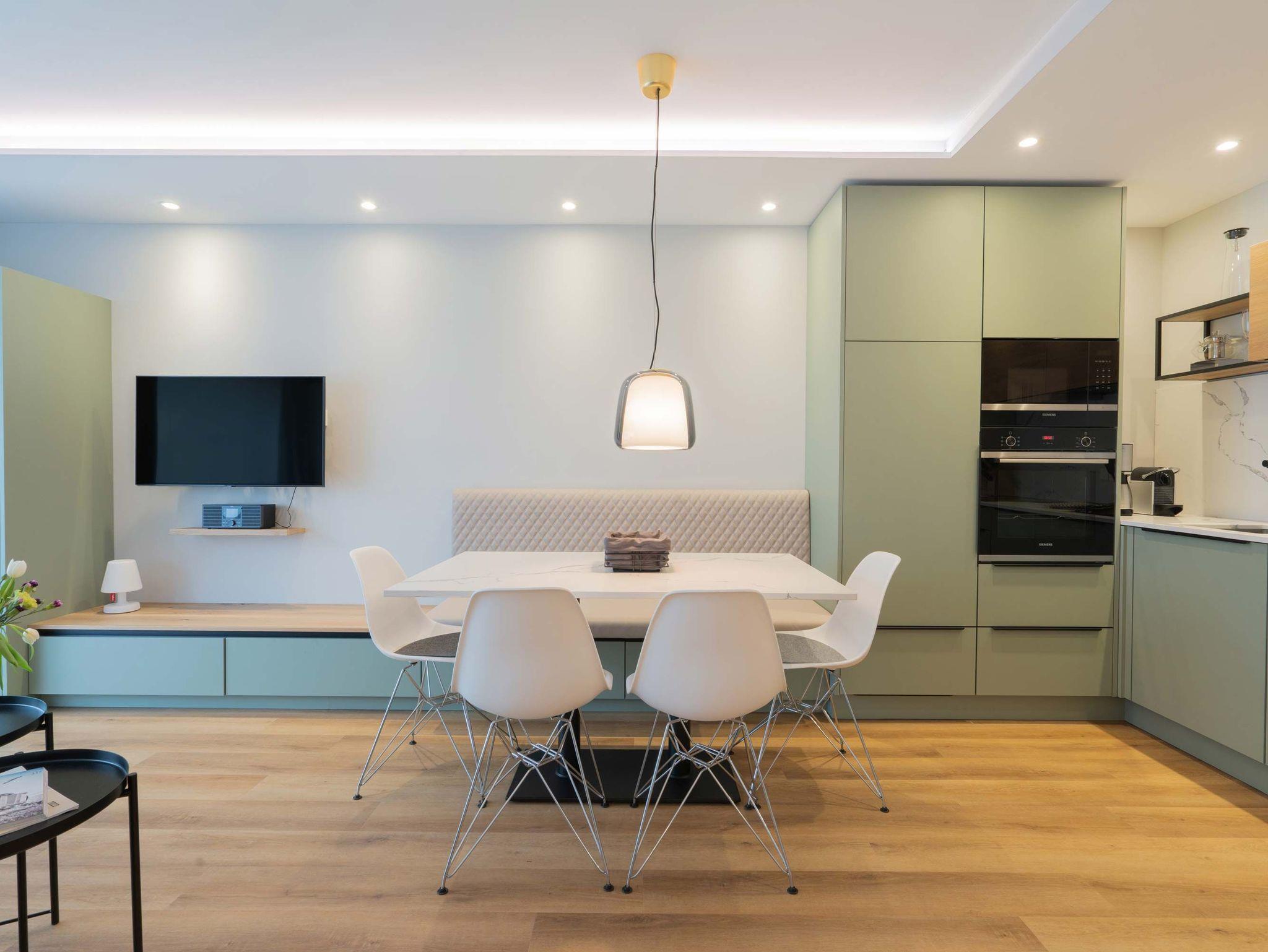Die Ferienwohnung ?Harmening 2 liegt im 1. OG des Hauses mit direktem Zugang zum Balkon. Die Wohnung wurde 2022 aufwendig renoviert. Der Wohn- und Essbereich bietet eine gemütliche Sofaecke (Ausziehcouch 160x200) mit Fernseher. Am geräumigen Essplatz lassen sich entspannte, gemeinsame Mahlzeiten geniessen. Die moderne, offene Küche ist umfangreich mit Spülmaschine, Backofen, Mikrowelle und Annehmlichkeiten wie u.a. einer Nespresso-Maschine ausgestattet. Vom Wohnraum gelangen Sie auf den Balkon mit Westausrichtung. Auch im separaten Schlafzimmer gibt es neben dem Doppelbett (200x200) einen Fernseher. Das moderne Duschbad bietet Ihnen Entspannung unter der Regendusche.