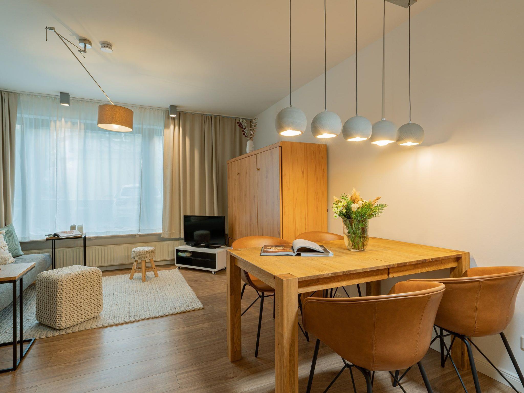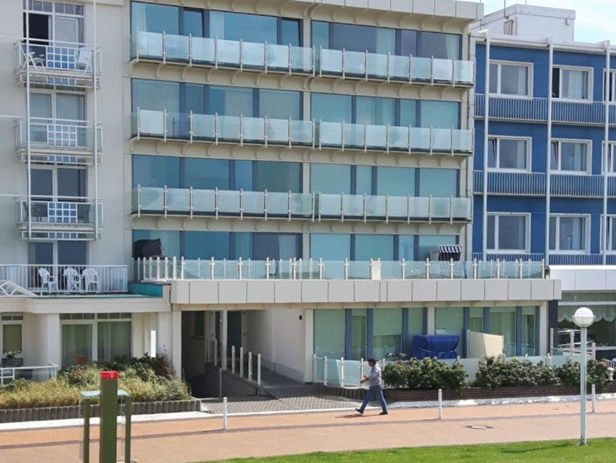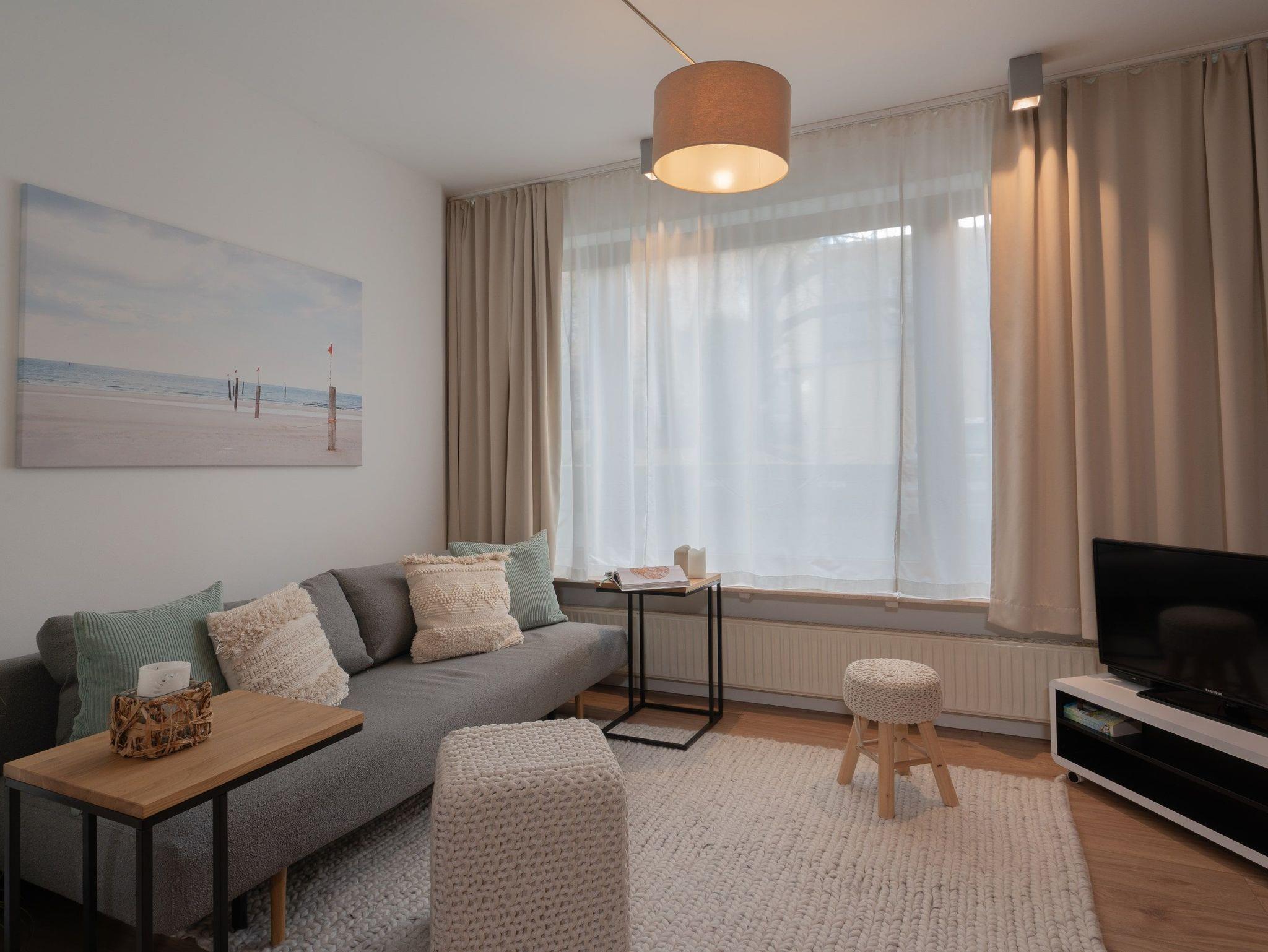 Das elegante Apartmenthaus wurde auf einem Hanggrundstück direkt an der Strandpromenade errichtet. Die Ferienwohnung befindet sich im sog. „Hanggeschoss“, das ebenerdig zum niedriger gelegenen ruhigen Innenhof liegt. Hier gibt es Abstellmöglichkeiten für ihr Fahrrad und einige Parkplätze (nur für Eigentümer).