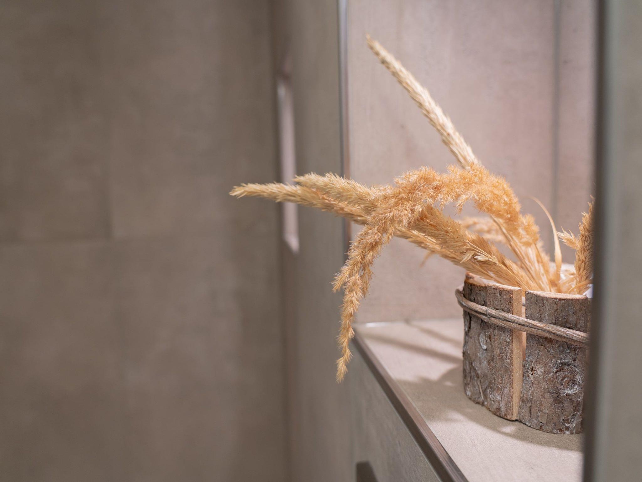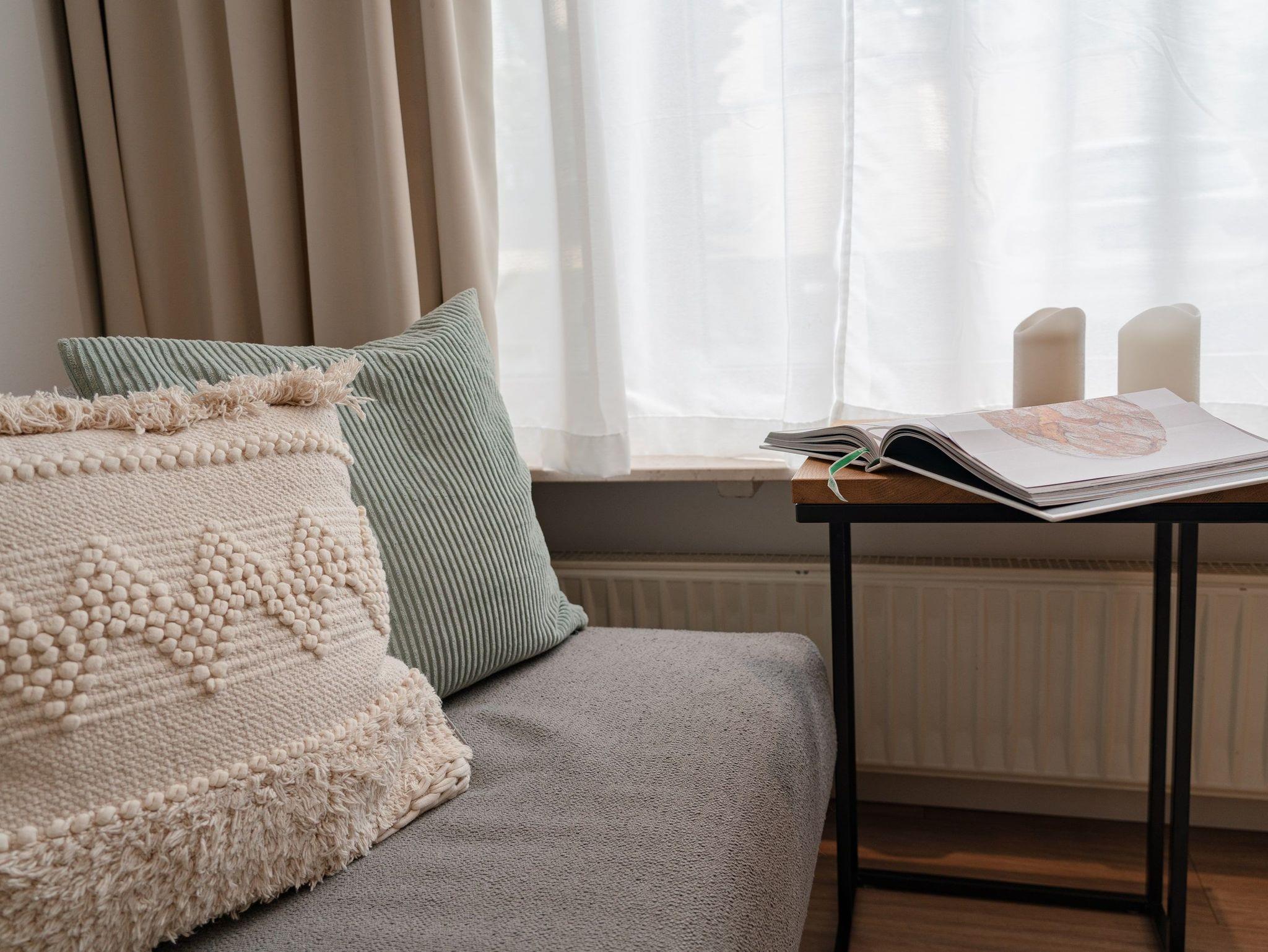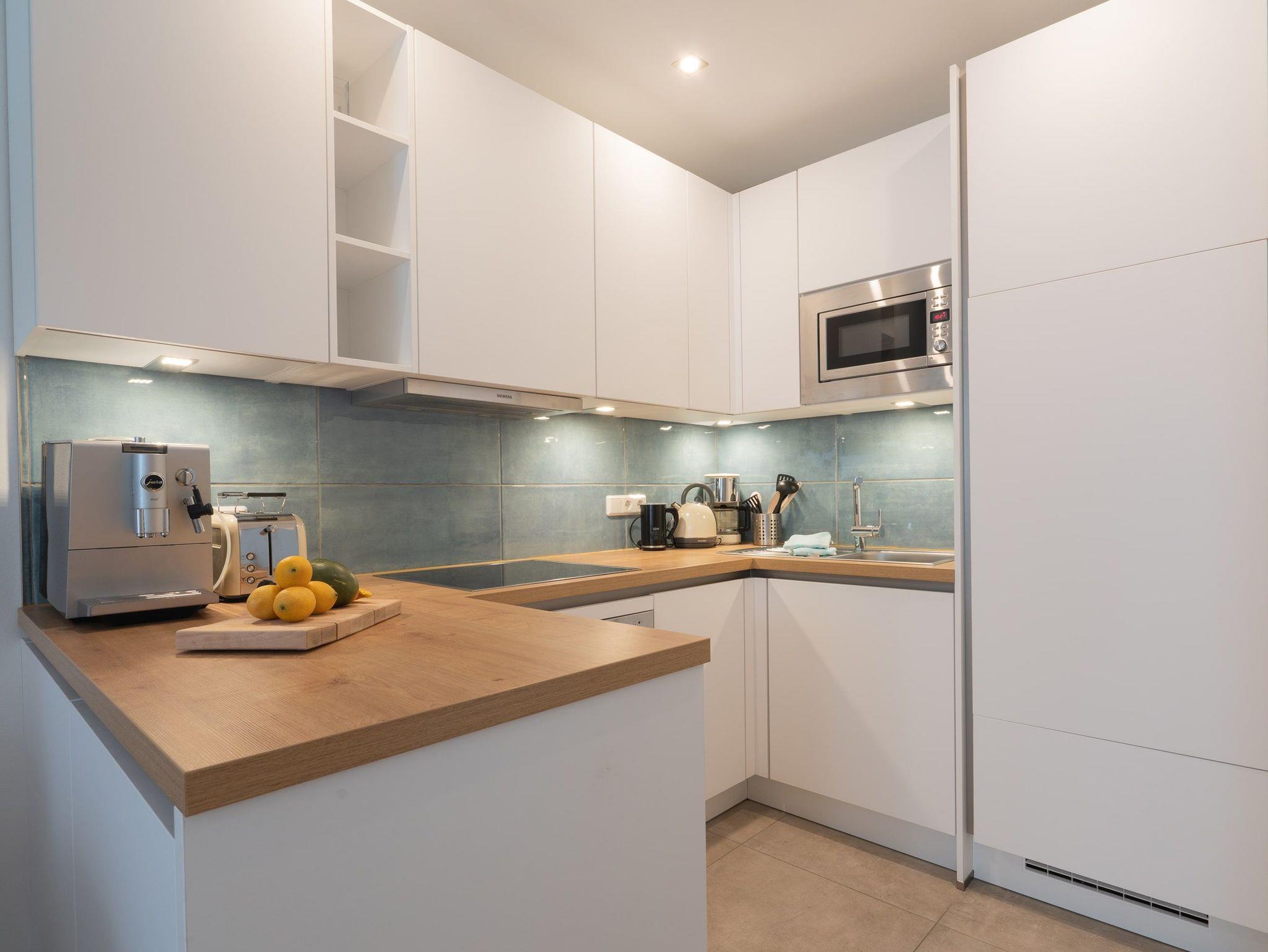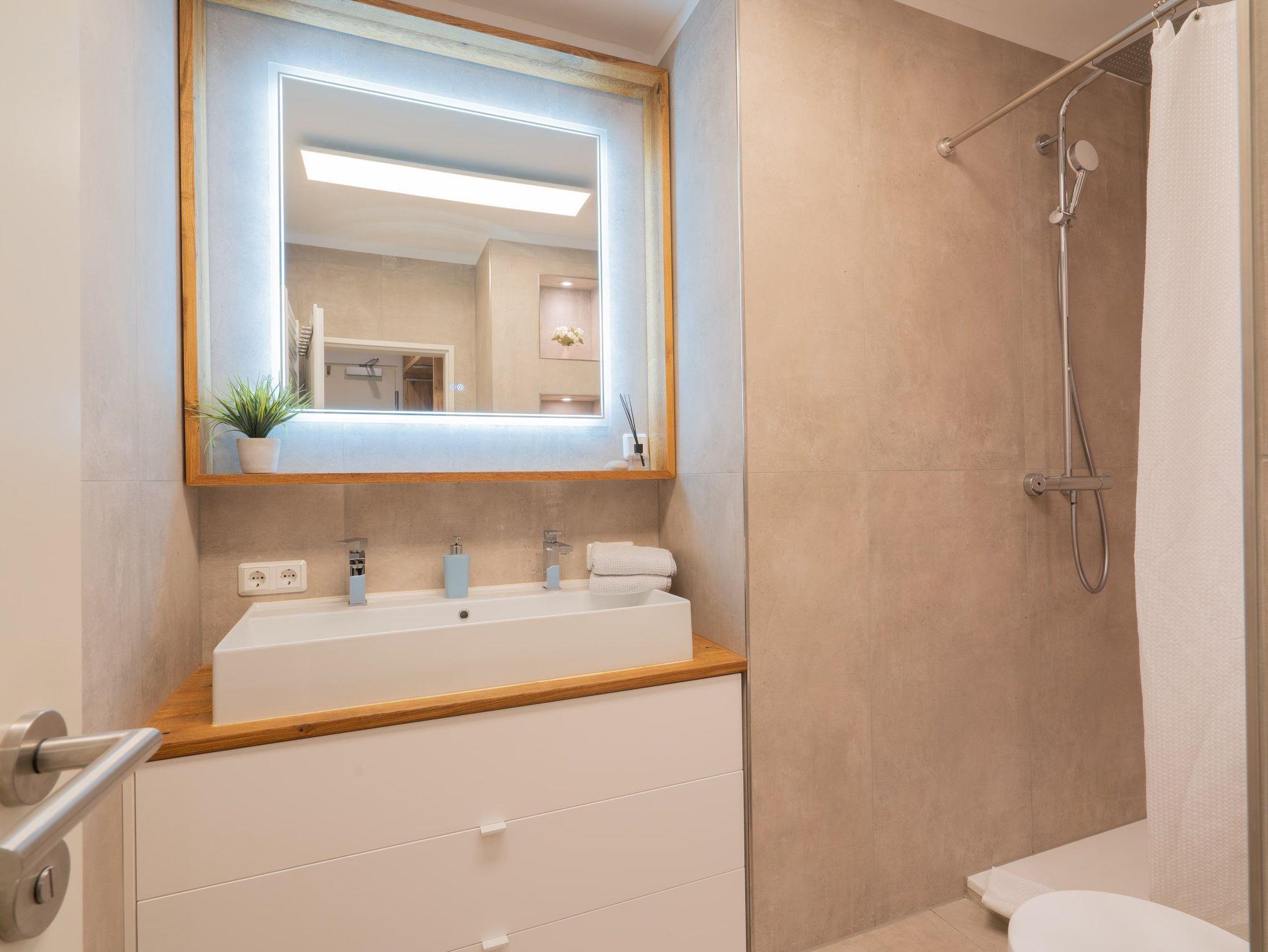 Das elegante Apartmenthaus wurde auf einem Hanggrundstück direkt an der Strandpromenade errichtet. Die Ferienwohnung befindet sich im sog. „Hanggeschoss“, das ebenerdig zum niedriger gelegenen ruhigen Innenhof liegt. Hier gibt es Abstellmöglichkeiten für ihr Fahrrad und einige Parkplätze (nur für Eigentümer).