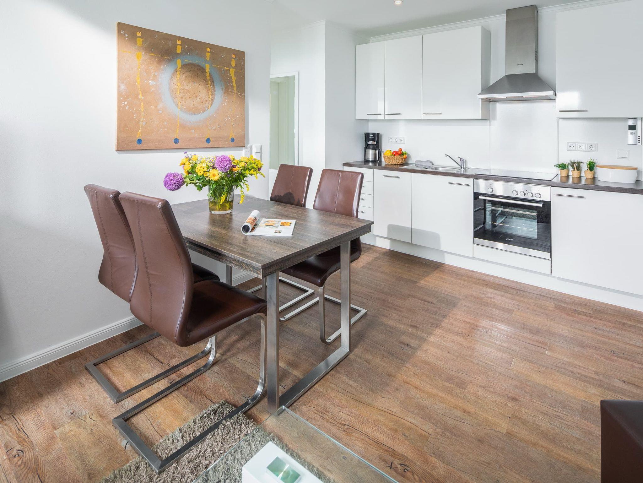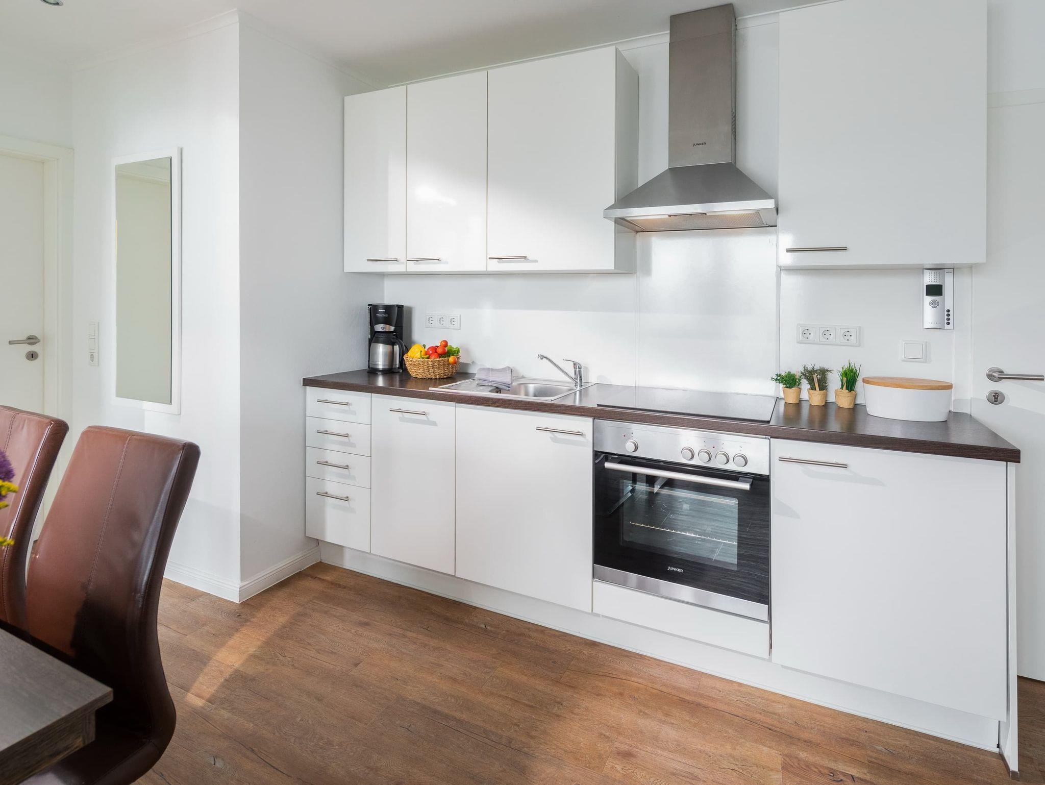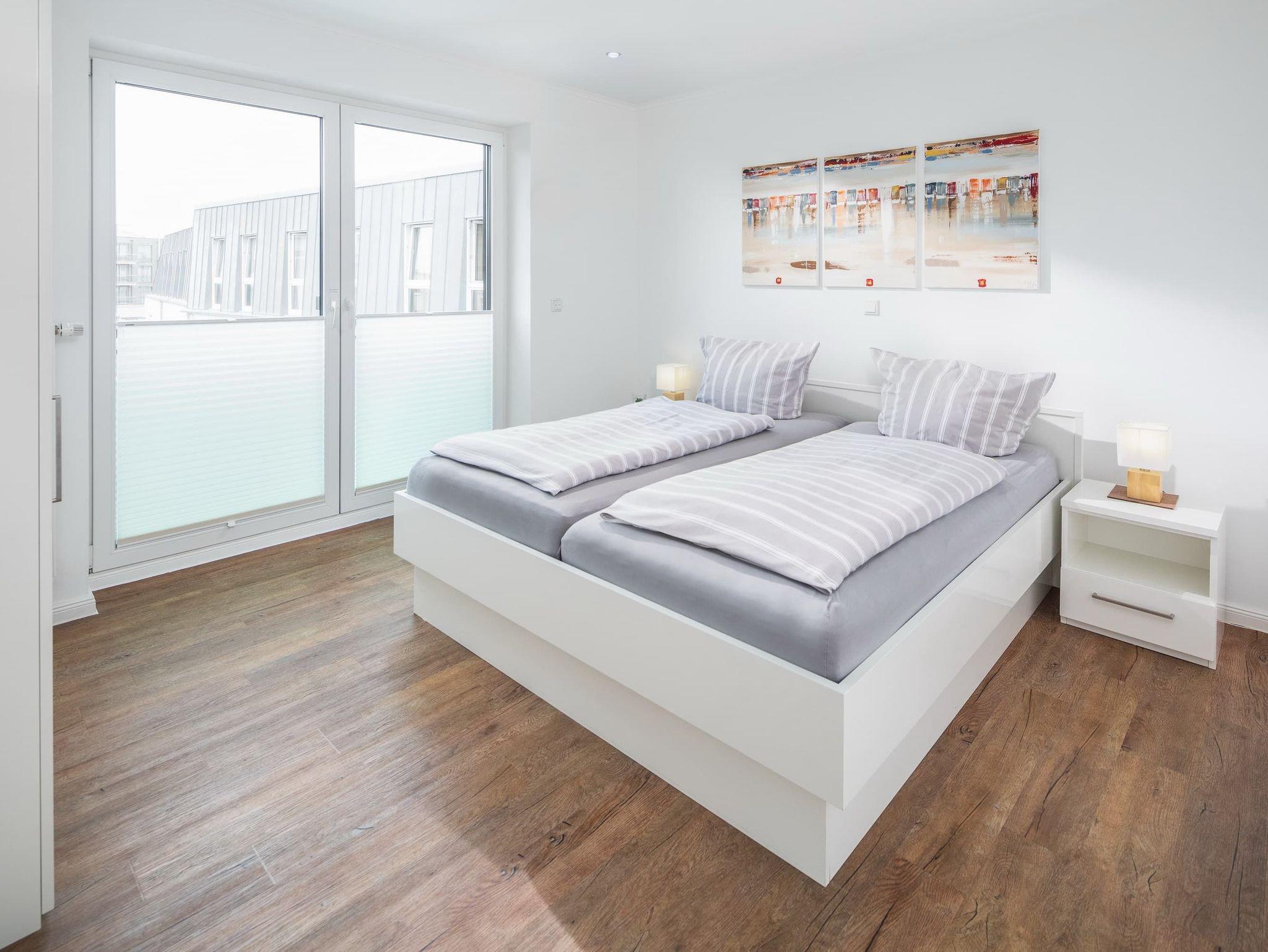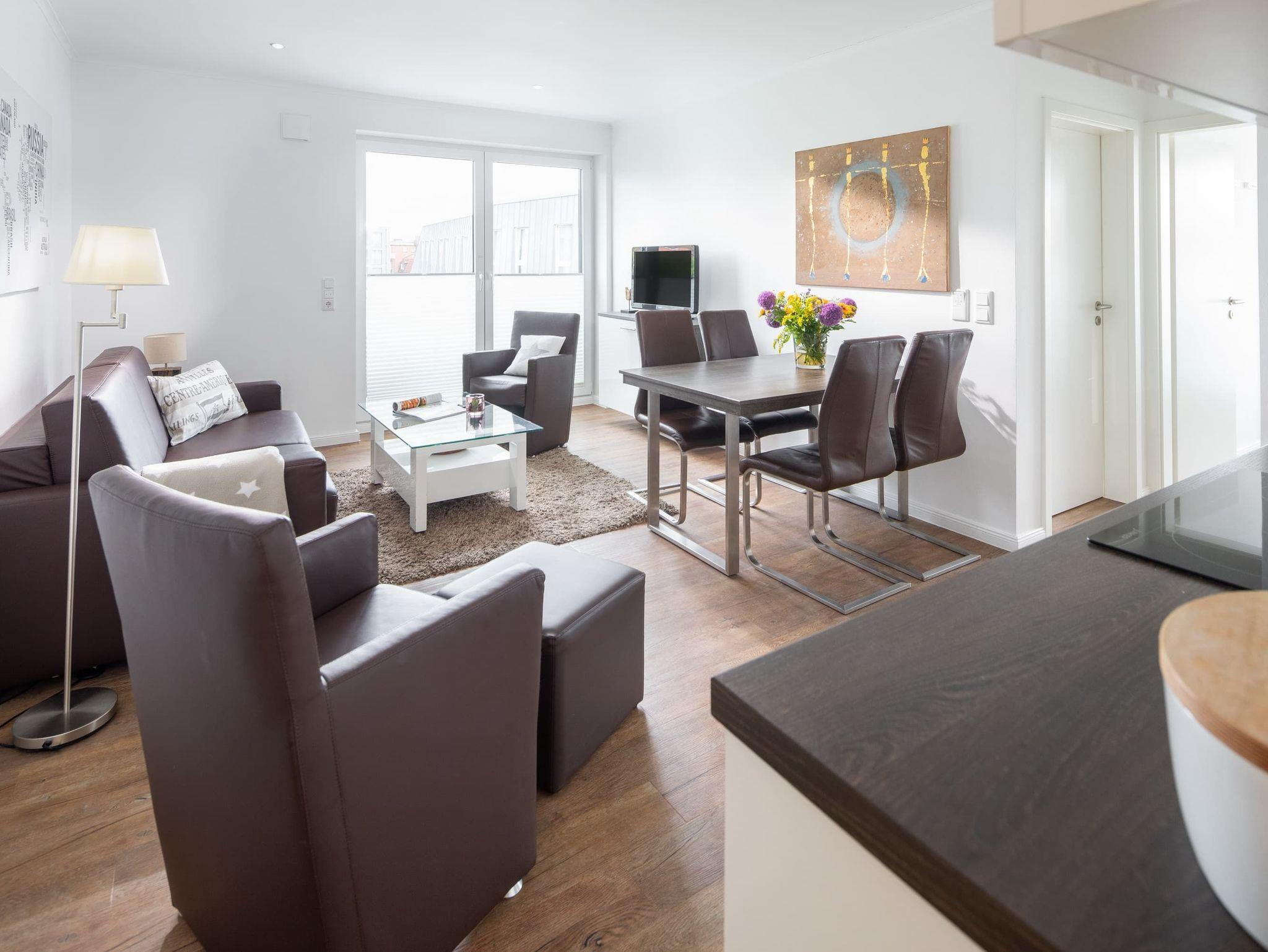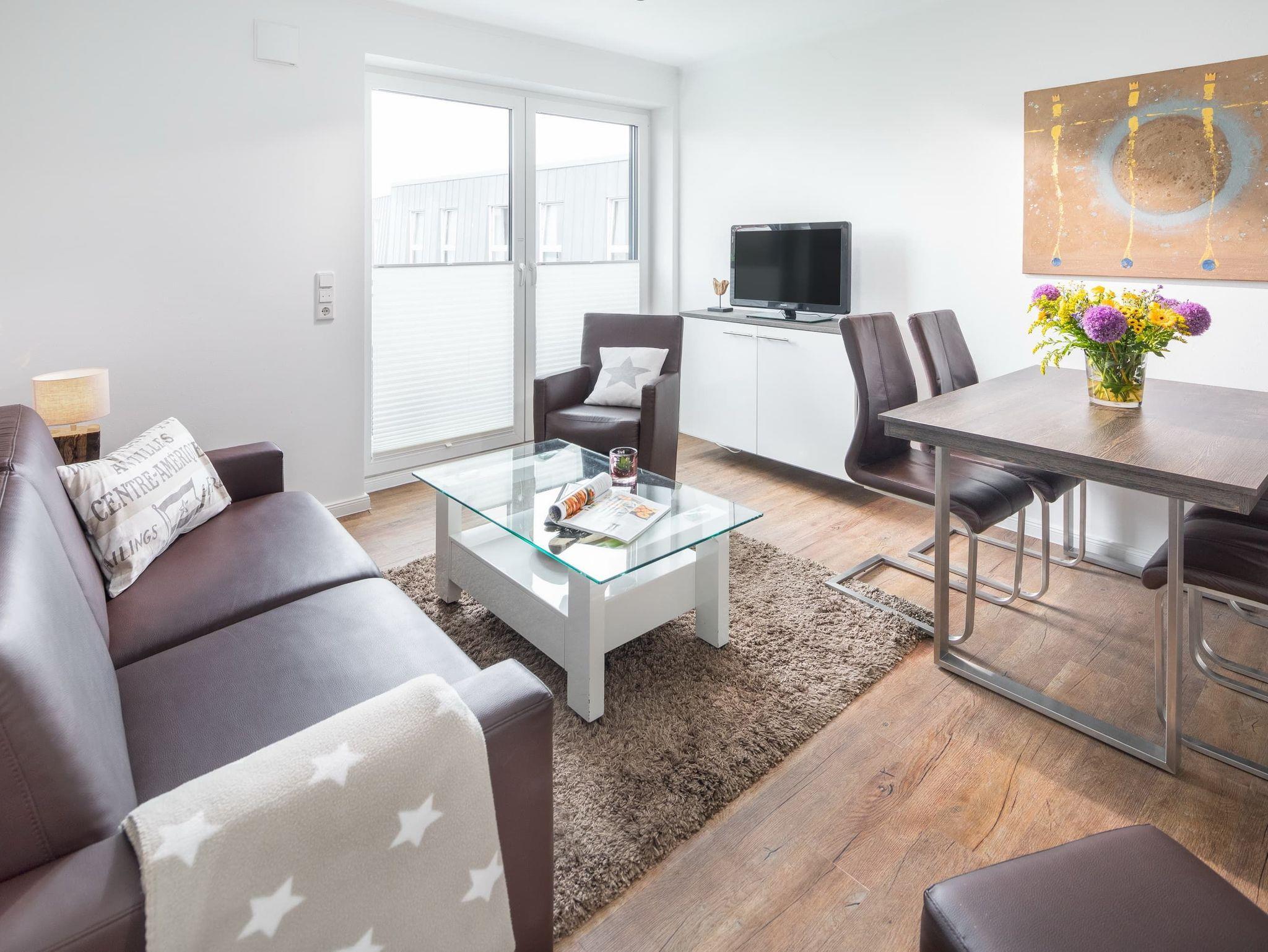 Sie verfügt über ca 45qm Wohnfläche und liegt im zweiten Stock. Sie bietet neben einem geräumigen Schlafzimmer mit Doppelbett einen modern und gemütlich gestalteten Wohnbereich mit Esstisch und angrenzender Küche. Im Wohnzimmer befindet sich eine hochwertige Schlafcouch ? die mit wenigen Handgriffen zu einem vollwertigen Bett mit Matratze und Lattenrost ausgezogen werden kann.