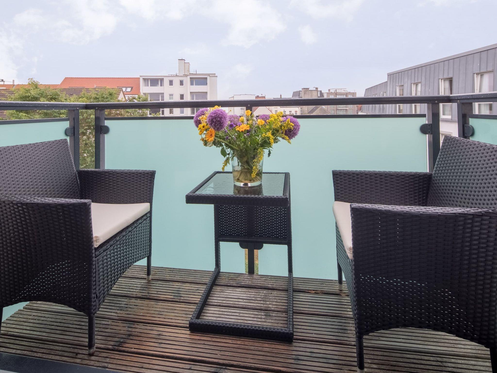 Vom kleinen Balkon am Wohnzimmer können Sie sogar einen kleinen Blick aufs Meer werfen.