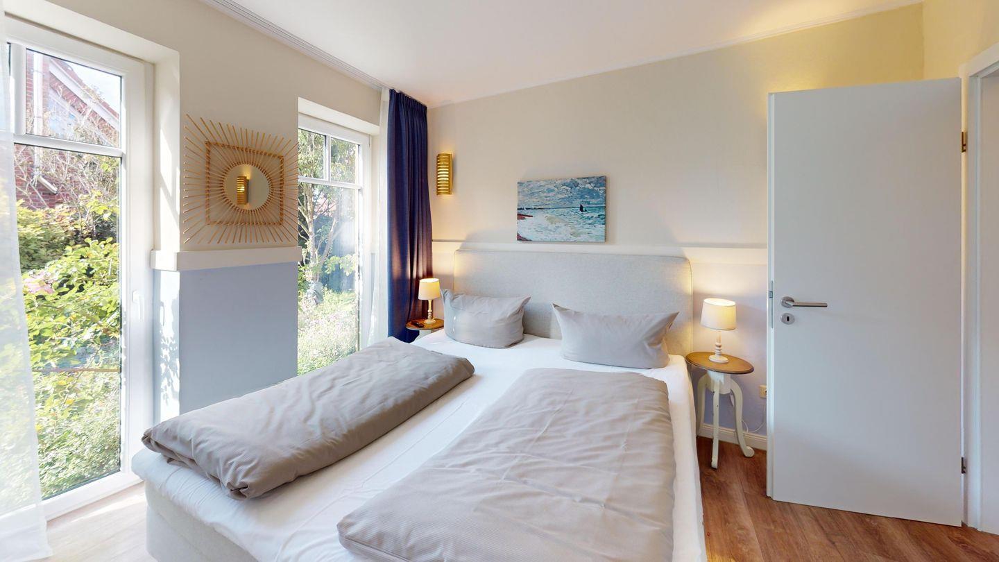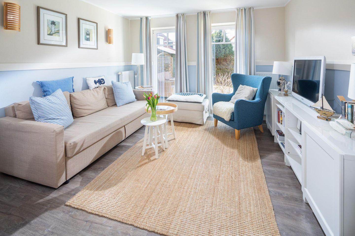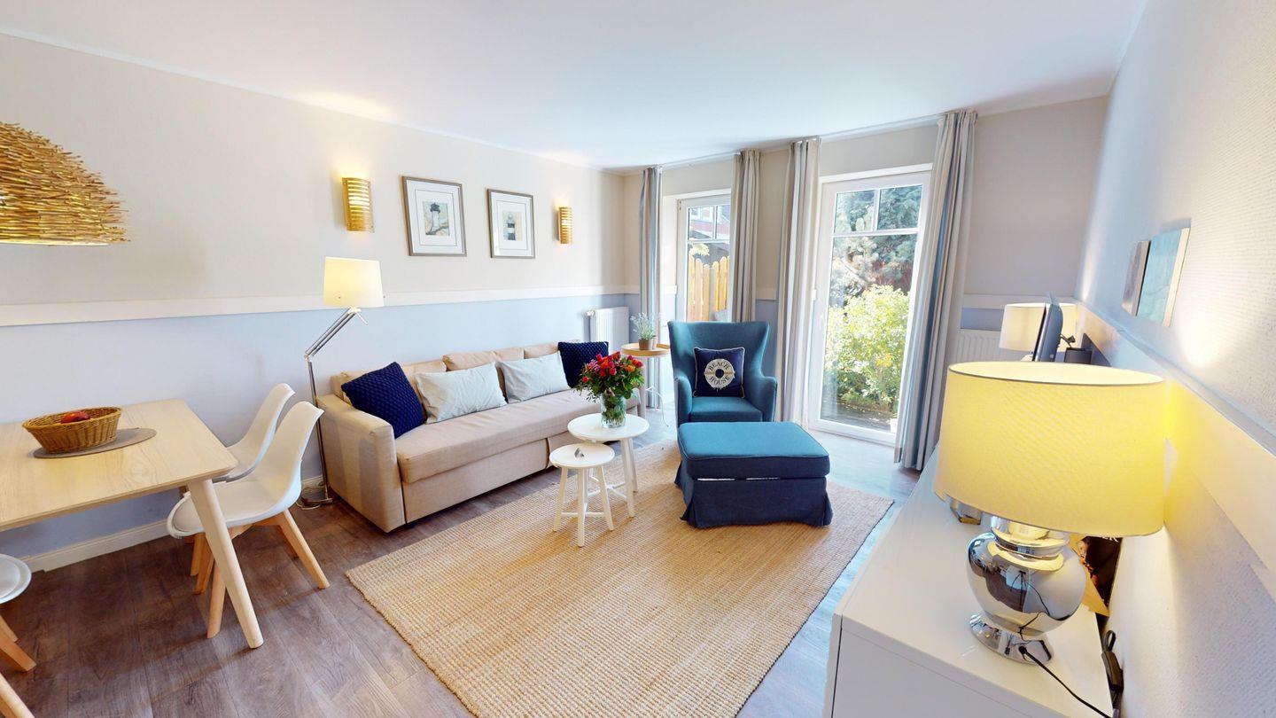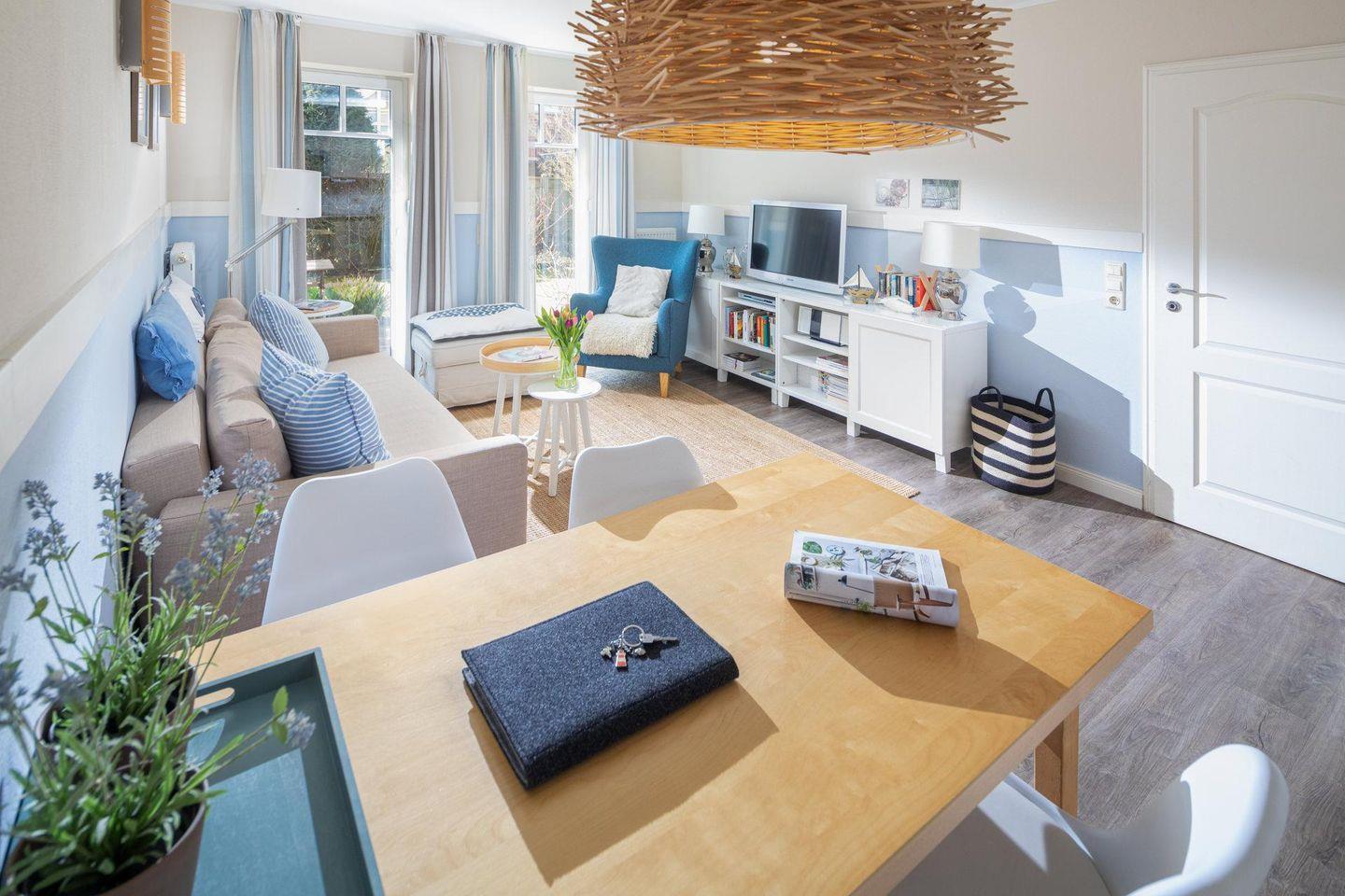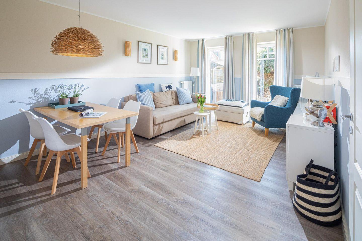 Die Wohnung ist geschmackvoll im nordischen Stil eingerichtet. Es gibt ein Schlafzimmer mit einem Doppelbett und ein Wohnzimmer mit offener Küche, Esstisch und kleiner Terrasse zum Garten. Ein Fernseher im Schlafzimmer und einer im Wohnzimmer sowie leistungsstarkes W-Lan sorgen für Unterhaltung und schnellen Internetzugang. Kinder sind herzlich willkommen und können auf Wunsch ein Kinderbett und einen Hochstuhl bekommen. Am Haus sind auch Fahrradabstellplätze vorhanden. Hunde sind in dieser Ferienwohnung nicht erlaubt.