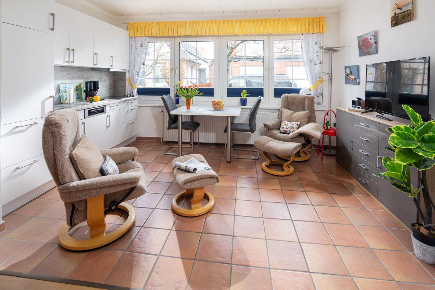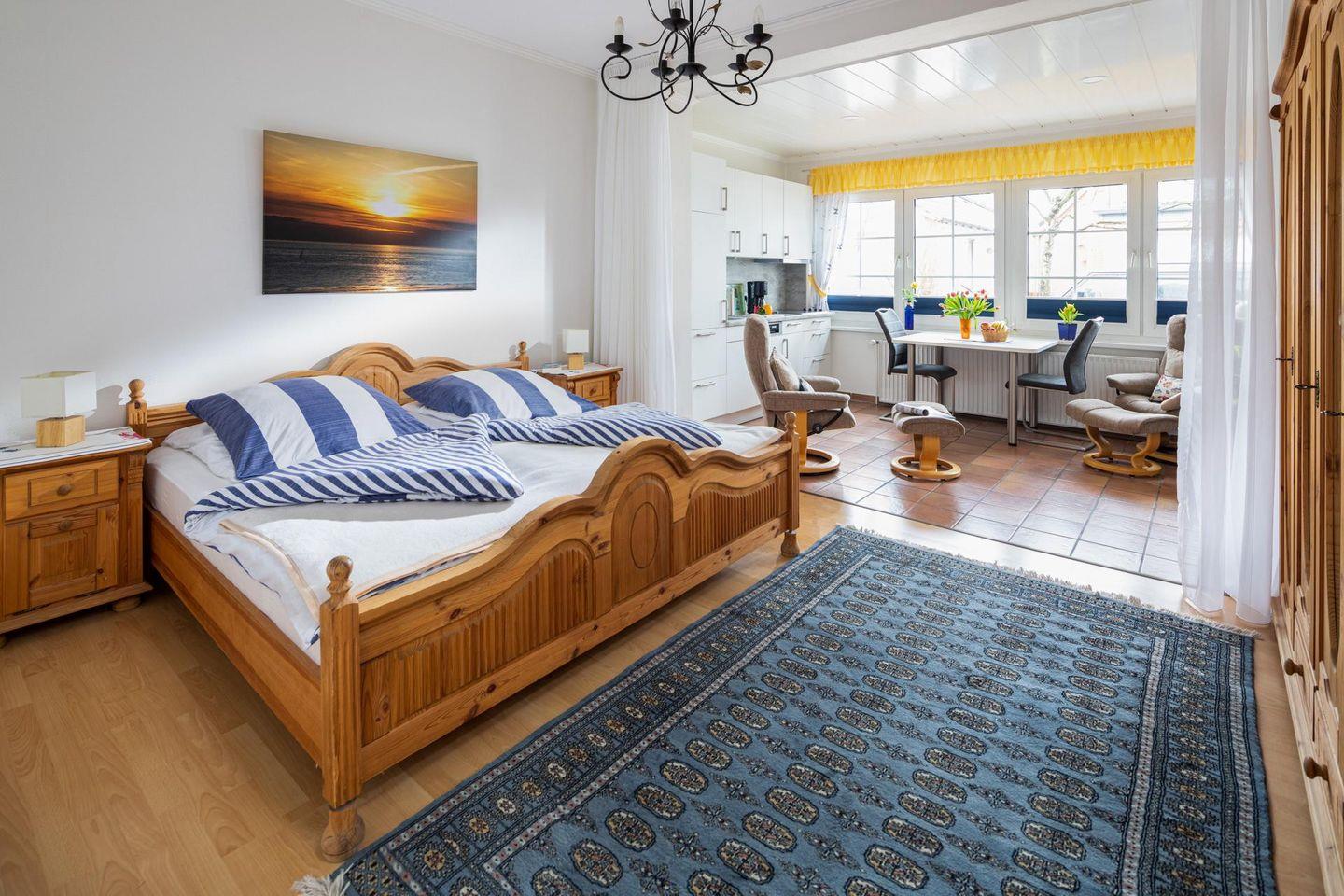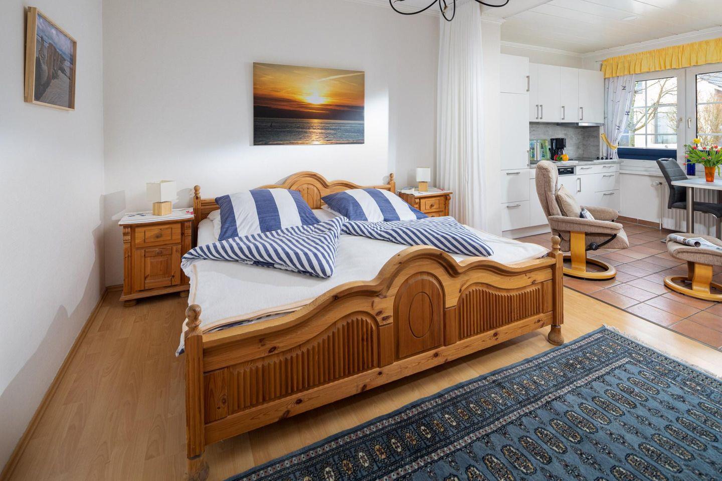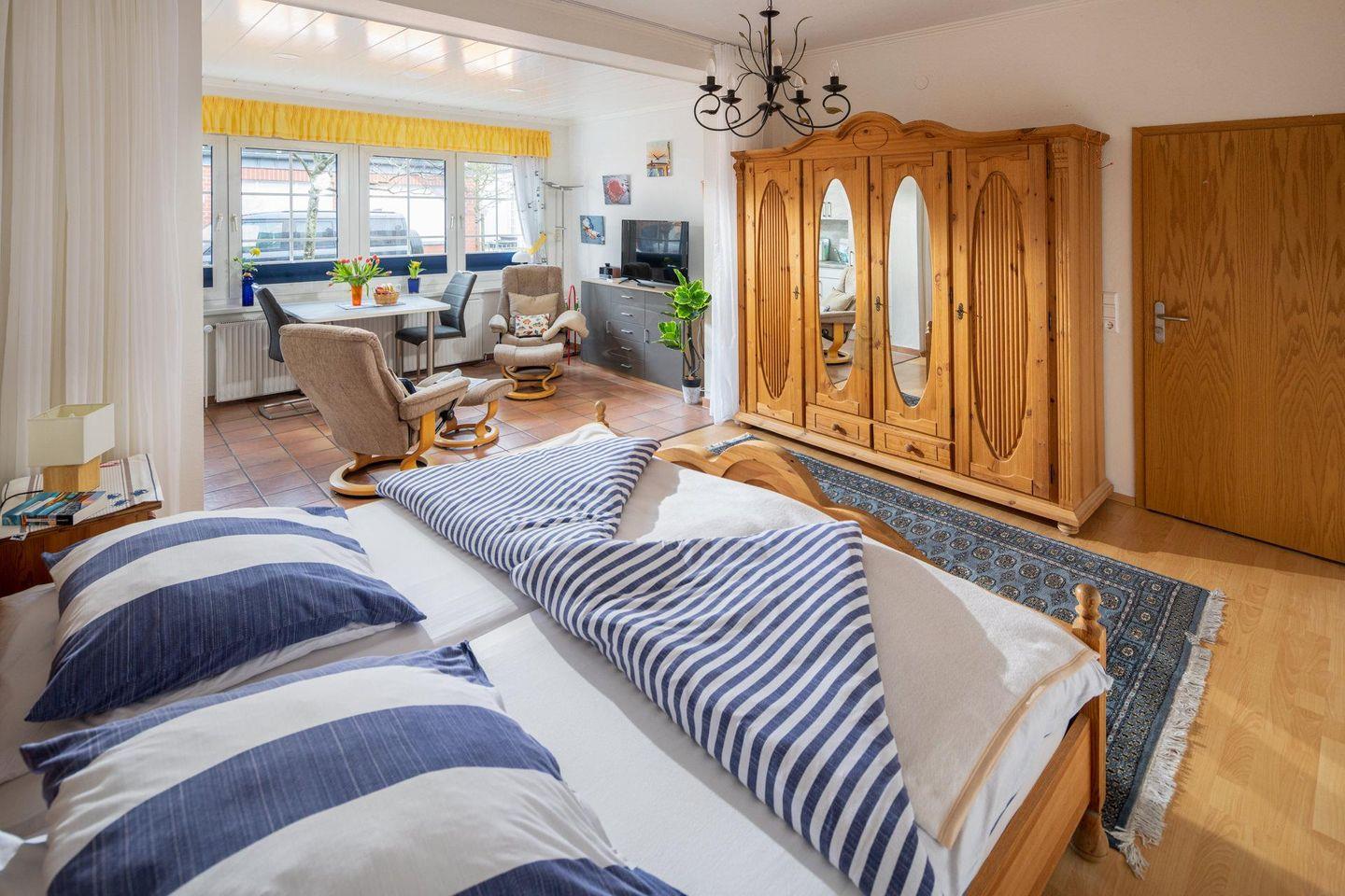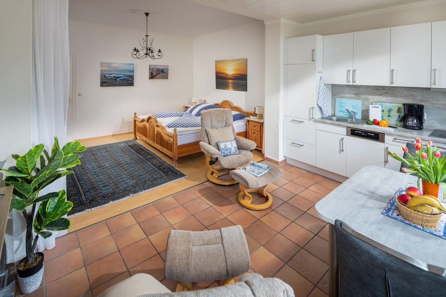 Die Wohnung liegt im Erdgeschoss des kleinen Mehrfamilienhauses, was einen bequemen Zugang ermöglicht. Das 1-Raum-Apartment ist perfekt für Alleinreisende oder bis zu 2 Personen geeignet. Der Wohn- und Schlafbereich wurde optisch durch die verschiedenen Bodenbeläge gekennzeichnet. Weiter lässt sich der Wohnbereich durch einen Vorhang vom Schlafbereich abtrennen.