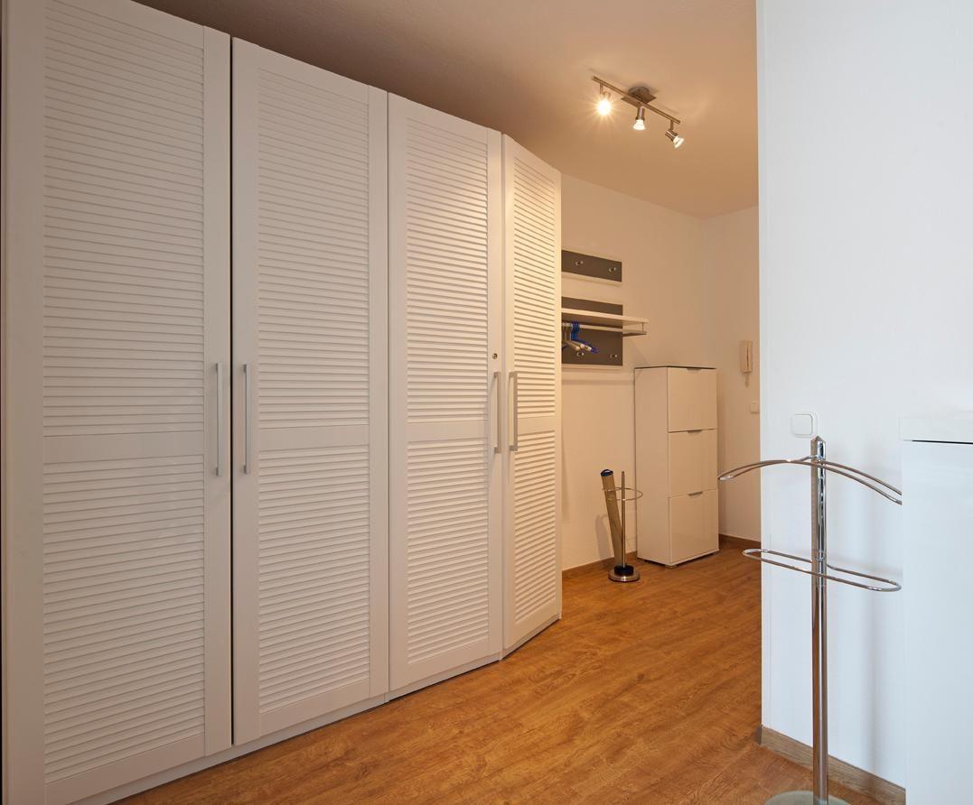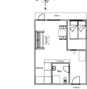 Die Wohnung verfügt über ein Wohn- und Schlafzimmer mit einem Doppelbett. Die kleine Küchenecke ist mit einem 2-Platten-Ceranfeld ausgestattet. Ein Highlight der Wohnung ist der Balkon, der zur Landseite nach Osten ausgerichtet ist. Waschmaschine und Wäschetrockner befinden sich im Haus und stehen (für die gemeinschaftliche Nutzung gegen Münzeinwurf) zur Verfügung, was besonders für längere Aufenthalte von Vorteil ist. Hunde sind in dieser Ferienwohnung nicht erlaubt.
