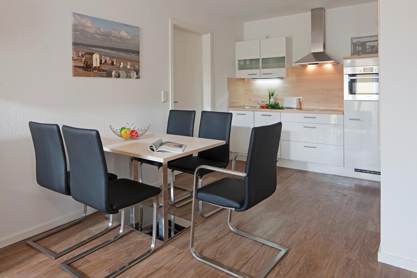 Die Wohnung bietet ein Wohnzimmer, ein Schlafzimmer mit Doppelbett, ein Schlafzimmer mit zwei Einzelbetten, eine offene Küche mit einem Esstisch (bietet Platz für bis zu 4 Personen) und ein Badezimmer mit Dusche, Handtuchtrockner und Fußbodenheizung. Weiterhin sind insgesamt drei TV-Geräte vorhanden. Die Wohnung hat auch einen kleinen Balkon mit Blick auf einen begrünten Innenhof. Eine Waschmaschine und ein Wäschetrockner sind gegen Gebühr im Gemeinschaftskeller nutzbar. Fahrräder können vor dem Haus abgestellt werden. Bis zum Strand sind es nur etwa 700m, dadurch ist dieser in wenigen Gehminuten zu erreichen. Hunde sind in dieser Wohnung nicht erlaubt. Restaurants, Cafés und andere Einkaufsmöglichkeiten sind fußläufig in wenigen Gehminuten erreichbar.