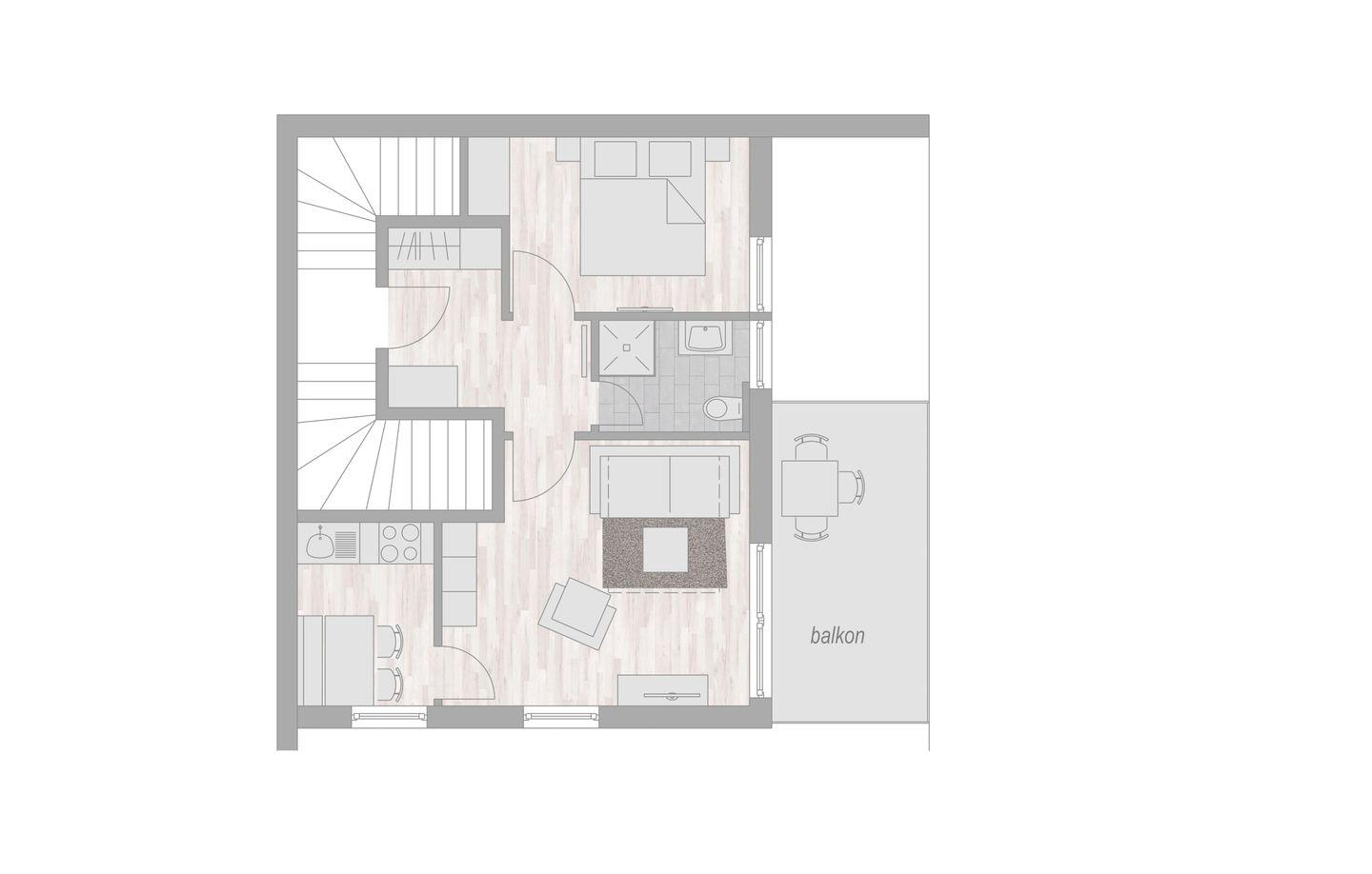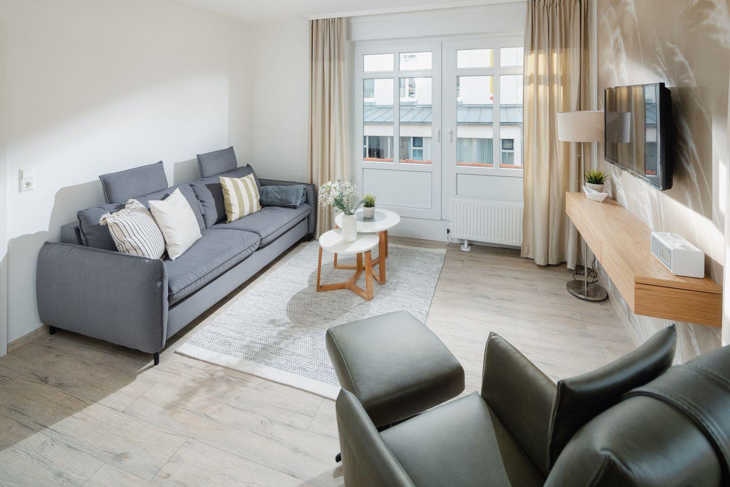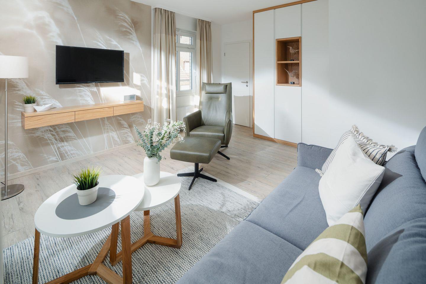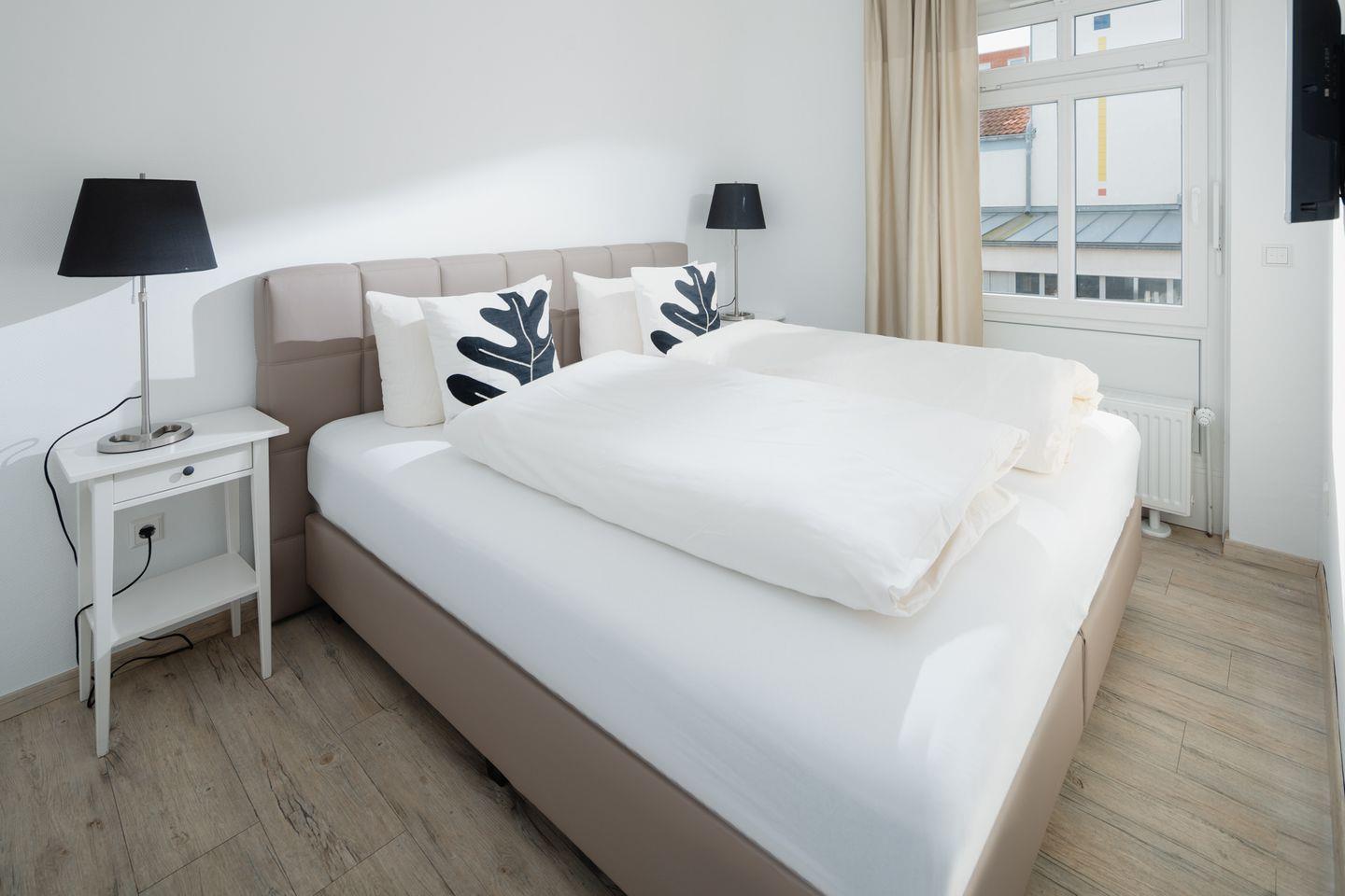 Bei der Gestaltung der Wohnung wurde auf eine moderne und helle Einrichtung Wert gelegt. Das Wohn-Schlafzimmer ist mit einer Schlafcouch ausgestattet, die zusätzlichen Schlafplatz bietet. Ein separates Schlafzimmer verfügt über ein Doppelbett und einen TV. Eine separate Küche ist voll ausgestattet. Das Badezimmer verfügt über eine Dusche und ein WC. Die Wohnung verfügt über einen Balkon. Haustiere (Hunde) sind in dieser Ferienwohnung nicht erlaubt.