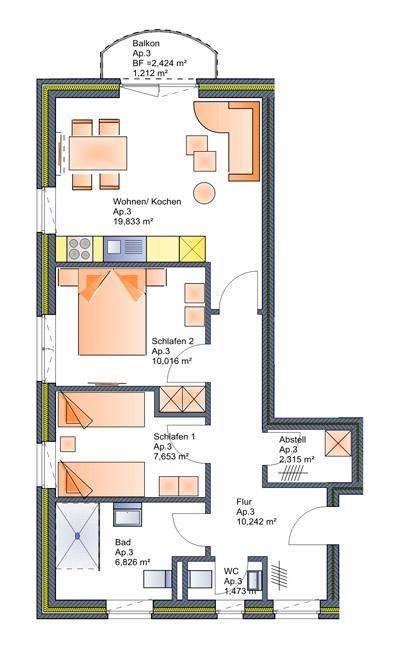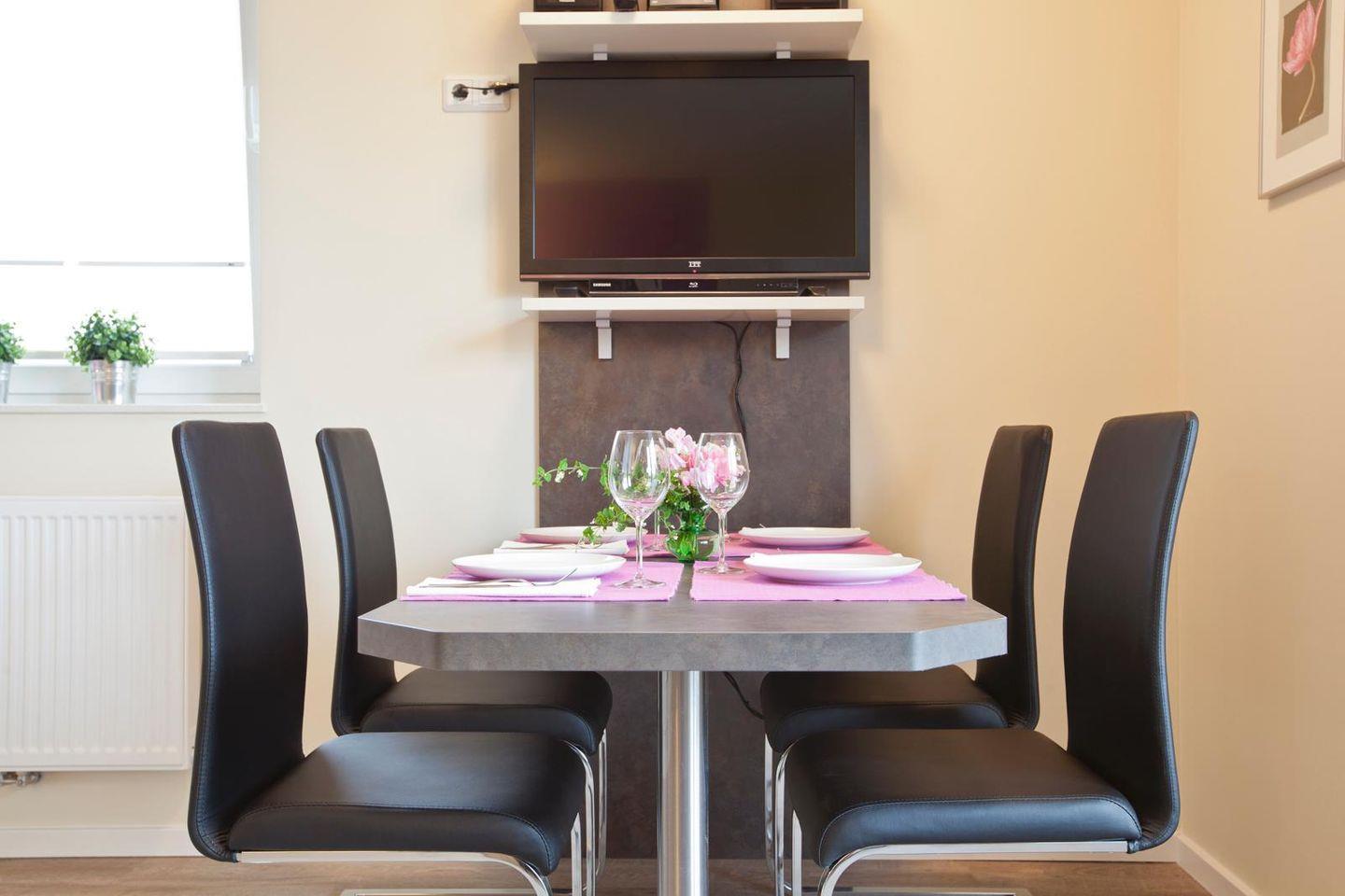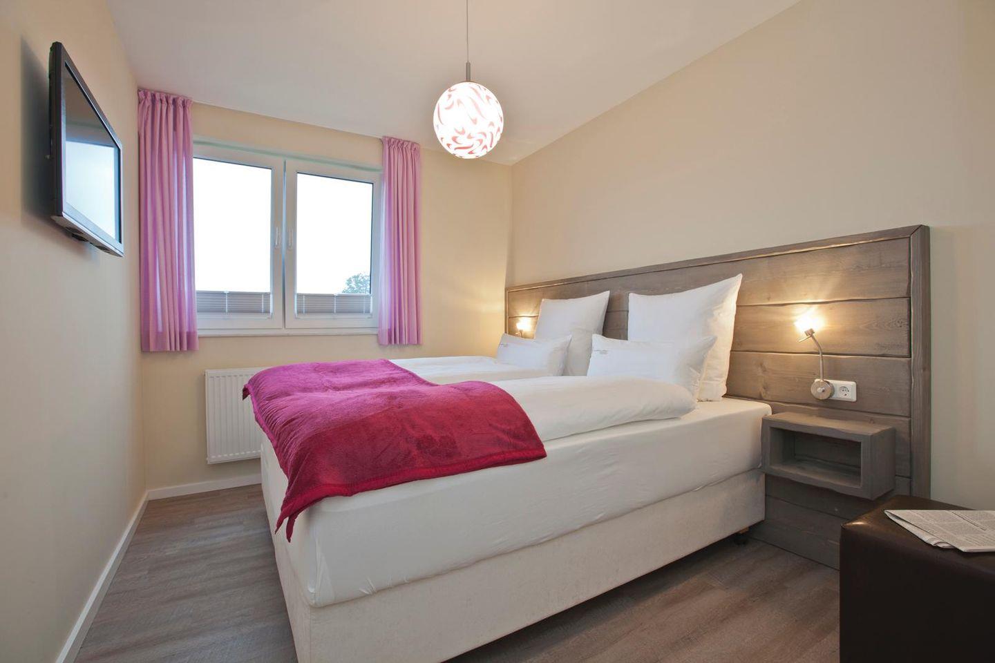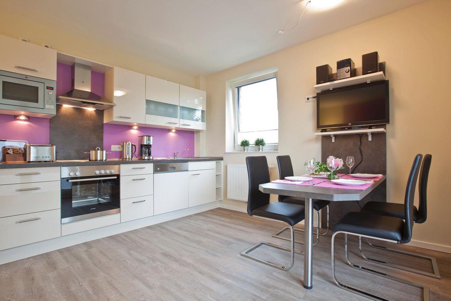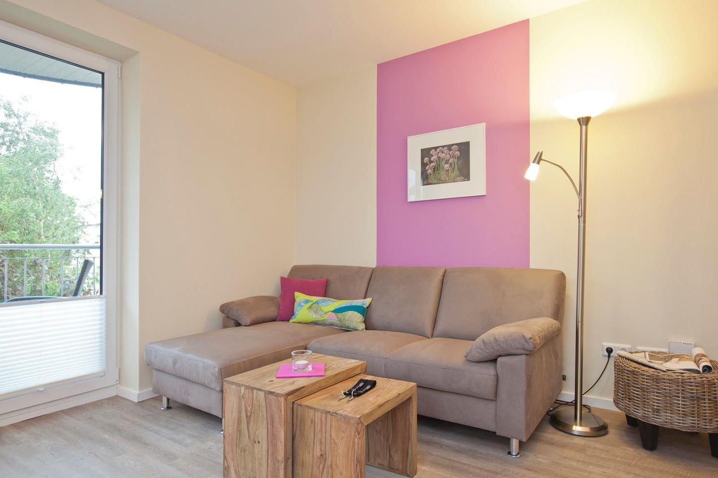 Die Wohnung wurde modern eingerichtet. Insgesamt stehen 2 Schlafzimmer, eines mit einem Doppelbett und eines mit zwei Einzelbetten ausgestattet, zur Verfügung. Das Badezimmer verfügt über eine ebenerdige Dusche. Der Wohnbereich wurde mit einer voll ausgestatteten Küchenzeile sowie einem Essbereich eingerichtet. Vom Wohnbereich kann der Balkon betreten werden.