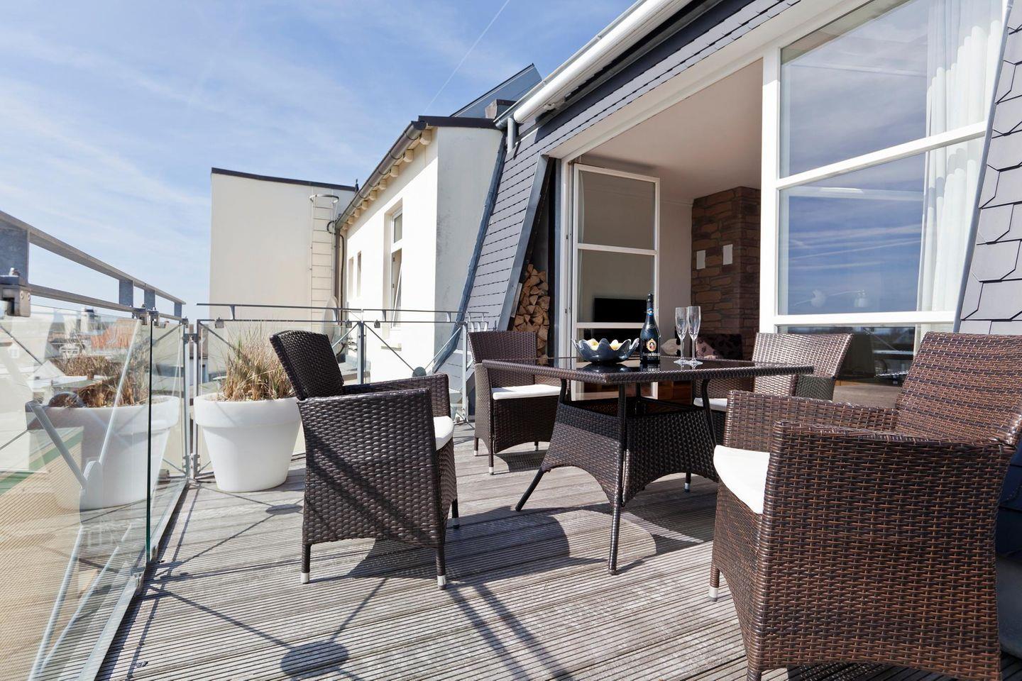 Die Ferienwohnung "Maison Penthouse Nº 5" befindet sich in dem Haus "Villa Vie". Das Haus liegt in der Knyphausenstraße. Die "Maison Penthouse Nº 5" erstreckt sich über 119 Quadratmeter und bietet Platz für bis zu fünf Personen. Das macht sie ideal für Familien oder Gruppen von Freunden. Bis zum Strand sind es nur ca. 250m. Auch einige Restaurants, Cafés und andere Einkaufsmöglichkeiten sind nur wenige Gehminuten entfernt.